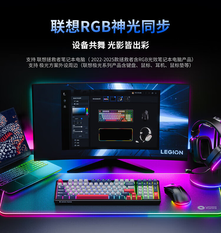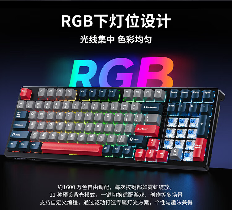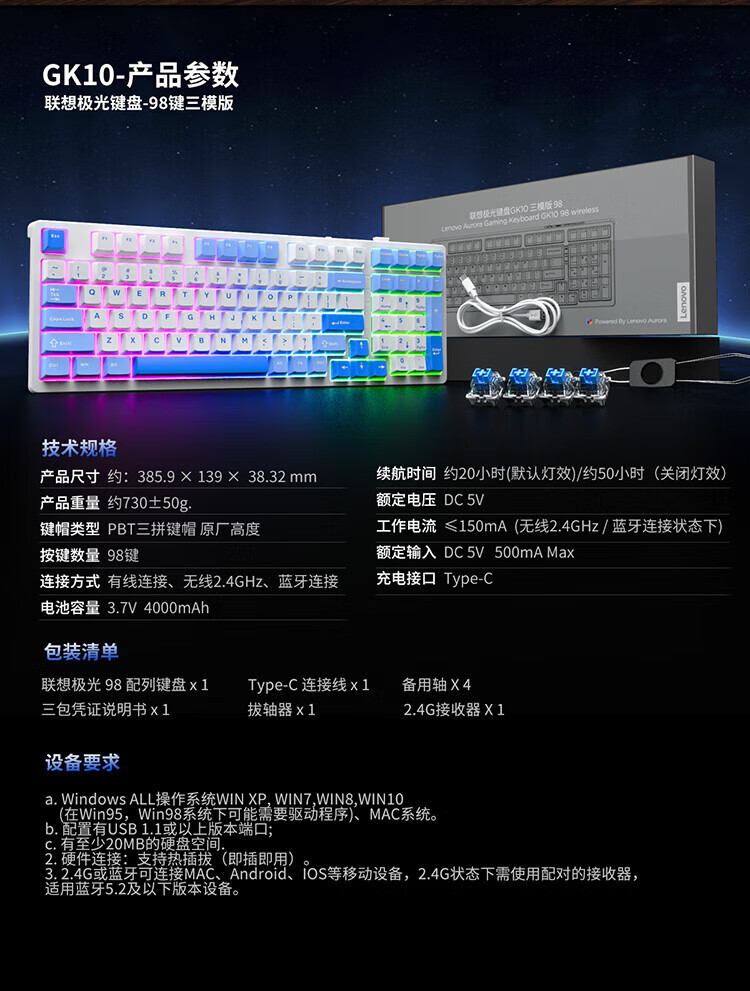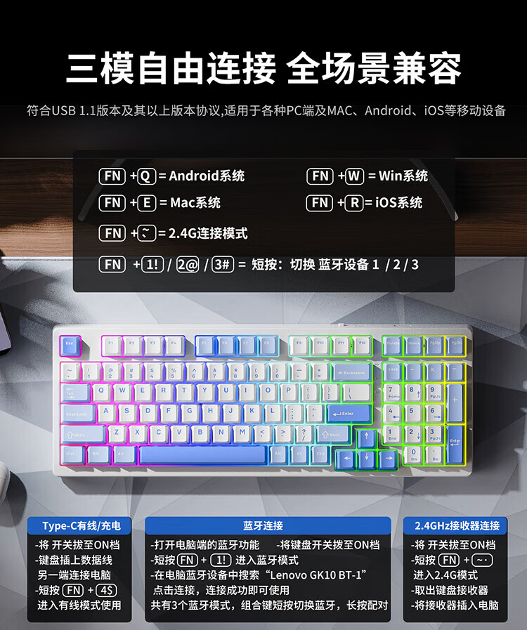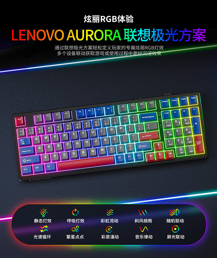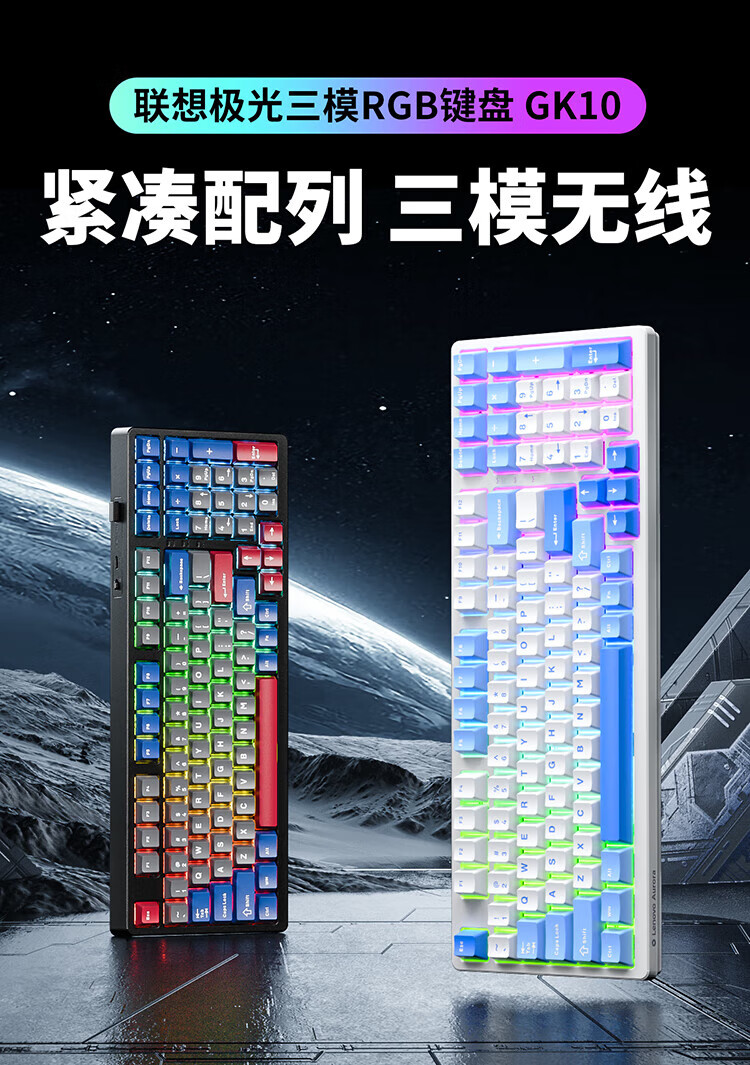Lenovo GK10 wireless Bluetooth three-mode mechanical keyboard RGB backlight full-key hot-swappable computer keyboard for e-sports games Aurora series sky blue green axis