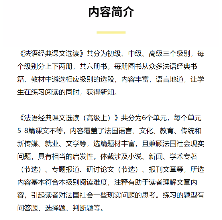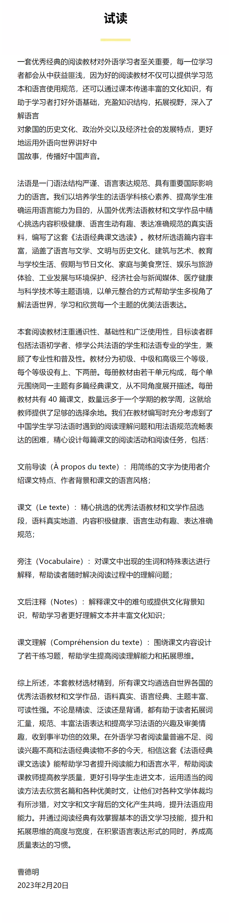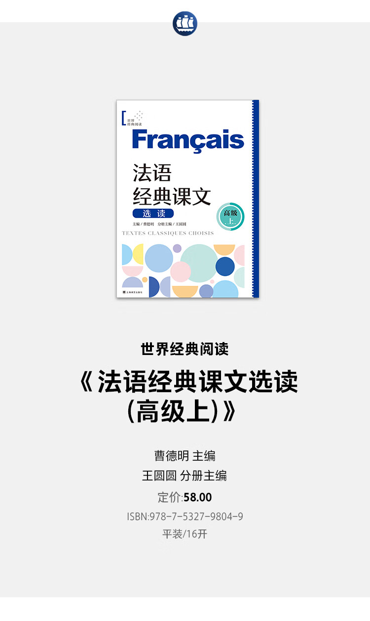 Ausgewählte Lesungen klassischer französischer Texte (fortgeschrittenes Niveau) Weltklassische Lektüre Cao Deming Chefredakteur Wang Yuanyuan Teilband-Herausgeber Ausgewählte klassische französische Texte Französisch lernen Shanghai Translation Publishing House Echt