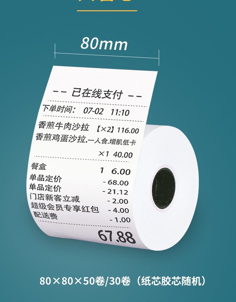 50卷8080收银纸80X80热敏纸80mm 打印纸厨房收银机热小票机小卷纸