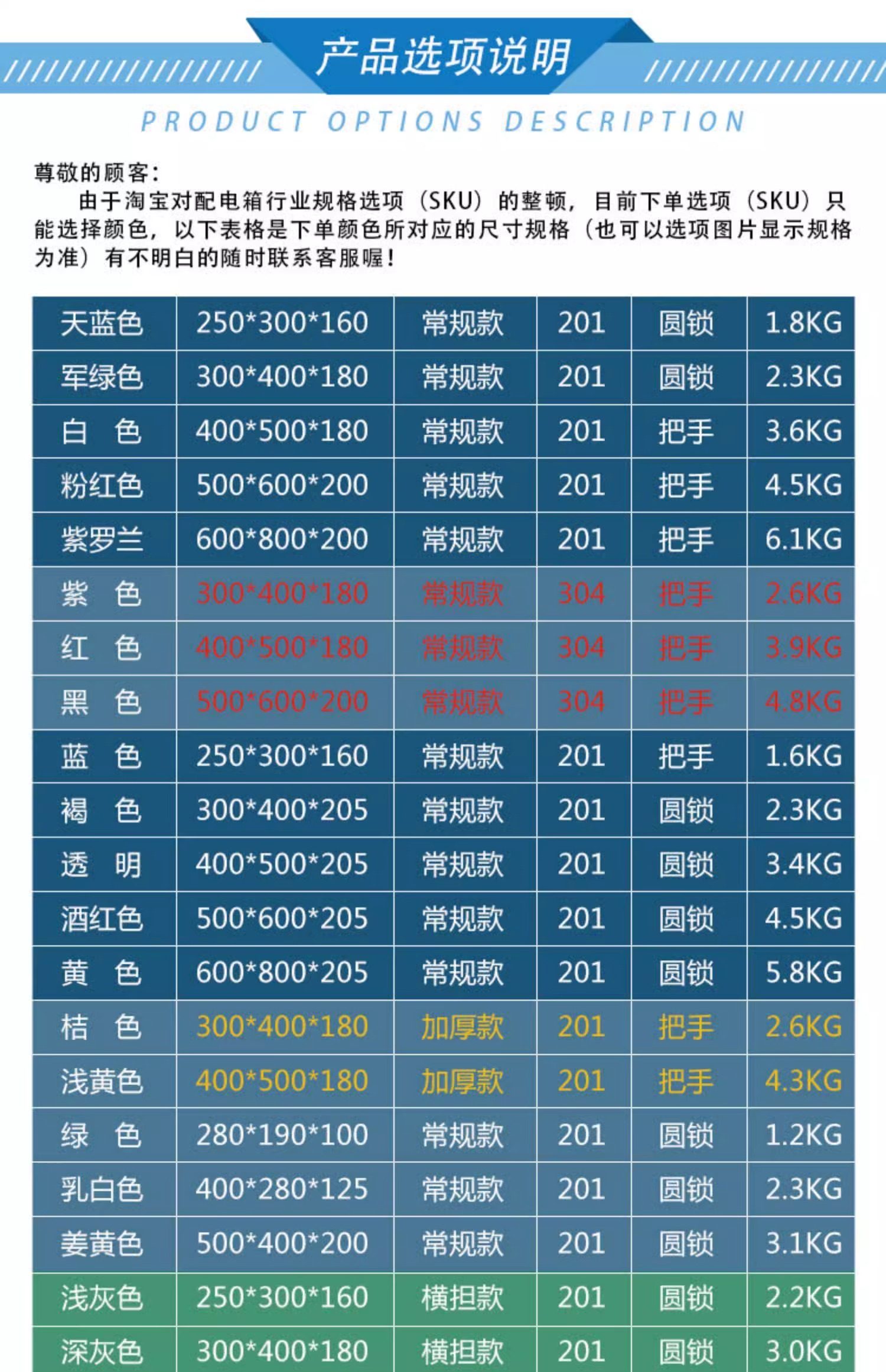 颜色分类 250*300*160,300*400*180,加厚款250*300*160(加厚款),300*400*180(三铰链),400*500*180(圆锁),400*500*180mm(把手锁),500*600*200mm,600*800*200mm,1000*800*200,新能源300*400*170,新能源400*500*250mm,新能源500*600*250mm,新能源500*700*250mm,300*400*180(304材质),400*500*180(304材质),500*600*200(304材质),300*400*180(加厚款),400*500*180(加厚款),300*400*180(横款),400*500*180(横款),500*600*180(横款),300*400*180(特厚款),400*500*180(特厚款),500*600*200(特厚款),300*400*250(特深特厚款),400*500*250(特深特厚款),500*600*250(特深特厚款),250*300*160(抱箍款),300*400*180(抱箍款),400*500*180(抱箍款),500*600*180(抱箍款),室内不锈钢基业箱300*400*200,室内不锈钢基业箱400*500*200,室内不锈钢基业箱500*600*200,1米立柱+400*500*250mm,1米立柱+500*600*250mm,304材质300*400*250(足1mm厚度),304材质400*500*250(足1mm厚度),304材质500*600*250(足1mm厚度),600*800*250(足1mm厚度),400*500*180mm(足1mm厚度),不锈钢300*400*180(带腿),不锈钢400*500*180(带腿),不锈钢500*600*180(带腿),不锈钢100防水箱,101不锈钢配电箱,304材质400*500*250(足1.5mm厚度),304材质500*600*250(足1.5mm厚度),0.8厚横款400*300*170,0.8厚横款500*400*180,250*300*160.,0.8厚横款600*500*180