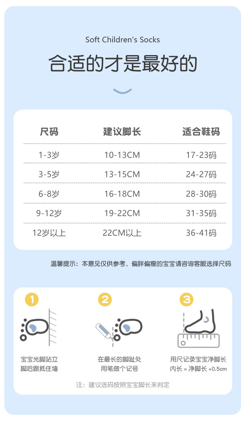 Применимый возраст 1-3 года (размеры обуви 17-22) покупка по размеру обуви.,3-5 лет (размер обуви 23-26), костей и синяков на стопах нет.,6-8 лет (размер обуви 27-29) антипиллинг,9-12 лет (размер обуви 30-34) сетка дышащая.,12 лет и старше (размер обуви 35-41) из чистого хлопка, мягкий.