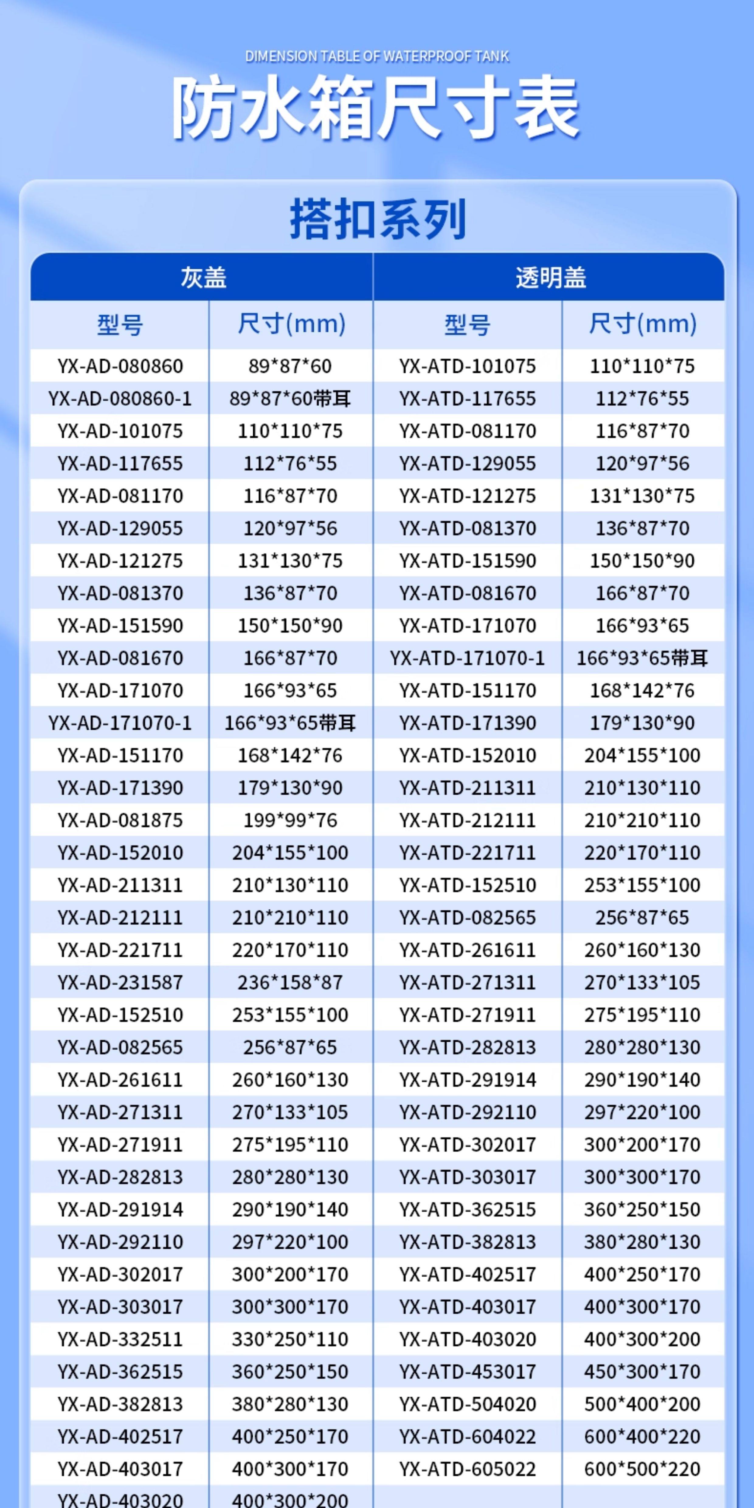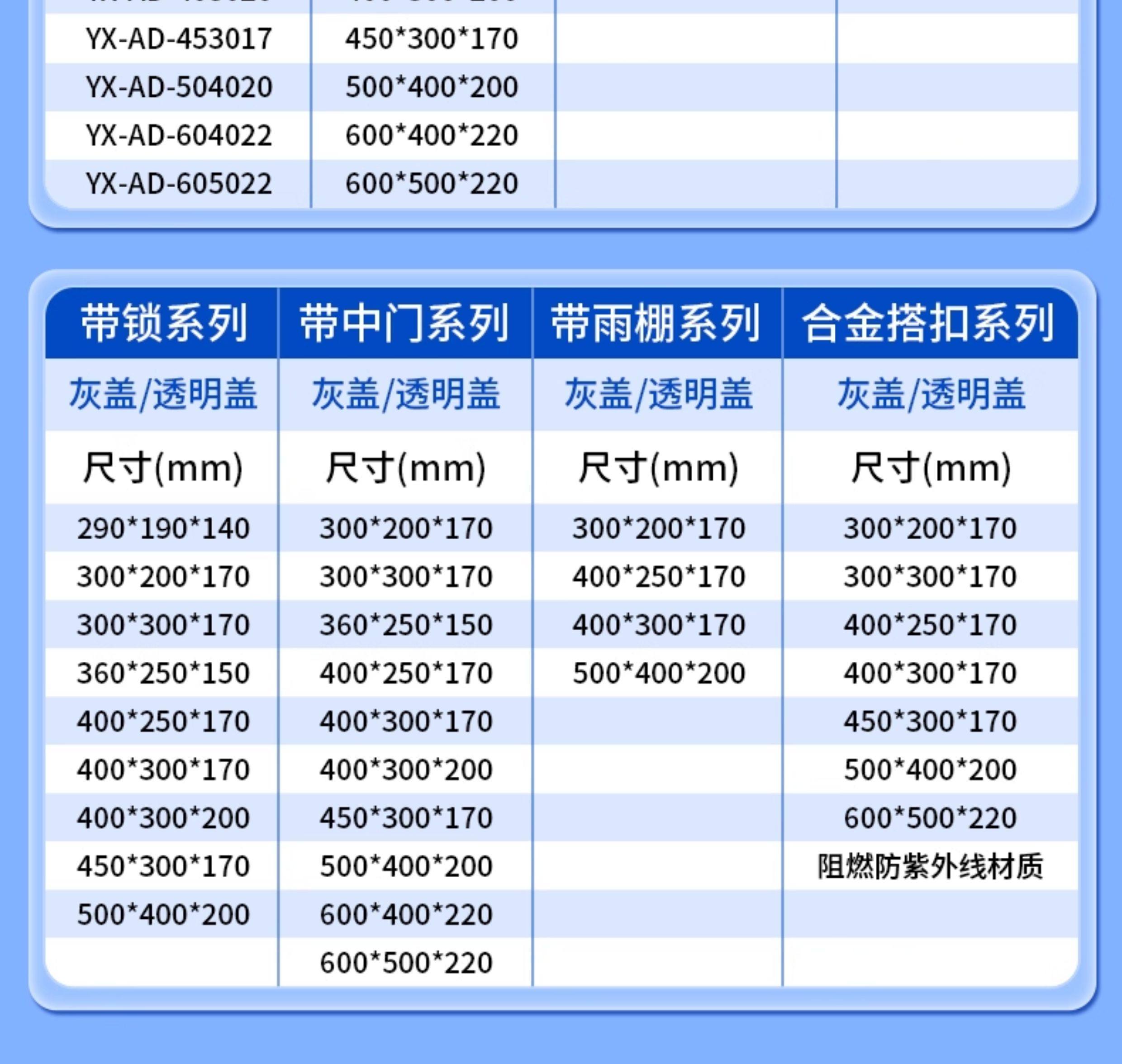 Clasificación de colores Puerta gris 112*76*55mm + placa base,Puerta transparente 112*76*55mm + placa base,Puerta gris 116*89*70mm + placa base,Puerta transparente 116*89*70mm + placa base,Puerta gris 110*110*75mm + placa base,Puerta transparente 110*110*75mm + placa base,Puerta gris 120*97*56mm + placa base,Puerta transparente 120*97*56mm + placa base,Puerta gris 136*89*70mm + placa base,Puerta transparente 136*89*70mm + placa base,Puerta gris 131*130*75mm + placa base,Puerta transparente 131*130*75mm + placa base,Puerta gris 150*150*90mm + placa base,Puerta transparente 150*150*90mm + placa base,Puerta gris 166*89*70mm + placa base,Puerta transparente 166*89*70mm + placa base,Con orejas 166*93*65mm puerta gris + placa base,Puerta gris 166*93*65mm + placa base,Con orejas 166*93*65mm puerta transparente+placa base,Puerta transparente 166*93*65mm + placa base,Con orejas 166*93*65mm puerta transparente sin placa inferior,Puerta transparente de 166*93*65mm sin placa inferior,Puerta gris 168*142*76mm sin placa inferior,Puerta transparente de 168*142*76mm sin placa inferior,Puerta gris 179*130*90mm + placa base,Puerta transparente 179*130*90mm + placa base,Puerta gris 199*99*76mm + placa base,Puerta transparente 199*99*76mm + placa base,Puerta gris 204*155*100mm + placa base,Puerta transparente 204*155*100mm + placa base,Con orejas 210*130*110mm puerta gris + placa base,Puerta gris 210*130*110mm + placa base,Con orejas 210*130*110mm puerta transparente+placa base,Puerta transparente 210*130*110mm + placa base,Puerta gris 210*210*110mm + placa base,Puerta transparente 210*210*110mm + placa base,Puerta transparente de 210*210*110mm sin placa inferior.,Con orejas 220*170*110mm puerta gris + placa base,Puerta gris 220*170*110mm + placa base,Puerta gris 220*170*110mm sin placa inferior,Con orejas 220*170*110mm puerta transparente+placa base,Puerta transparente 220*170*110mm + placa base,Puerta transparente de 220*170*110mm sin placa inferior.,Puerta gris 236*158*87mm + placa base,Puerta transparente 236*158*87mm + placa base,Puerta gris 253*155*100mm + placa base,Puerta transparente 253*155*100mm + placa base.,Puerta gris 256*87*65mm + placa base,Puerta transparente 256*87*65mm + placa base,Puerta gris 260*160*130mm + placa base,Puerta gris 260*160*130mm sin placa inferior,Puerta transparente 260*160*130mm + placa base,Puerta transparente de 260*160*130mm sin placa inferior.,Puerta gris 270*133*105mm + placa base,Puerta transparente 270*133*105mm + placa base.,Puerta gris 275*195*110mm + placa base,Puerta gris 275*195*110mm sin placa inferior,Puerta transparente de 275*195*110mm sin placa inferior.,Puerta gris 280*280*130mm + placa base,Puerta gris 280*280*130mm sin placa inferior,Puerta transparente de 280*280*130mm sin placa inferior.,Puerta gris 290*190*140mm + placa base,Puerta transparente 290*190*140mm + placa base,Puerta gris 297*220*100mm + placa base,Puerta transparente 297*220*100mm + placa base,Puerta gris 300*200*170mm + placa base,Puerta gris 300*200*170mm con toldo + placa base,Puerta transparente 300*200*170mm + placa base,Puerta gris 300*300*170mm + placa base,Puerta transparente 300*300*170mm + placa base,Puerta gris 330*250*110mm + placa base,Puerta transparente 330*250*110mm + placa base,Puerta gris 360*250*150mm + placa base,Puerta transparente 360*250*150mm + placa base,Puerta gris 380*280*130mm sin placa inferior,Puerta transparente de 380*280*130mm sin placa inferior.,Puerta gris 400*250*170mm + placa base,Puerta transparente 400*250*170mm + placa base.,Puerta gris 400*300*170mm + placa base,Puerta gris 400*300*170mm con toldo + placa base,Puerta transparente 400*300*170mm + placa base.,Puerta gris 400*300*200mm + placa base,Puerta transparente 400*300*200mm + placa base.,Puerta gris 450*300*170mm + placa base.,Puerta transparente 450*300*170mm + placa base.,Puerta gris 500*400*200mm + placa base,Puerta gris 500*400*200mm con toldo + placa base,Puerta transparente 500*400*200mm + placa base.,Puerta gris 600*400*220mm + placa base,Puerta gris 600*400*200mm con toldo + placa base,Puerta transparente 600*400*220mm + placa base,Puerta gris 600*500*220mm + placa base,Puerta transparente 600*500*220mm + placa base.,Ignífugo + protección UV 300*200*170mm puerta gris + placa base,Ignífugo + protección UV 300*300*170mm puerta gris + placa base,Ignífugo + protección UV 400*250*170mm puerta gris + placa base,Ignífugo + protección UV 400*300*170mm puerta gris + placa base,Ignífugo + protección UV 400*300*200mm puerta gris + placa base,Ignífugo + protección UV 450*300*170mm puerta gris + placa base,Ignífugo + protección UV 500*400*200mm puerta gris + placa base,Ignífugo + protección UV 600*500*220mm puerta gris + placa base,Con cerradura + hebilla 290*190*140mm tapa gris + placa inferior,Con cerradura + hebilla 290*190*140mm cubierta transparente + placa inferior,Con cerradura + hebilla 300*200*170mm tapa gris + placa inferior,Con cerradura + hebilla 300*200*170mm cubierta transparente + placa inferior,Con cerradura + hebilla 300*300*170mm tapa gris + placa inferior,Con cerradura + hebilla 300*300*170mm cubierta transparente + placa inferior,Con cerradura + hebilla 360*250*150mm tapa gris + placa inferior,Con cerradura + hebilla 360*250*150mm cubierta transparente + placa inferior,Con cerradura + hebilla 400*250*170mm tapa gris + placa inferior,Con cerradura + hebilla 400*250*170mm cubierta transparente + placa inferior,Con cerradura + hebilla 400*300*170mm tapa gris + placa inferior,Con cerradura + hebilla 400*300*170mm cubierta transparente + placa inferior,Con cerradura + hebilla 400*300*200mm tapa gris + placa inferior,Con cerradura + hebilla 400*300*200mm cubierta transparente + placa inferior,Con cerradura + hebilla 450*300*170mm tapa gris + placa inferior,Con cerradura + hebilla 450*300*170mm gris transparente + placa inferior,Con cerradura + hebilla 500*400*200mm tapa gris + placa inferior,Con cerradura + hebilla 500*400*200mm cubierta transparente + placa inferi