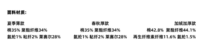 Material Composition Cotton 35%, Polyester Fiber 34%, Lyocell Fiber (Lyocell) 28%, Viscose Fiber (Viscose Fiber) 2%, Polyurethane Elastic Fiber (Spandex) 1%