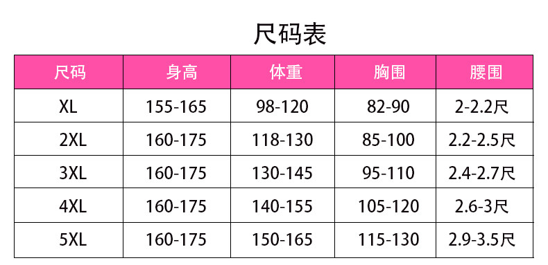 Size XL (Recommended 45-57.5kg),2XL(Recommended 57.5-62.5kg),3XL (Recommended 62.5-70kg),4XL (Recommended 70-75kg),5XL (Recommended 75-82.5kg)