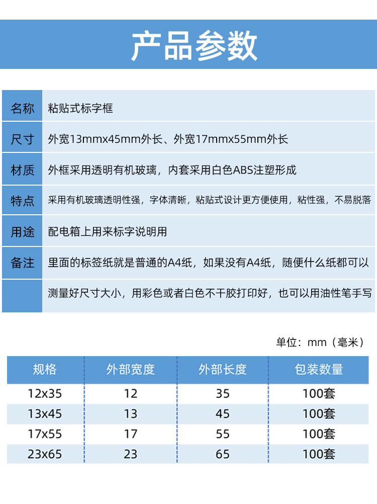 颜色分类 12*35【10套】粘贴式,13*45【10套】粘贴式,17*55【10套】粘贴式,23*65【10套】粘贴式,12*35【100套】粘贴式,13*45【100套】粘贴式,17*55【100套】粘贴式,23*65【100套】粘贴式,卡扣式 13*45【100套】开孔式,卡扣式 17*55【100套】开孔式,M3螺丝脚17*55【100套】孔距40mm,M4螺丝脚17*55【100套】孔距40mm,螺纹卡扣式15*35*3【100套】,12*35标签纸【100张】,13*45标签纸【100张】,17*55标签纸【100张】,23*65标签纸【100张】,单层标识框12*40【100只】开孔3mm,单层标识框18*50【100只】开孔4mm,单层标识框18*60【100只】开孔4mm,单层标识框18*65【100只】开孔4mm,单层标识框26*85【100只】开孔4mm,单层标识框30*80【100只】开孔4mm,单层标识框(不带字)45*85【100只】开孔4mm