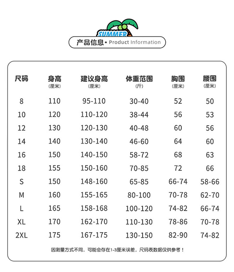 Size Size 10, recommended height 110-120cm, weight 38-44Jin Jin equals 0.5kg,Size 12, recommended height 120-130cm, weight 40-48Jin Jin equals 0.5kg,Size 14, recommended height 130-140cm, weight 46-60Jin Jin equals 0.5kg,Size 16, recommended height 140-150cm, weight 58-72Jin Jin equals 0.5kg,Size 18, recommended height 150-160cm, weight 70-85Jin Jin equals 0.5kg,Size 8, recommended height 100-110cm, weight 30-40Jin Jin equals 0.5kg