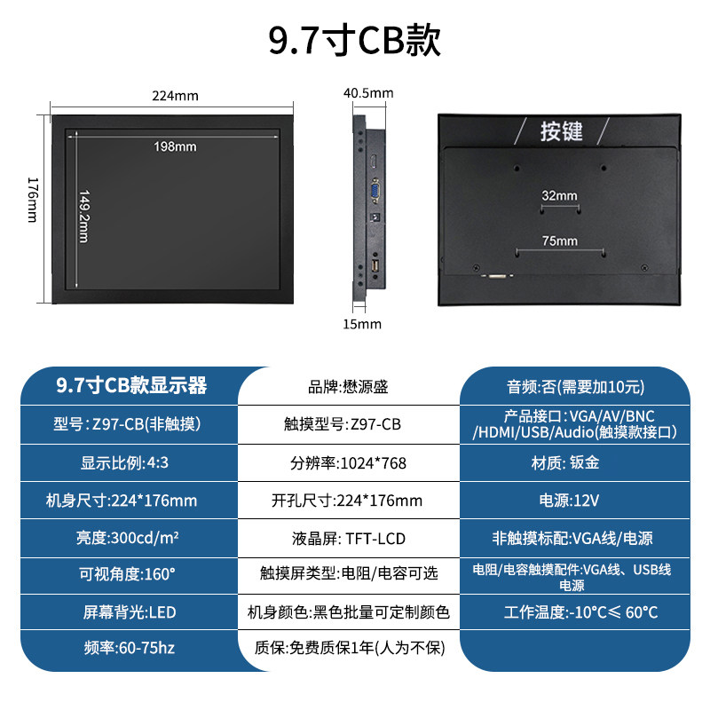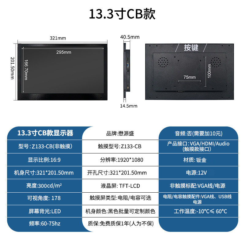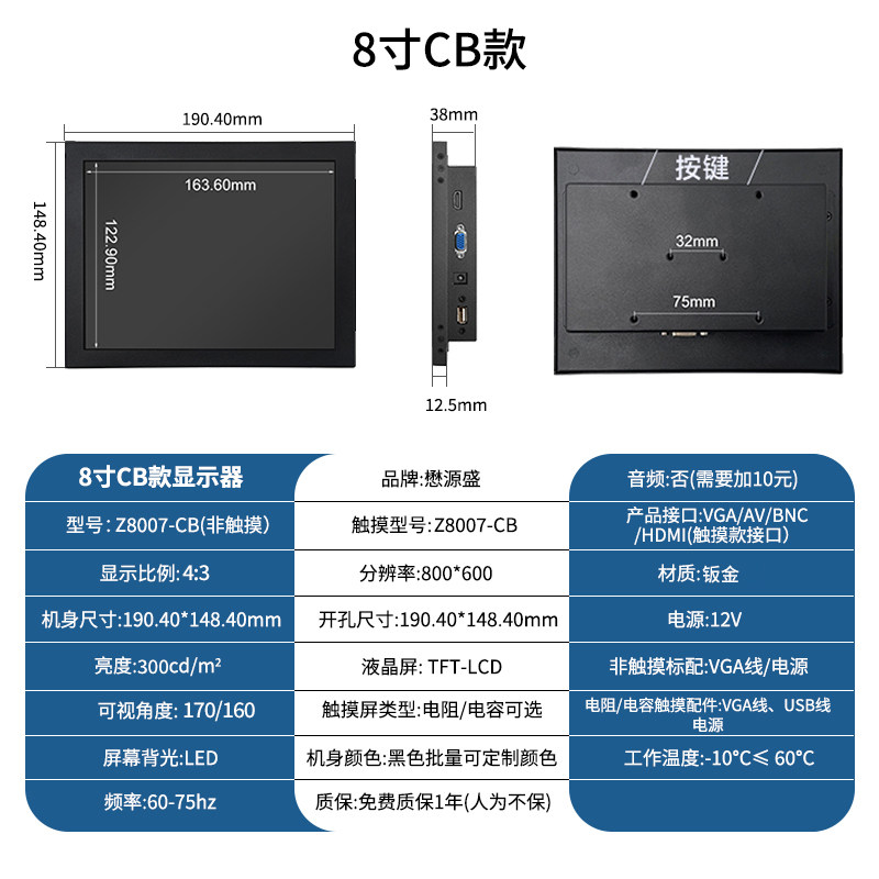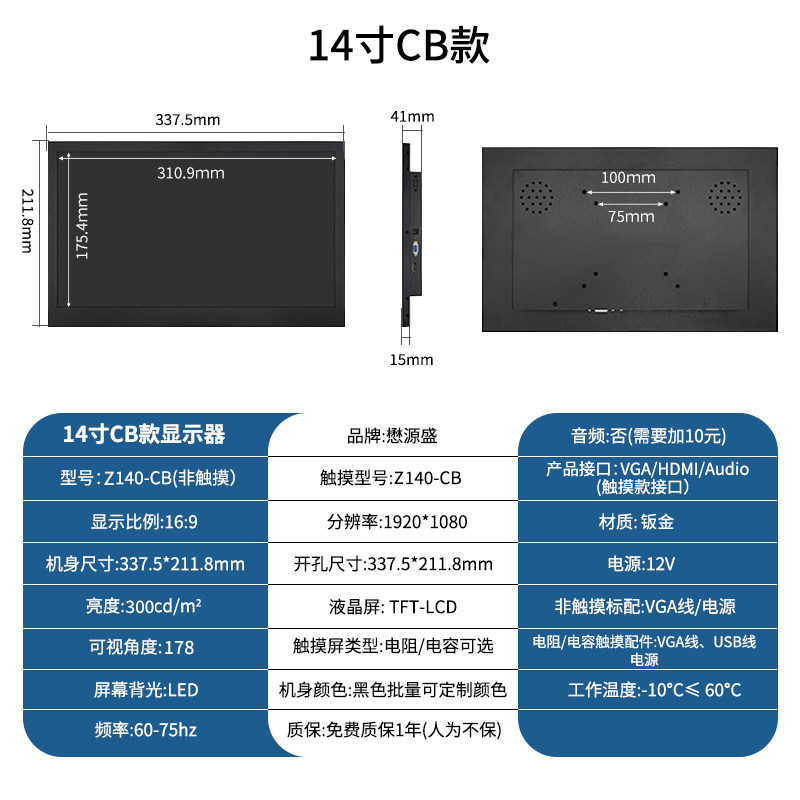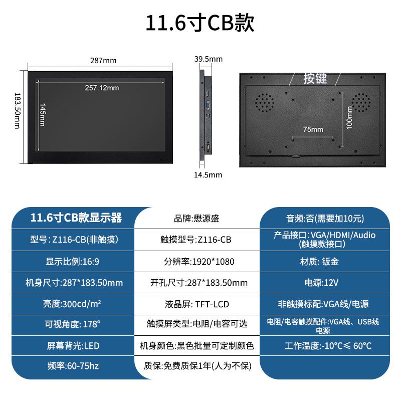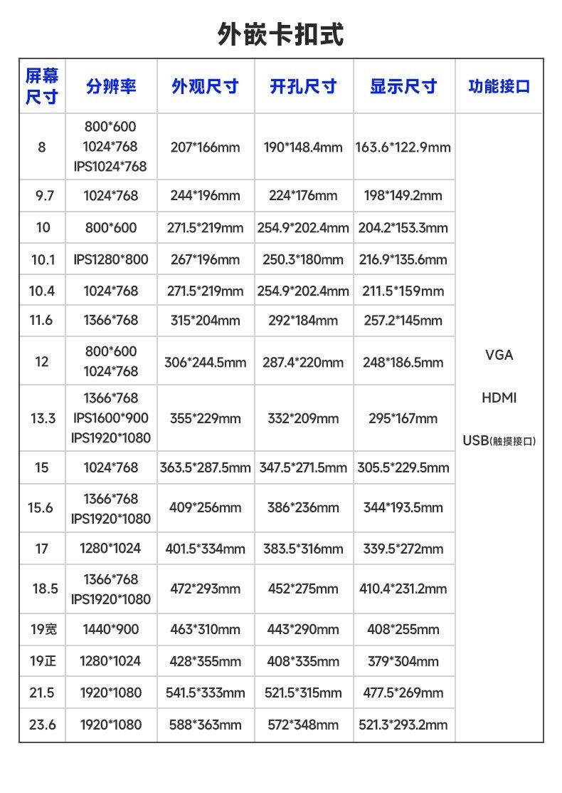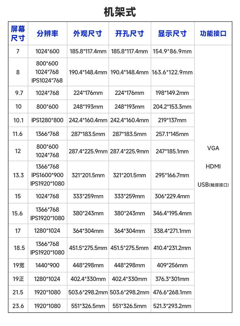 颜色分类 7寸1024*600 IPS,8寸800*600(有HDMI),8寸1024*768(有HDMI),8寸1024*768 IPS,9.7寸1024*768,10寸800*600(工业屏),10.1寸1280*800 IPS,10.4寸1024*768,11.6寸1366*768,11.6寸1366*768 IPS,11.6寸1920*1080 IPS,12寸800*600,12寸1024*768,12.1寸1280*800,13.3寸1366*768,13.3寸1600*900 IPS,13.3寸1920*1080 IPS,14寸1920*1080 IPS,15寸1024*768,15.6寸1366*768,15.6寸1920*1080 IPS,17寸1280*1024,17.3寸1600*900【柜机专用】,17.3寸1920*1080 IPS【柜机专用】,18.5寸1366*768【柜机专用】,18.5寸1920*1080 IPS【柜机专用】,19寸1280*1024【柜机专用】正,19寸1440*900【柜机专用】宽,21.5寸1920*1080,23.6寸1920*1080,27寸1920*1080 IPS