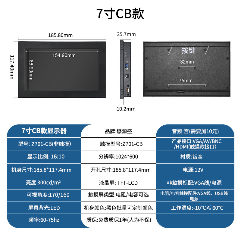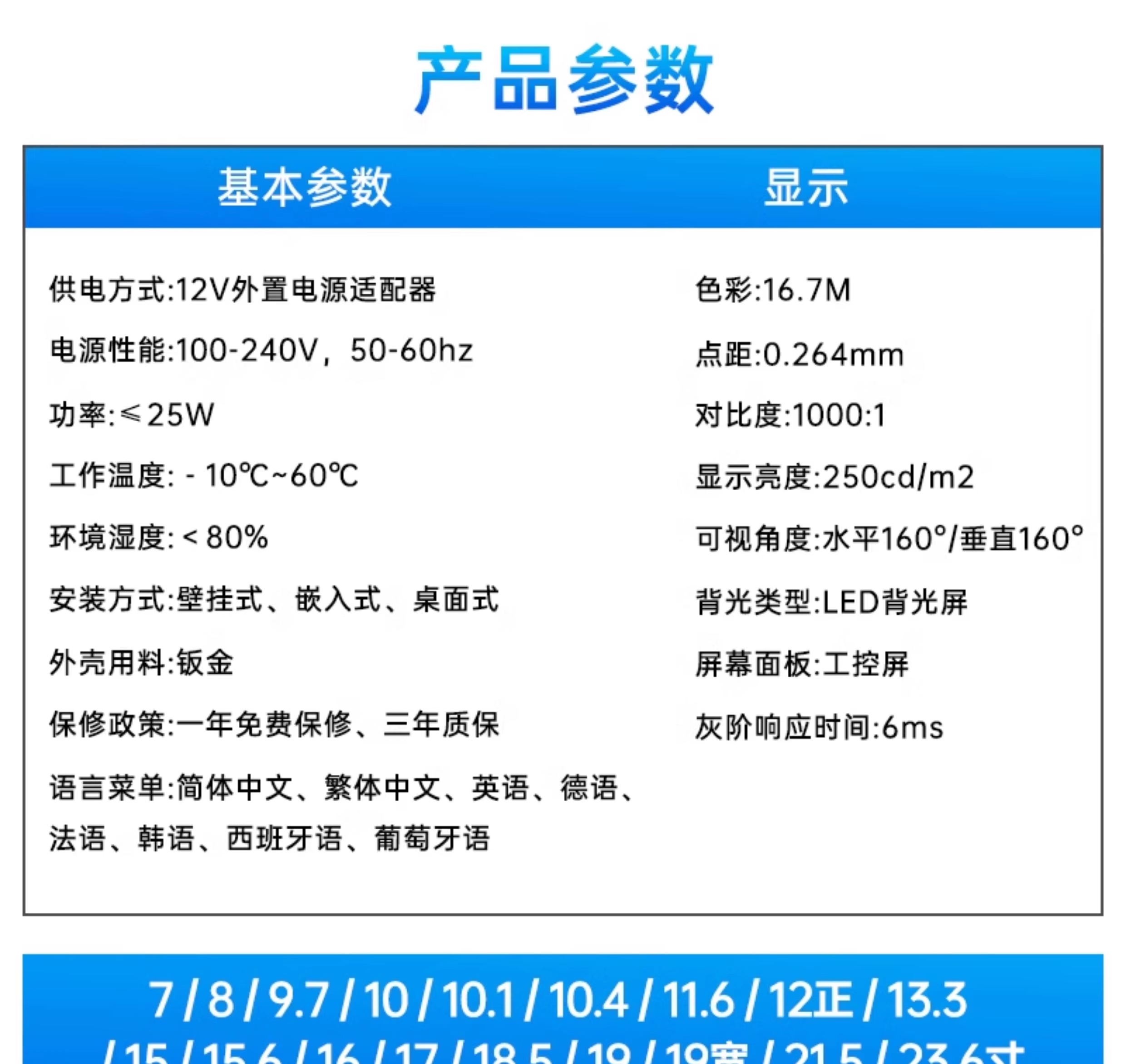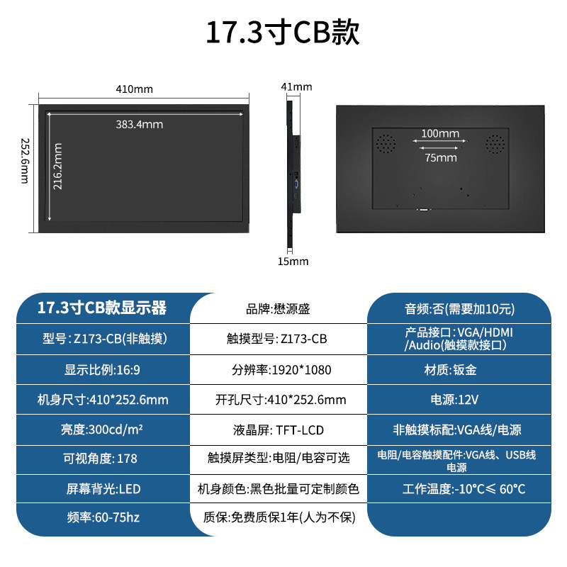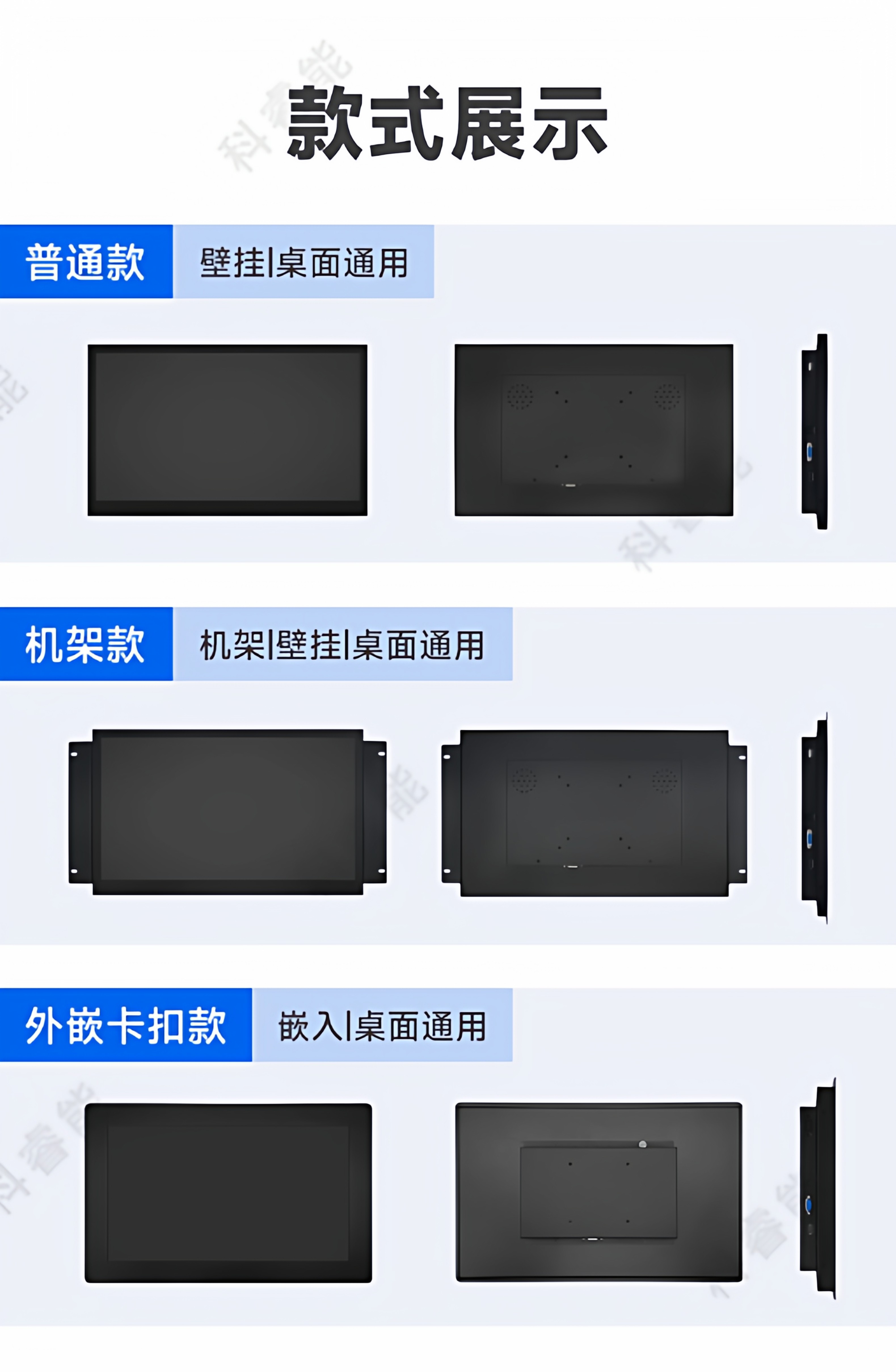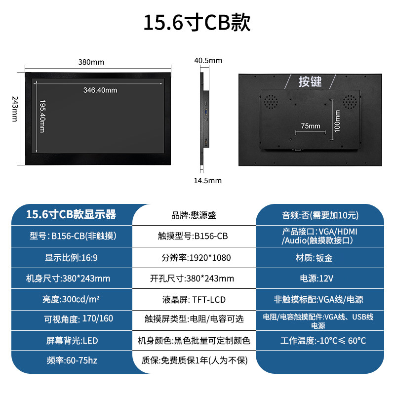 颜色分类 7寸1024*600 IPS,8寸800*600(有HDMI),8寸1024*768(有HDMI),8寸1024*768 IPS,9.7寸1024*768,10寸800*600(工业屏),10.1寸1280*800 IPS,10.4寸1024*768,11.6寸1366*768,11.6寸1366*768 IPS,11.6寸1920*1080 IPS,12寸800*600,12寸1024*768,12.1寸1280*800,13.3寸1366*768,13.3寸1600*900 IPS,13.3寸1920*1080 IPS,14寸1920*1080 IPS,15寸1024*768,15.6寸1366*768,15.6寸1920*1080 IPS,17寸1280*1024,17.3寸1600*900【柜机专用】,17.3寸1920*1080 IPS【柜机专用】,18.5寸1366*768【柜机专用】,18.5寸1920*1080 IPS【柜机专用】,19寸1280*1024【柜机专用】正,19寸1440*900【柜机专用】宽,21.5寸1920*1080,23.6寸1920*1080,27寸1920*1080 IPS