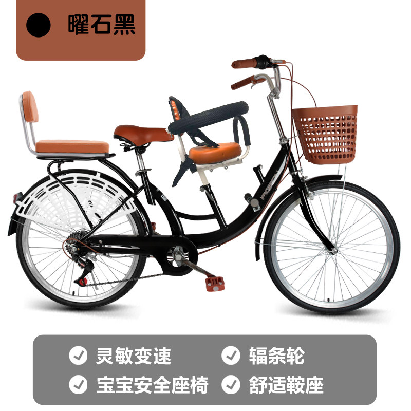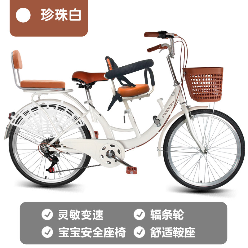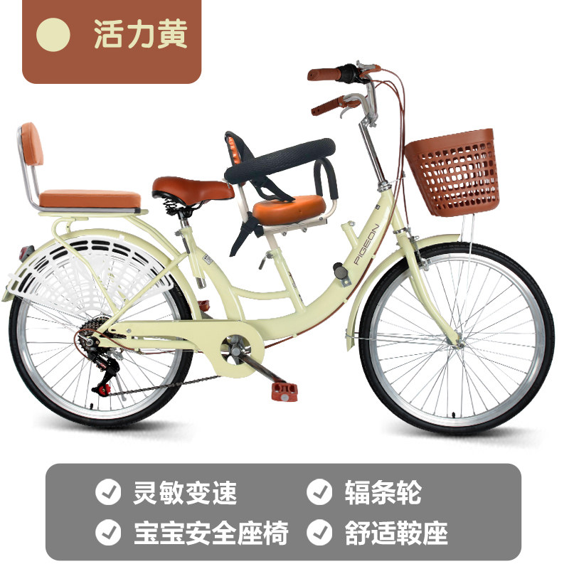 飞鸽牌亲子自行车24寸轻便母子车可带娃三人接送孩子变速通勤单车