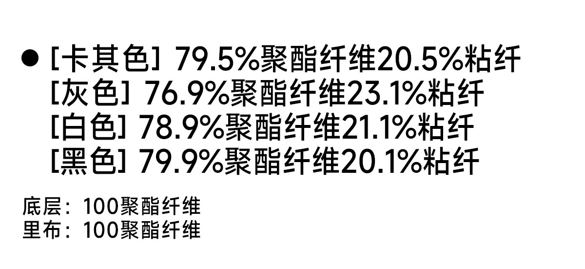 材质成分 聚酯纤维79.5% 粘胶纤维(粘纤)20.5%