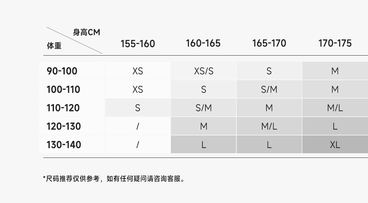 China (cm) 160-165/84-86 165-170 / 88-90 167-172 / 92-96 168-173 / 98-102 170-176 / 106-110