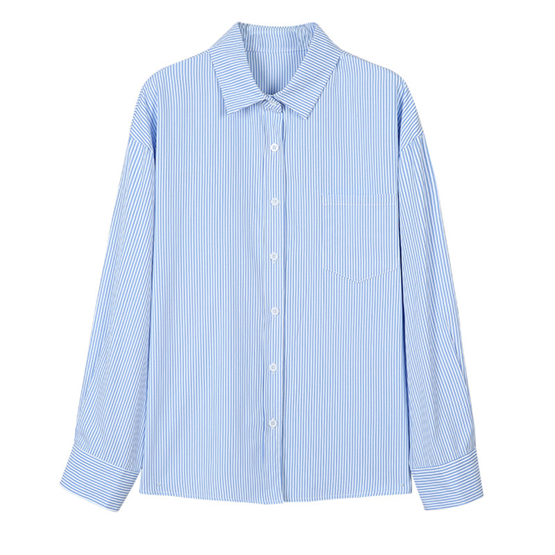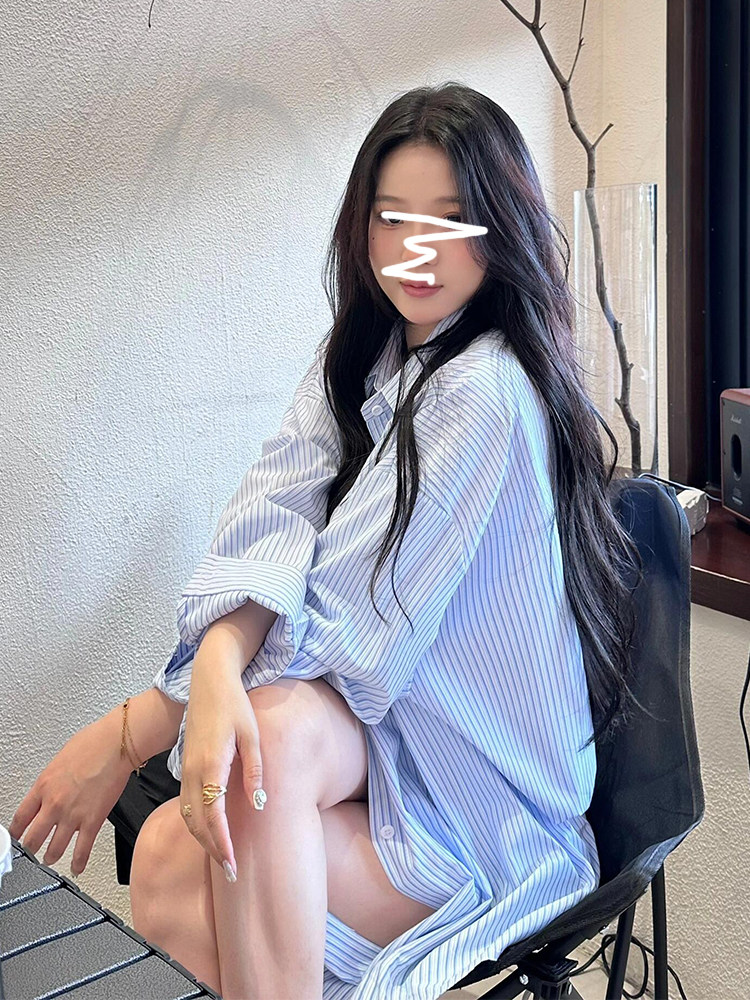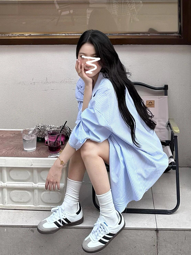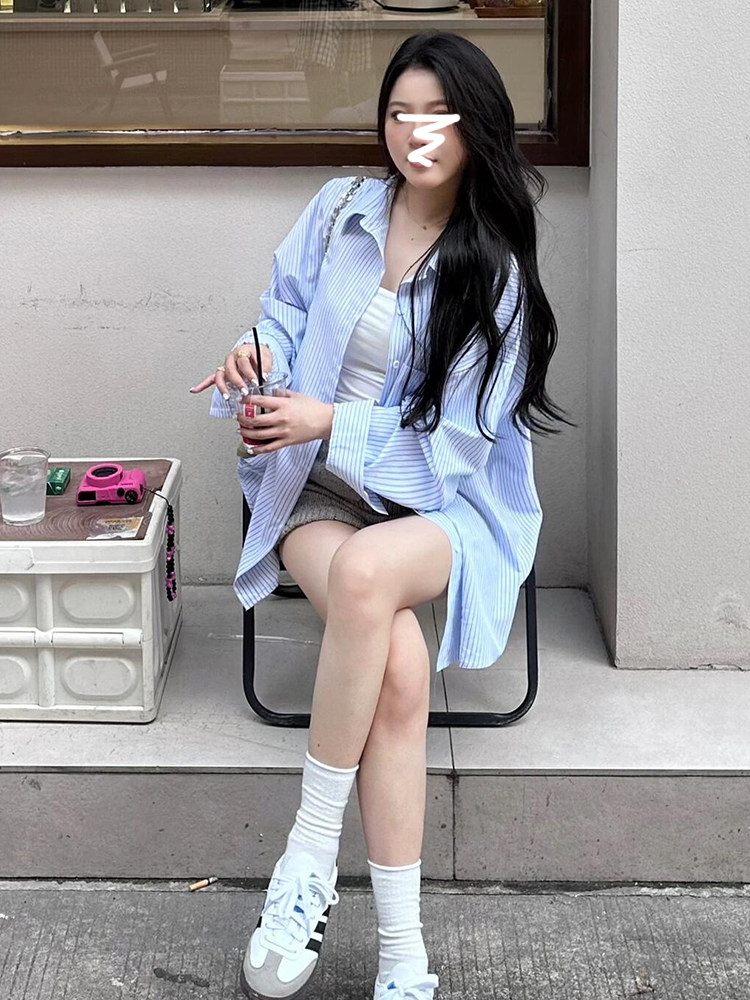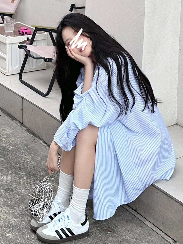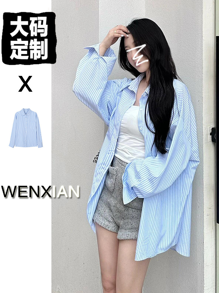 早秋胖女孩蓝色条纹衬衫宽松爬山游玩衬衣上衣显瘦大码长袖遮屁股