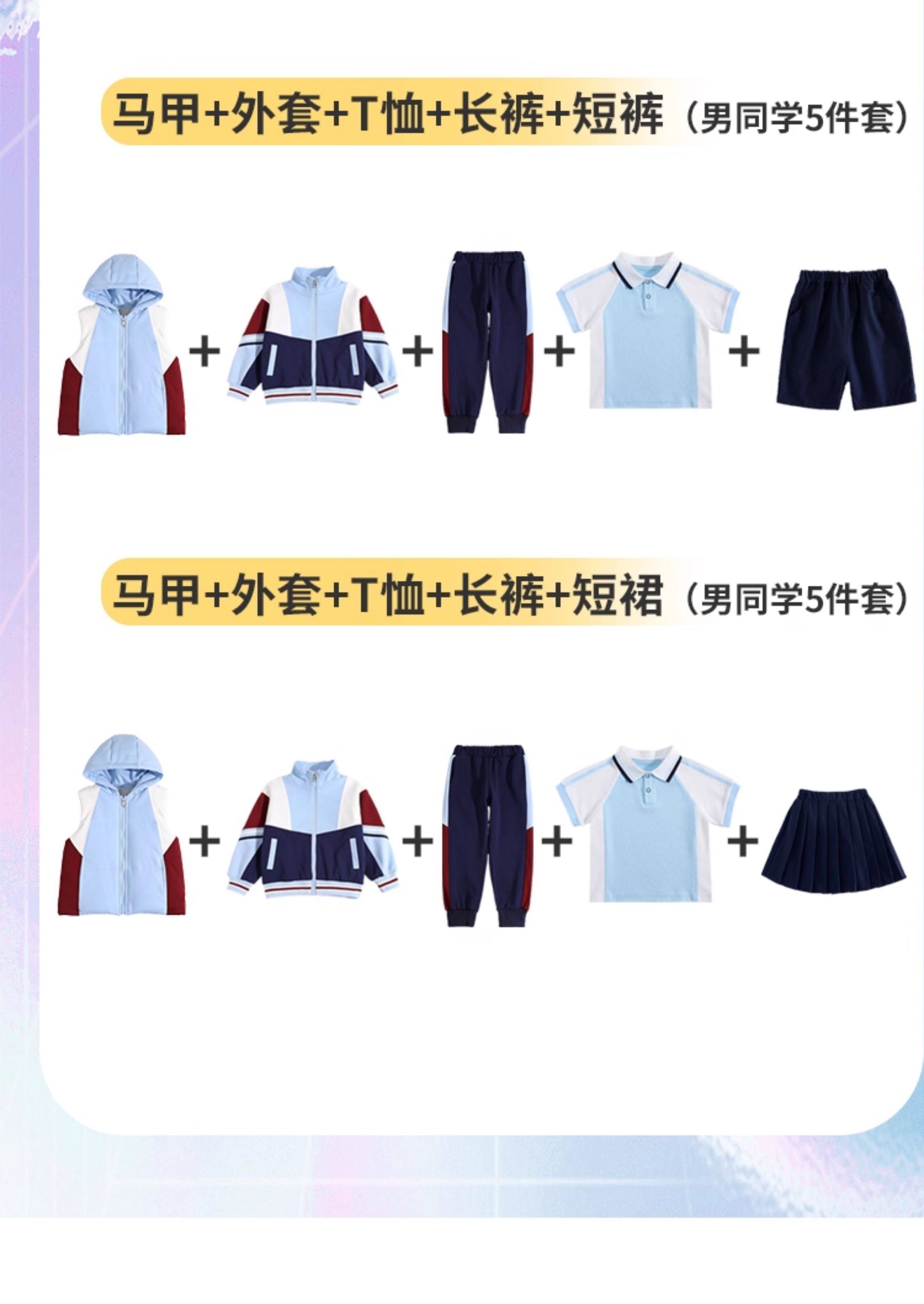 颜色分类 阳光幼儿园 小一班(男),阳光幼儿园 小一班(女),蓝色男款夏季套装,蓝色女款夏季套装,蓝色夏季两件套【短袖+夏季薄长裤】,蓝色春款男女同款两件套,蓝色春款男女同款三件套(外套+短袖+长裤),蓝色春款男款四件套(春两件套+夏装两件套),蓝色春款女款四件套(春两件套+夏装两件套),蓝色春款女款六件套(春两件套+夏装两件套+衬衫+马甲),蓝色冲锋衣两件套,蓝色冲锋衣绒衣三件套,蓝色冲锋衣短袖三件套,蓝色冲锋衣两件套+春两件套,蓝色冲锋衣马甲衬衫四件套,蓝色冲锋衣马甲衬衫五件套,蓝色冲锋衣三件套+春两件套,蓝色冲锋衣两件套+春三件套,蓝色冲锋衣男款六件套,蓝色冲锋衣女款六件套,蓝色冲锋衣男款七件套,蓝色冲锋衣女款七件套,蓝拼红色男女同款两件套,蓝拼红色短袖件套,蓝拼红色马甲三件套,蓝拼红色男款四件套(春两件套+夏装两件套),蓝拼红色女款四件套(春两件套+夏装两件套),蓝拼红色男款五件套(春两件套+夏装两件套+马甲),蓝拼红色女款五件套(春两件套+夏装两件套+马甲),蓝拼红色冲锋衣三件套,蓝拼红色冲锋衣男款七件套,蓝拼红色冲锋衣女款七件套,蓝色男款夏季两件套,蓝色女款夏季两件套