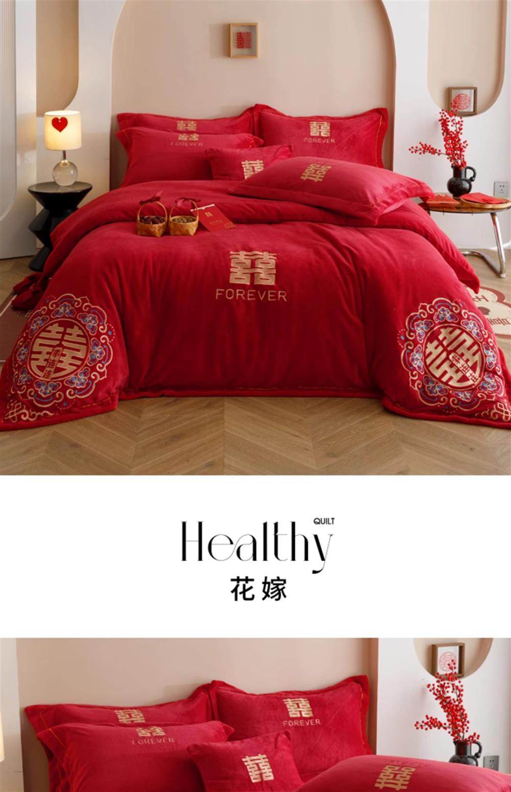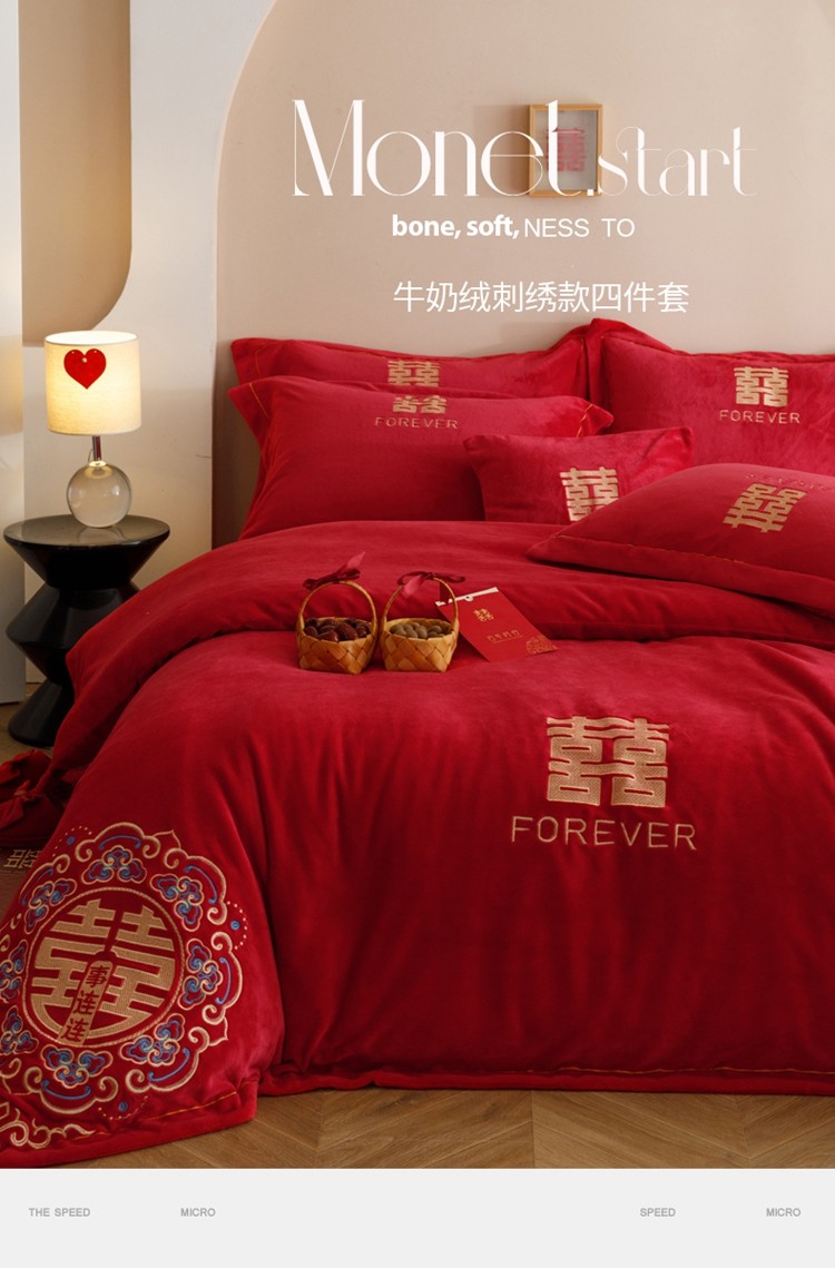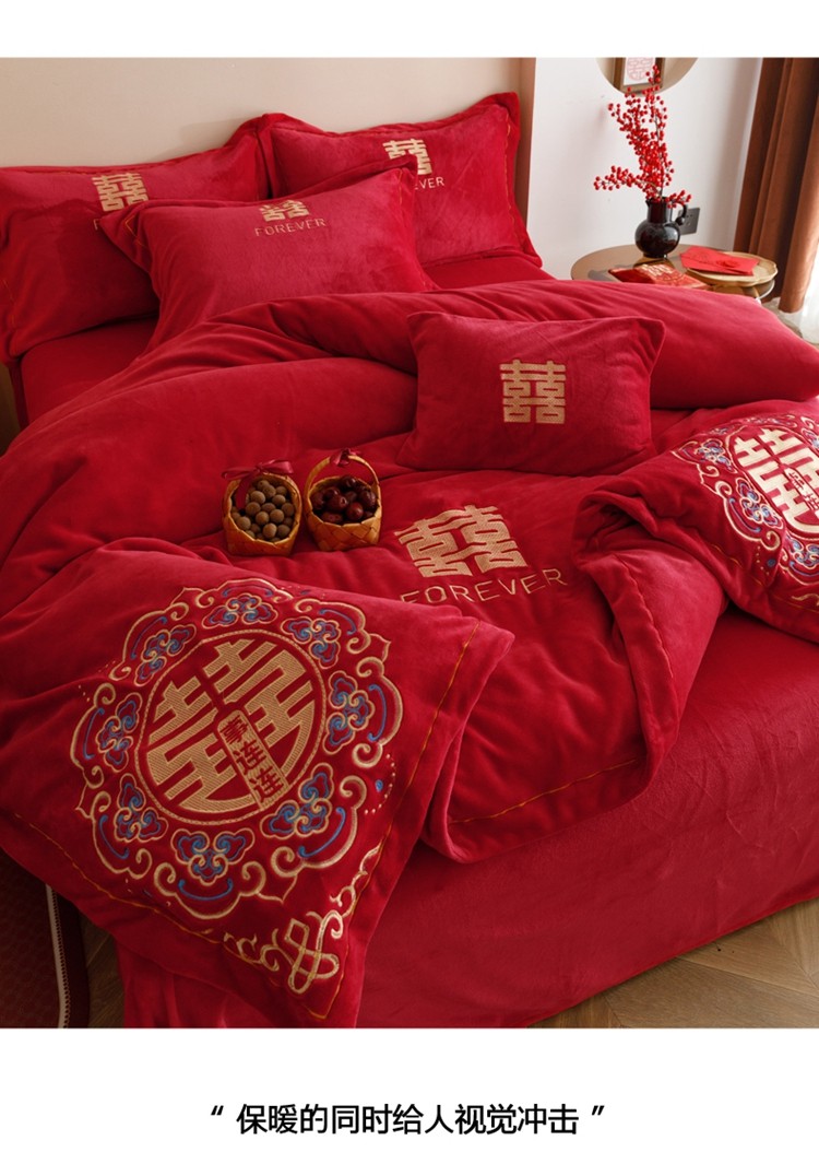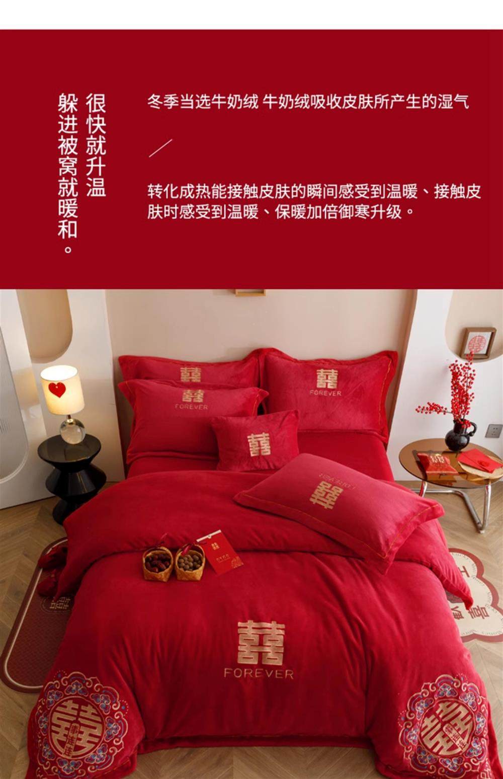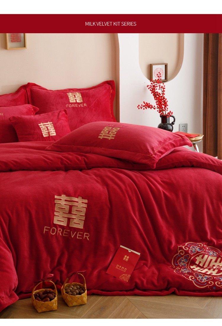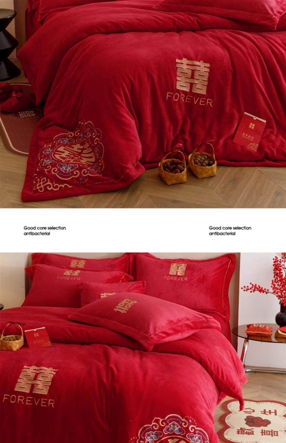 Neues vierteiliges Set aus Milchsamt im chinesischen Stil für Hochzeiten, großes rotes Doppel-Glücksstickerei-Hochzeitsbettbezug, Korallensamtblätter, Winterbettwäsche