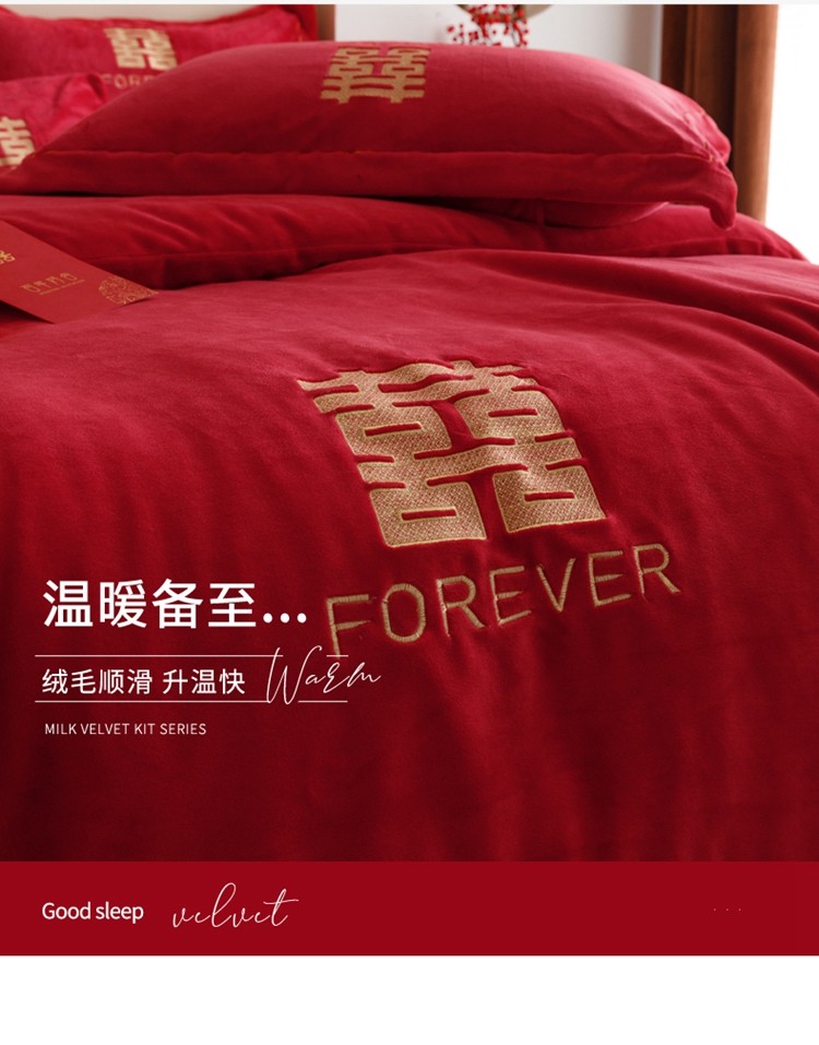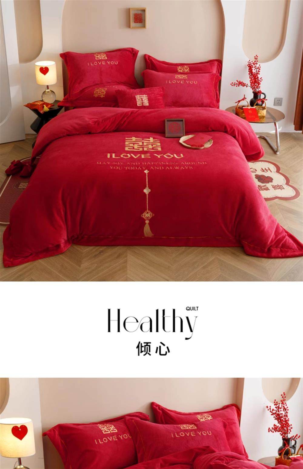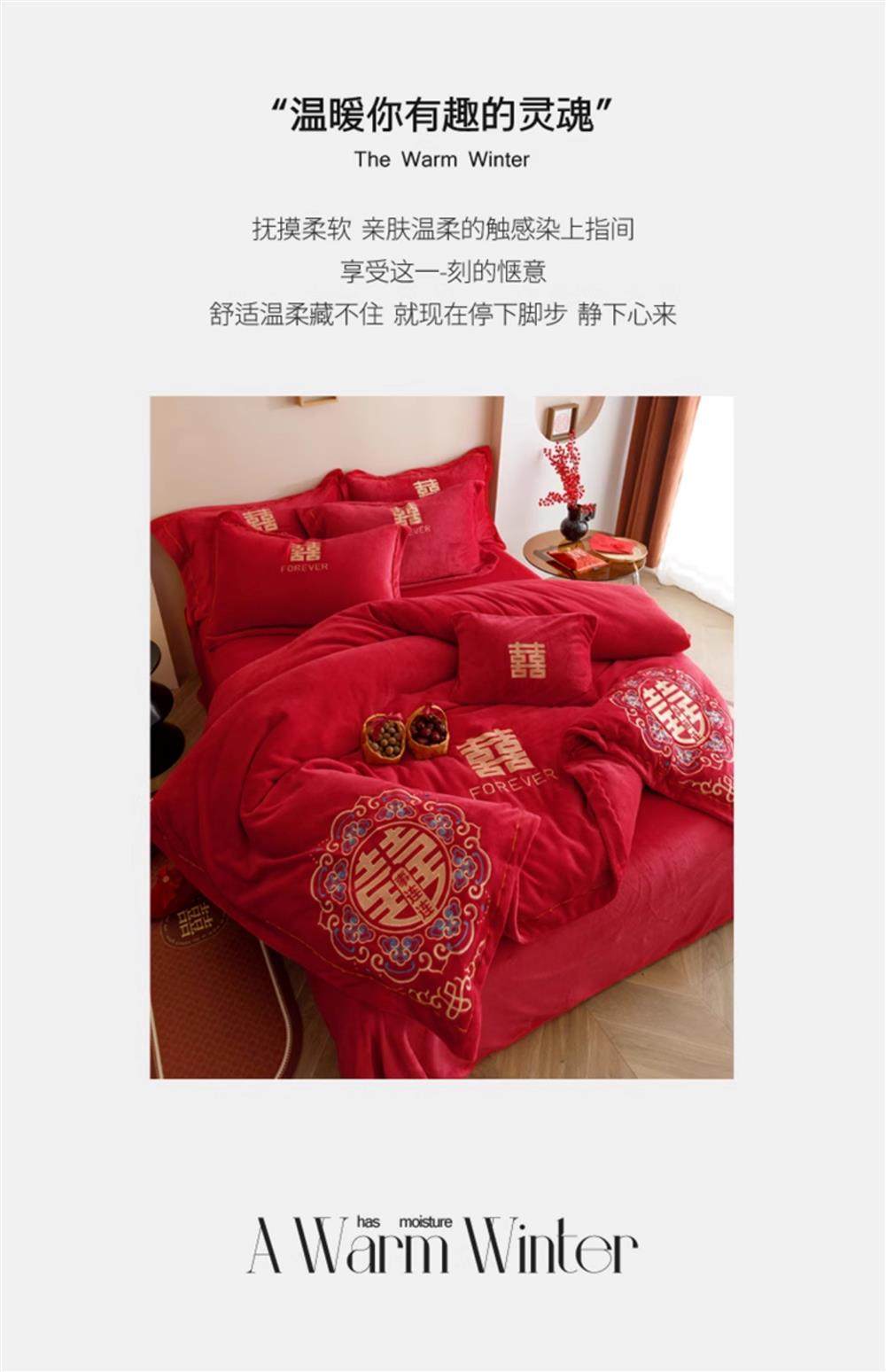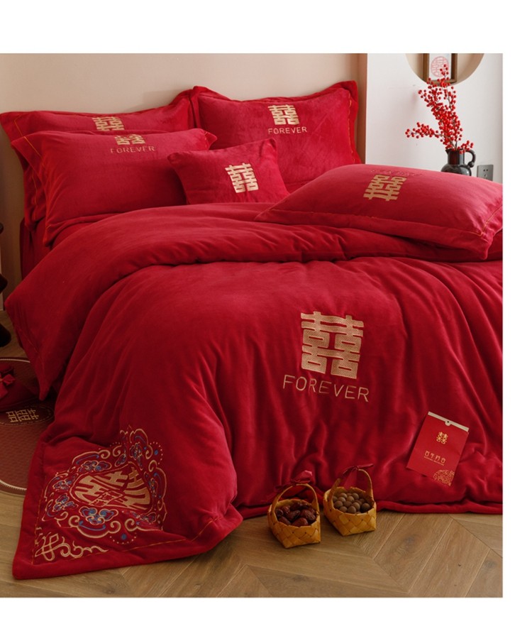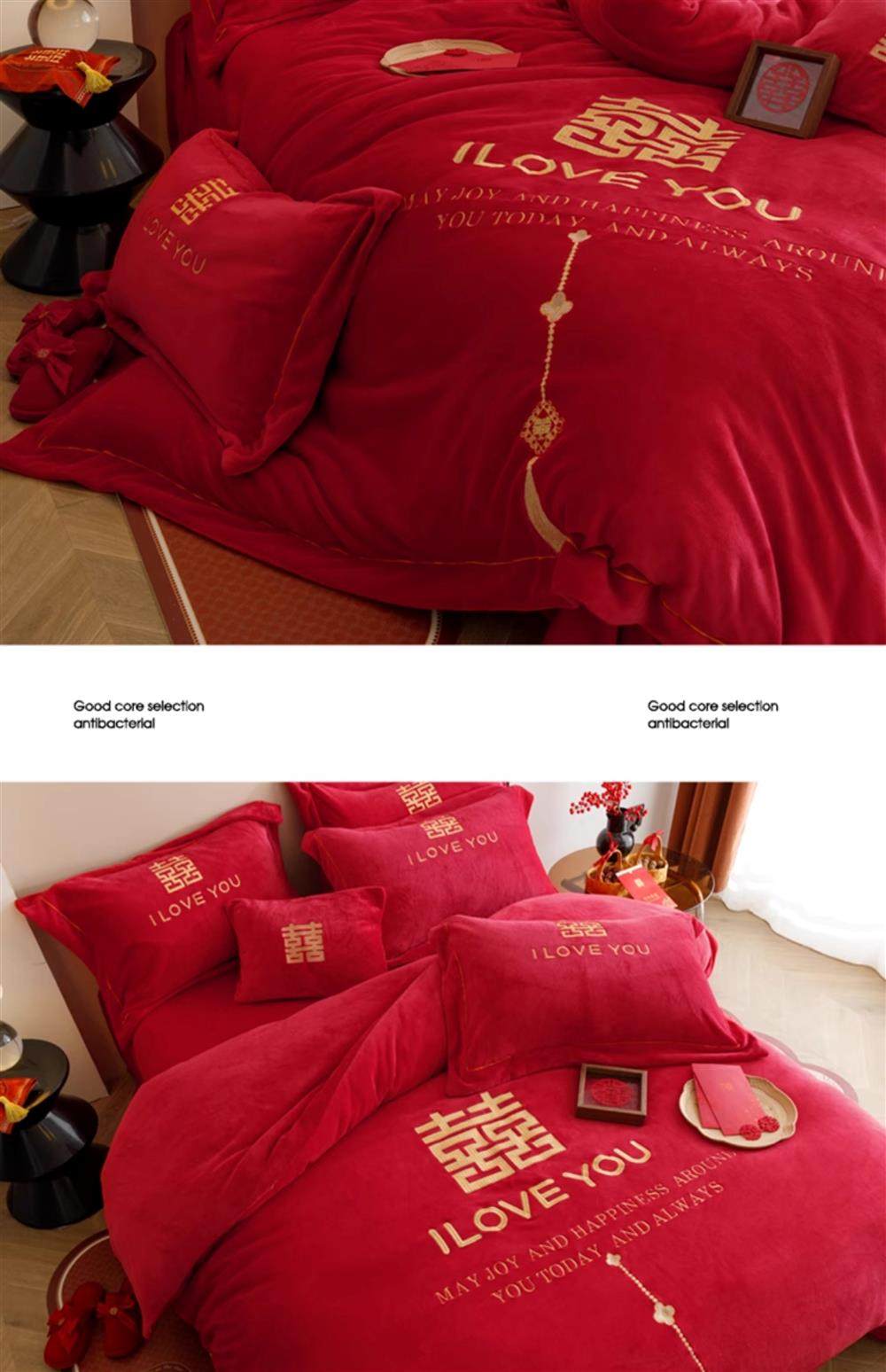 Neues vierteiliges Set aus Milchsamt im chinesischen Stil für Hochzeiten, großes rotes Doppel-Glücksstickerei-Hochzeitsbettbezug, Korallensamtblätter, Winterbettwäsche