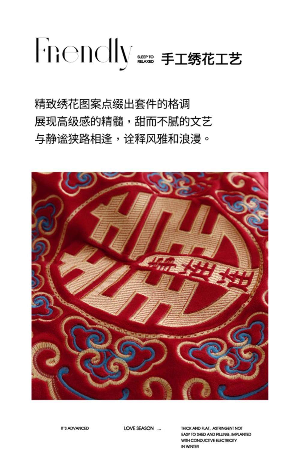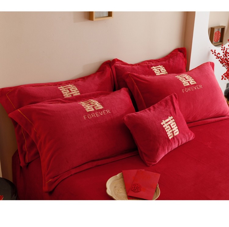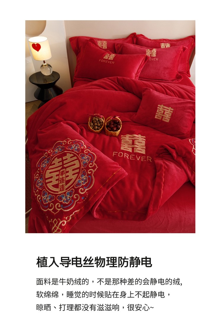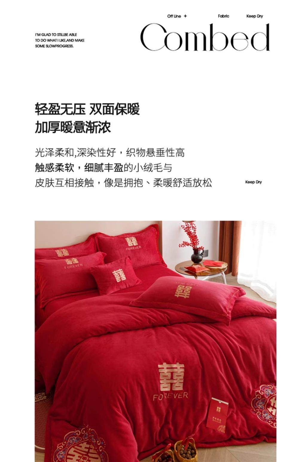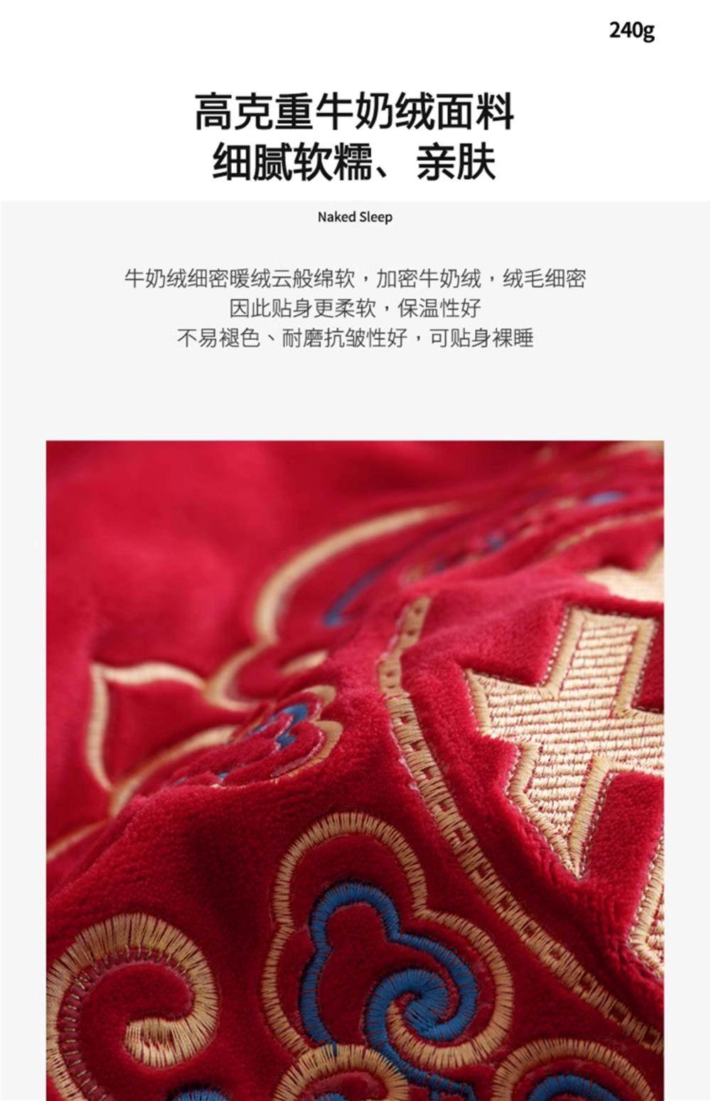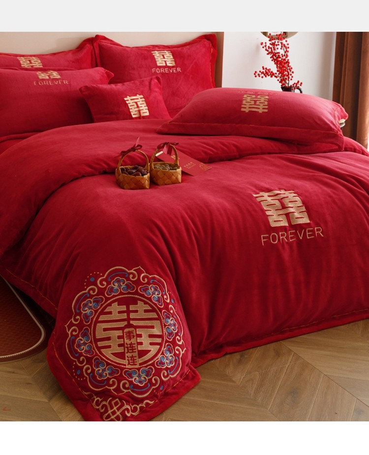 Neues vierteiliges Set aus Milchsamt im chinesischen Stil für Hochzeiten, großes rotes Doppel-Glücksstickerei-Hochzeitsbettbezug, Korallensamtblätter, Winterbettwäsche