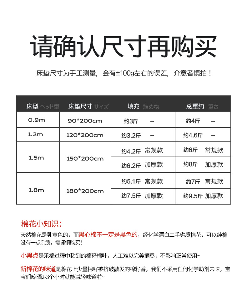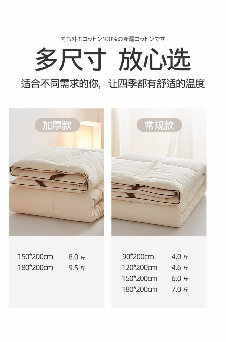 适用床尺寸 90x200cm(4斤)四季款,120x200cm(4.5斤)四季款,150x200cm(6斤)四季款,150x200cm(8斤)加厚款,180x200cm(7斤)四季款,180x200cm(9.5斤)加厚款