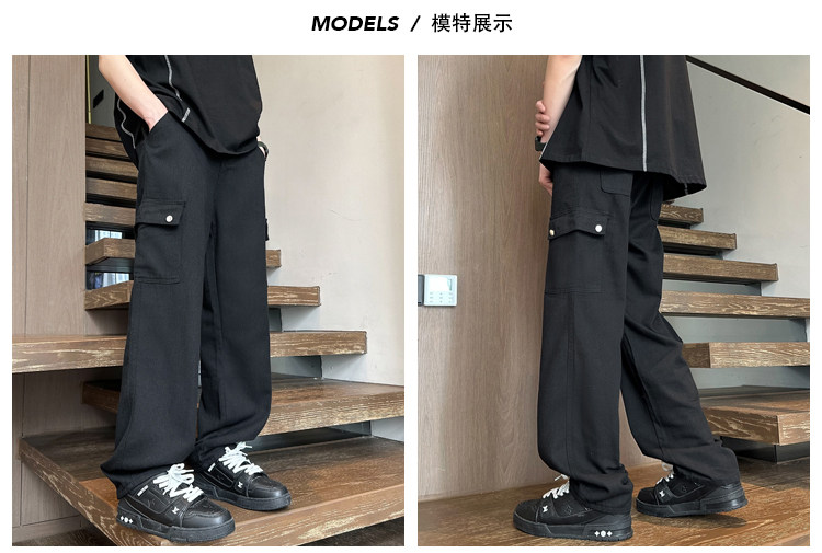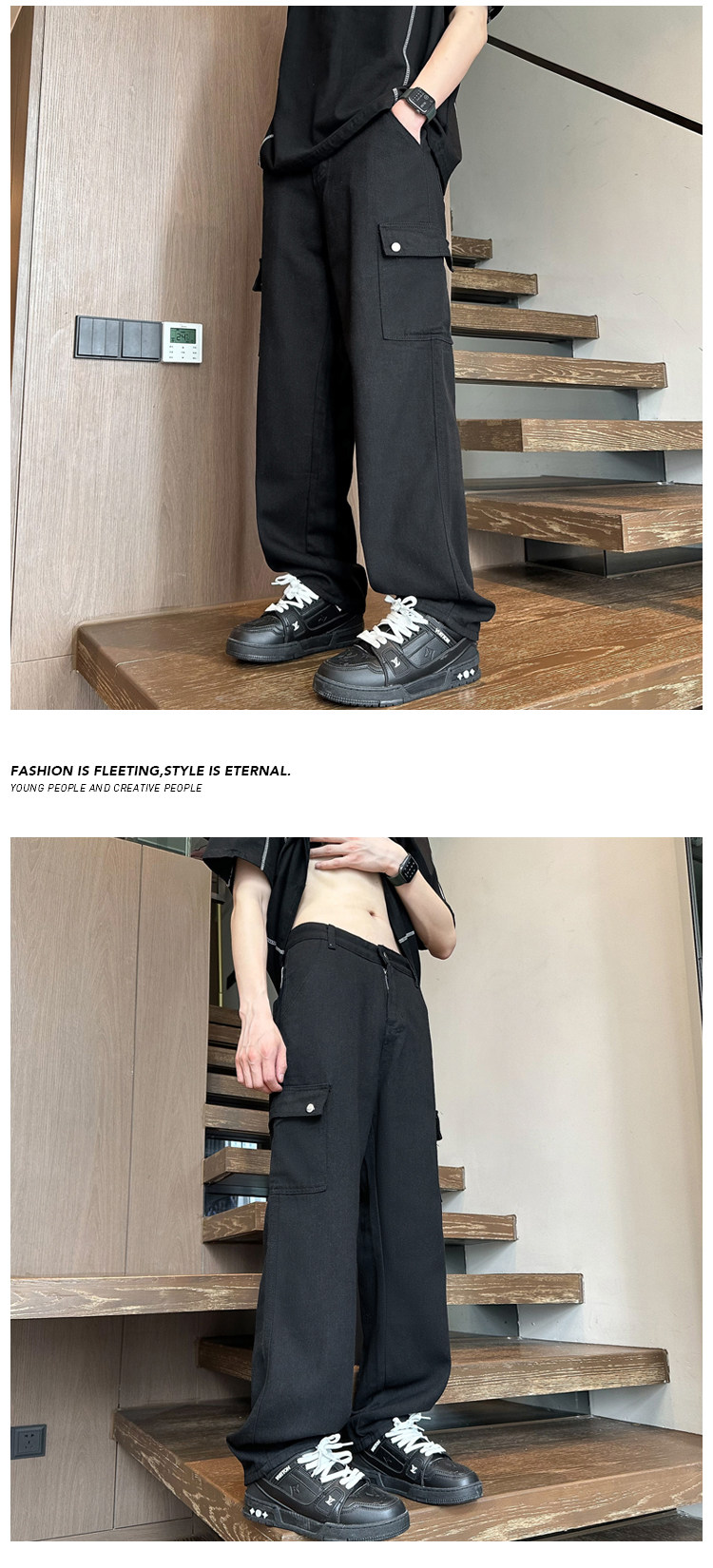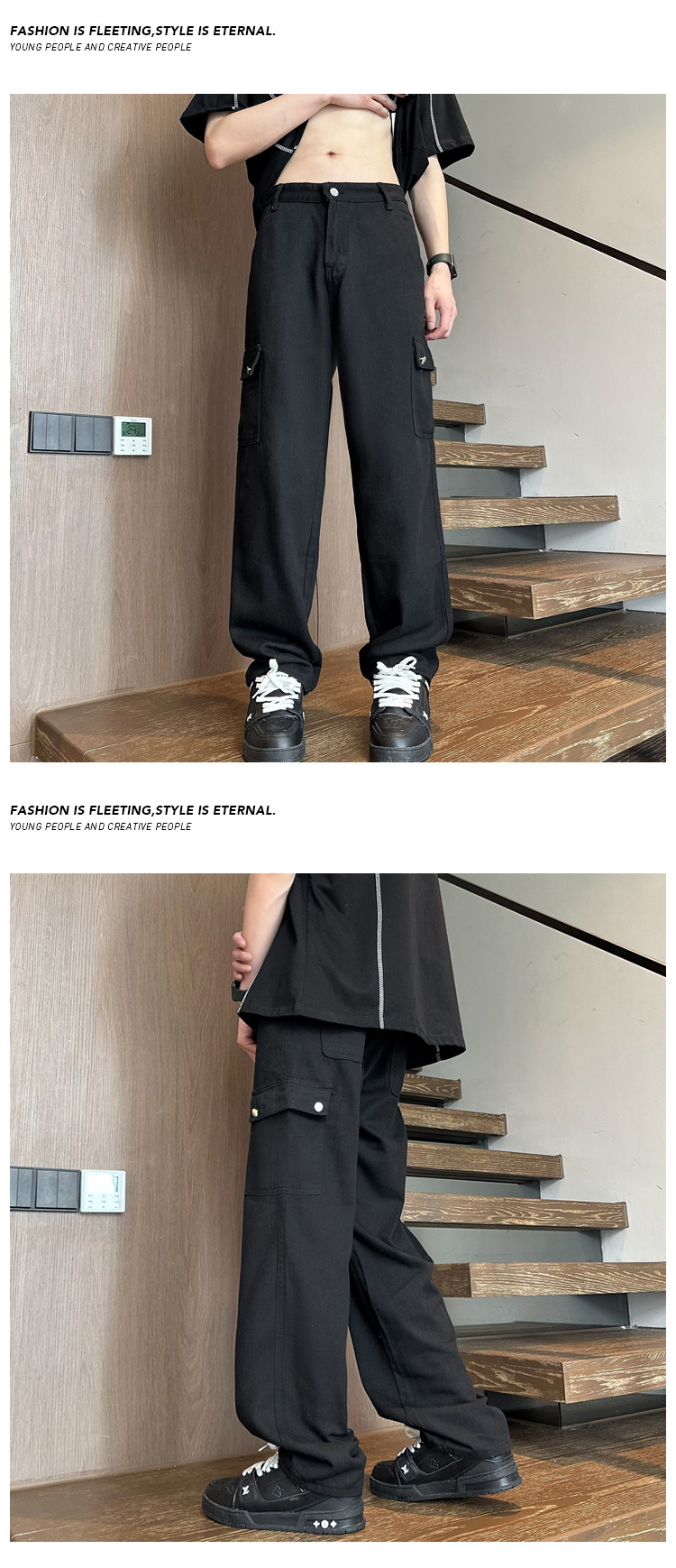 Black Workwear Jeans for Men, Summer Style with Large Pockets, Straight-Leg Pants, Trendy Brand, Loose Wide-Leg Casual Long Pants