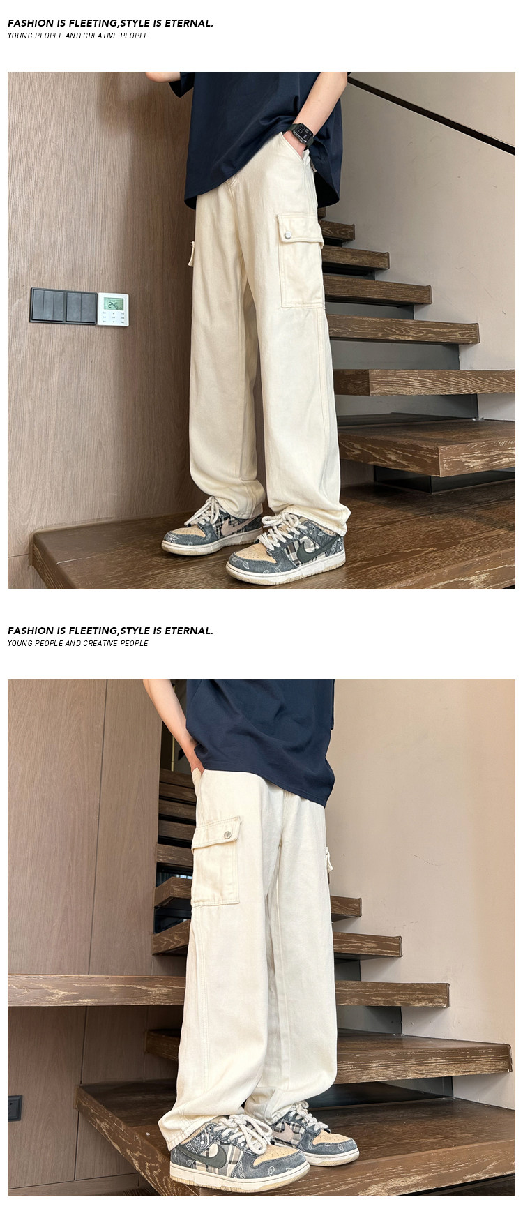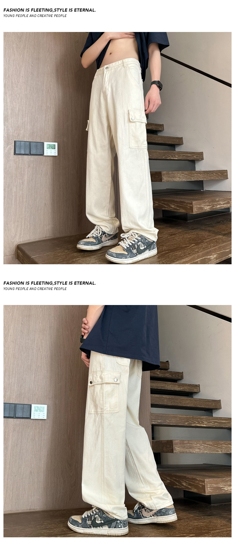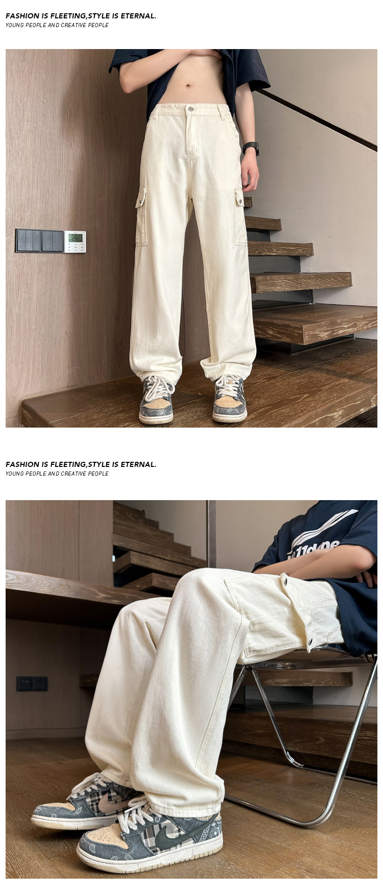 Black Workwear Jeans for Men, Summer Style with Large Pockets, Straight-Leg Pants, Trendy Brand, Loose Wide-Leg Casual Long Pants