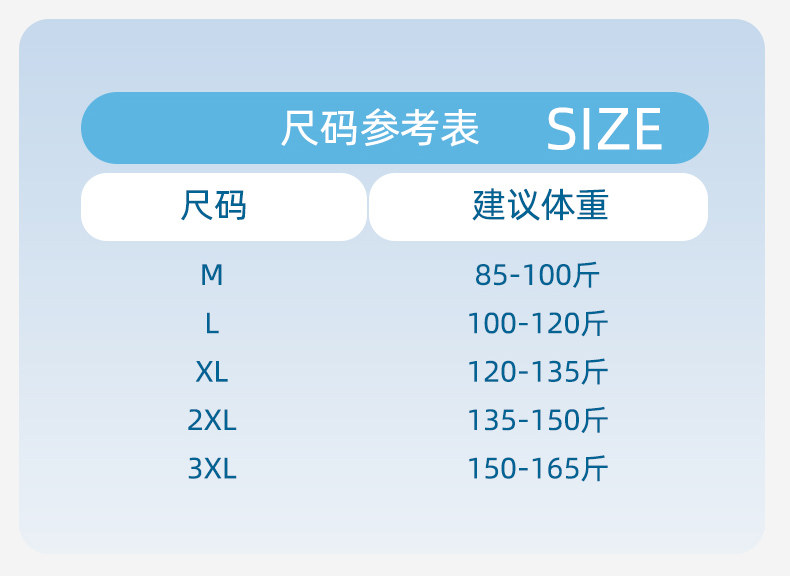 尺码 M【85-100斤】,L【100-115斤】,XL【115-130斤】,XXL【130-145斤】,XXXL【145-160斤】