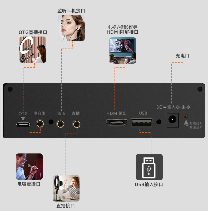 Verbindungsmethode USB,Mikrofon,OTG-Buchse,Wi-Fi-Verbindung,Live-Übertragungssteckdose,3,5-mm-Audiobuchse,Instrumenteneingang,Bluetooth-Verbindung