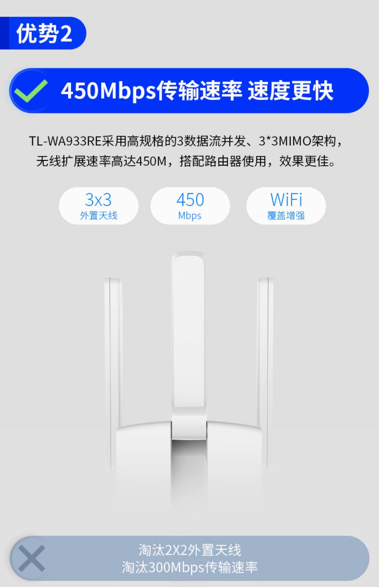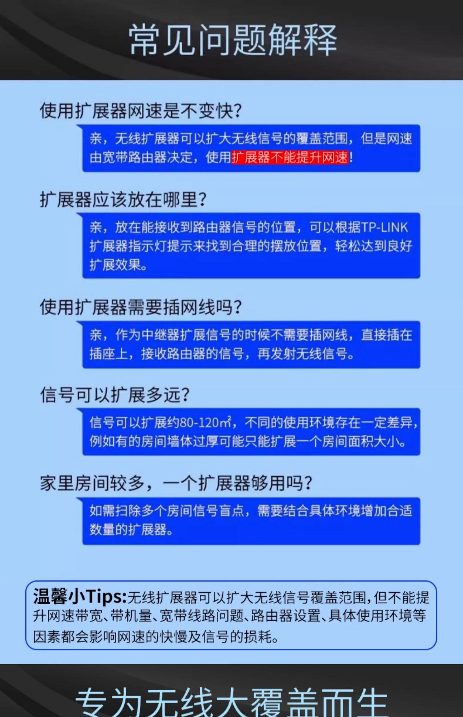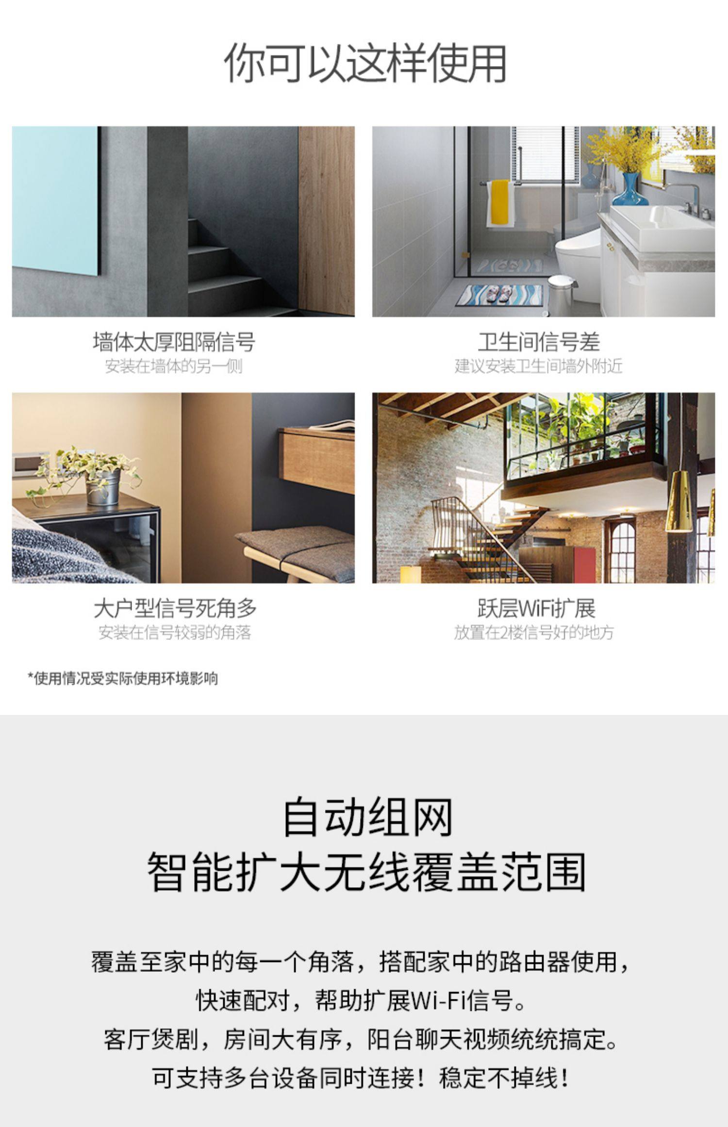 Clasificación de colores Edición especial 300M + antenas externas duales 2.4G + montaje en pared + fácil penetración en pared (ampliado a 30 más),Versión estándar 450M + tres antenas externas 2.4G + enchufe de pared + rango de señal completo (ampliado en 50 más),Versión mejorada de 1200M + 4 antenas de doble banda + penetración rápida de pared WiFi5 (ampliada aún más a 70),Versión insignia de 3000M + ancho de banda grande de 160MHz + penetración rápida de pared WiFi6 + chip mejorado importado (ampliado a 110)
