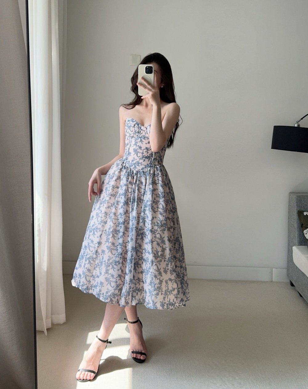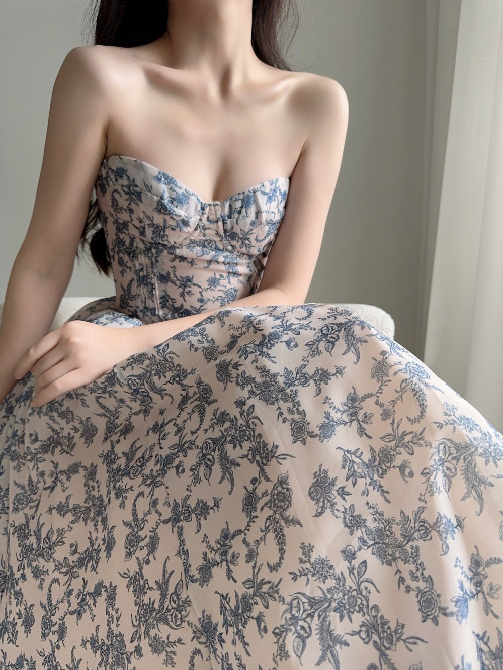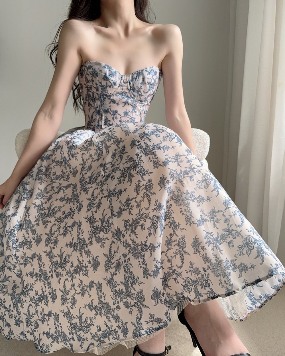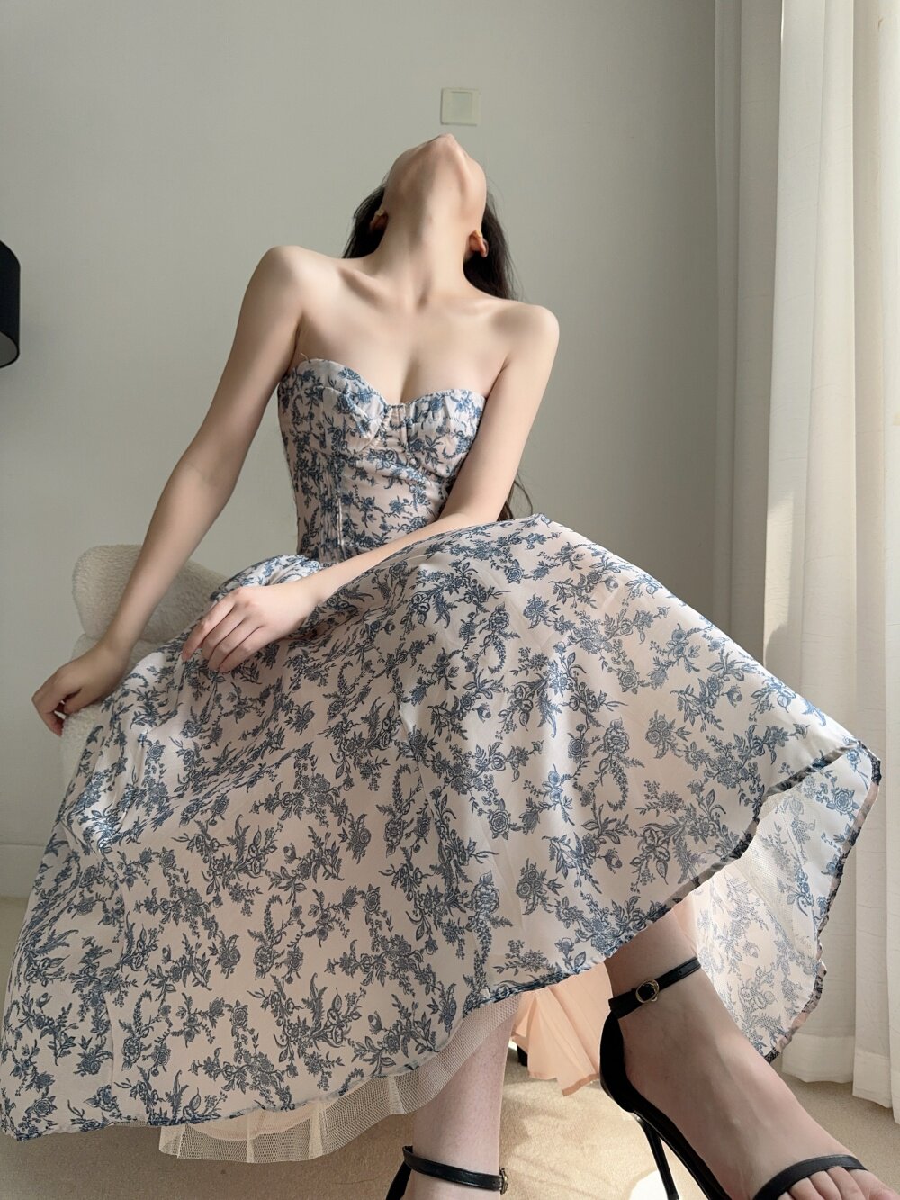 HOUSE抹胸束腰鱼骨裙青花瓷清冷御姐风法式小香风纯欲碎花连衣裙
