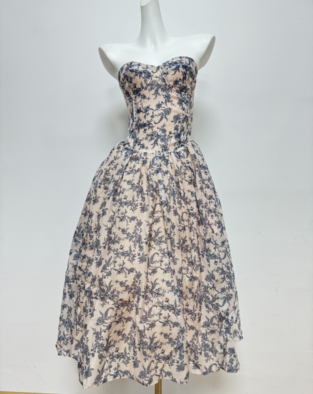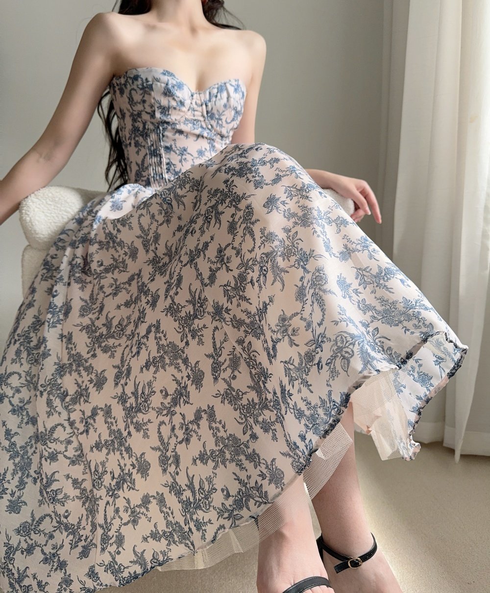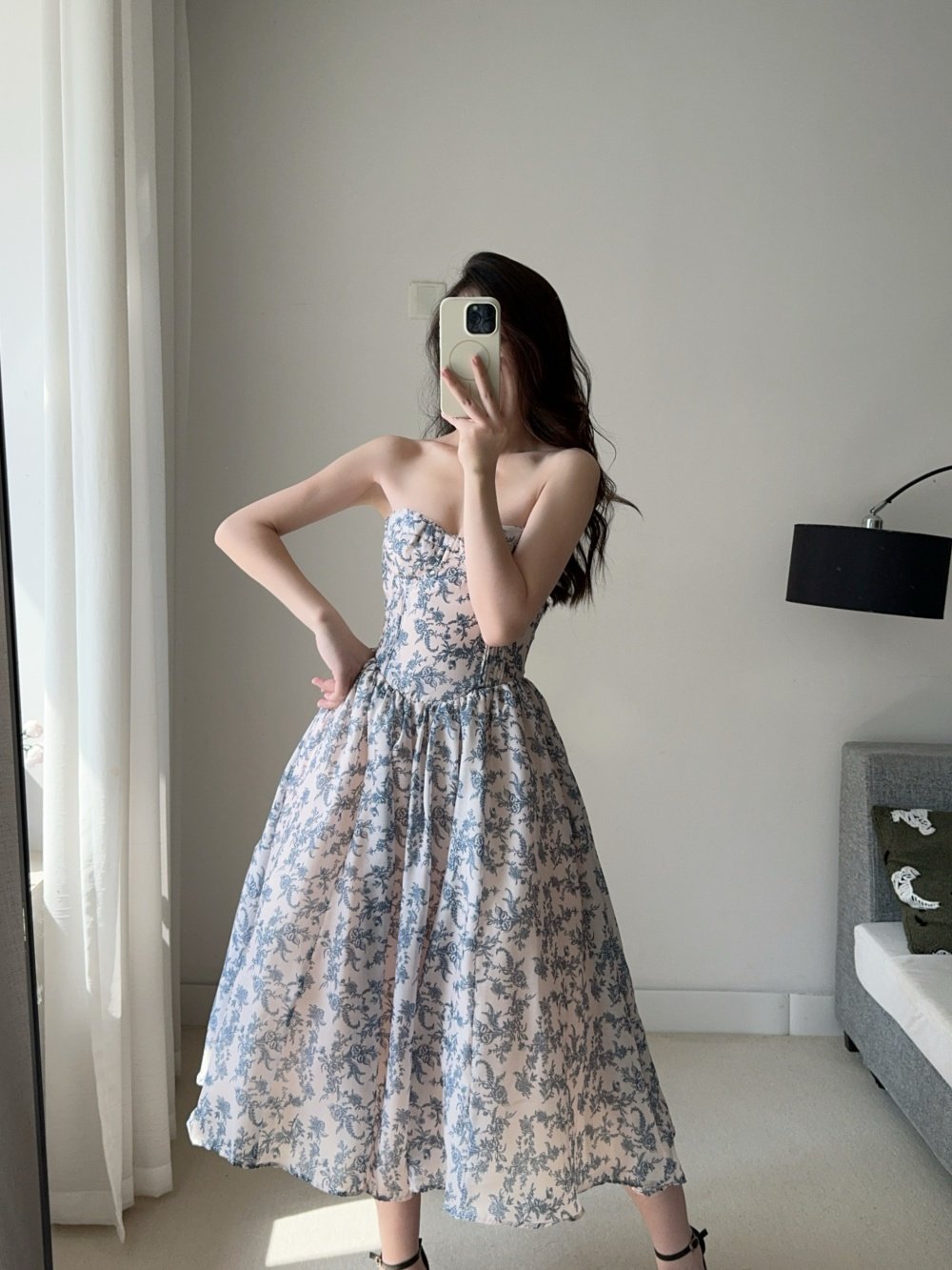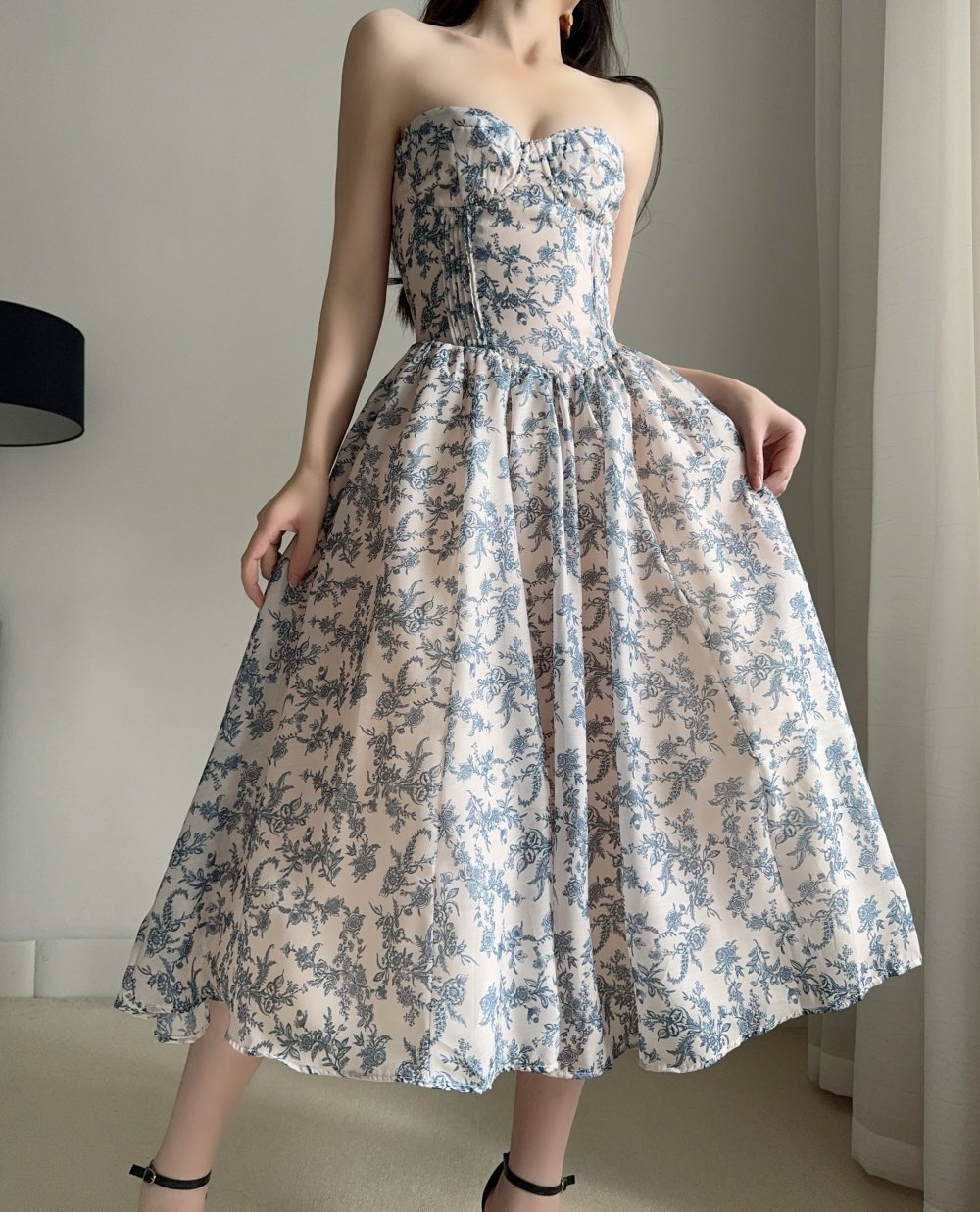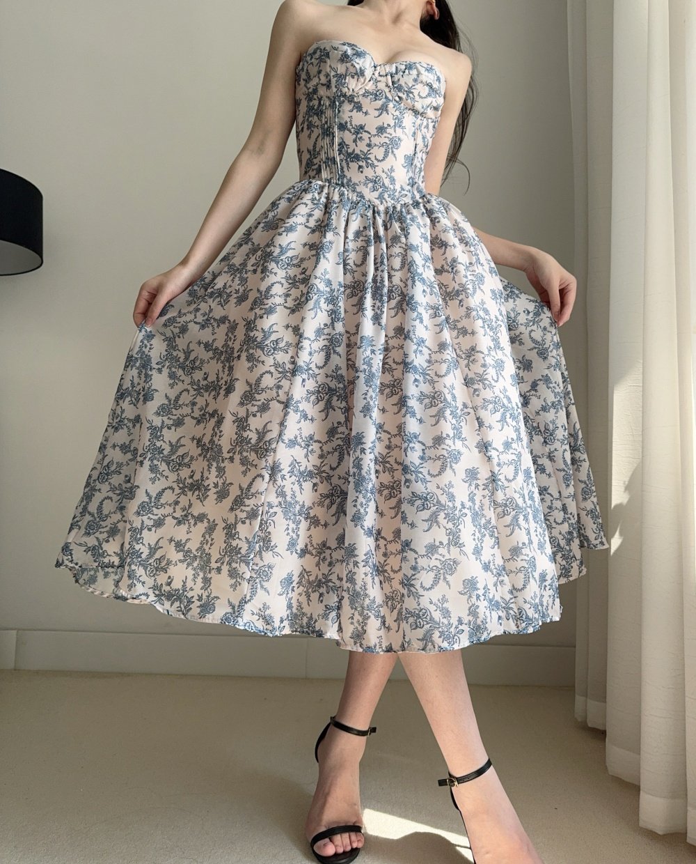 HOUSE抹胸束腰鱼骨裙青花瓷清冷御姐风法式小香风纯欲碎花连衣裙