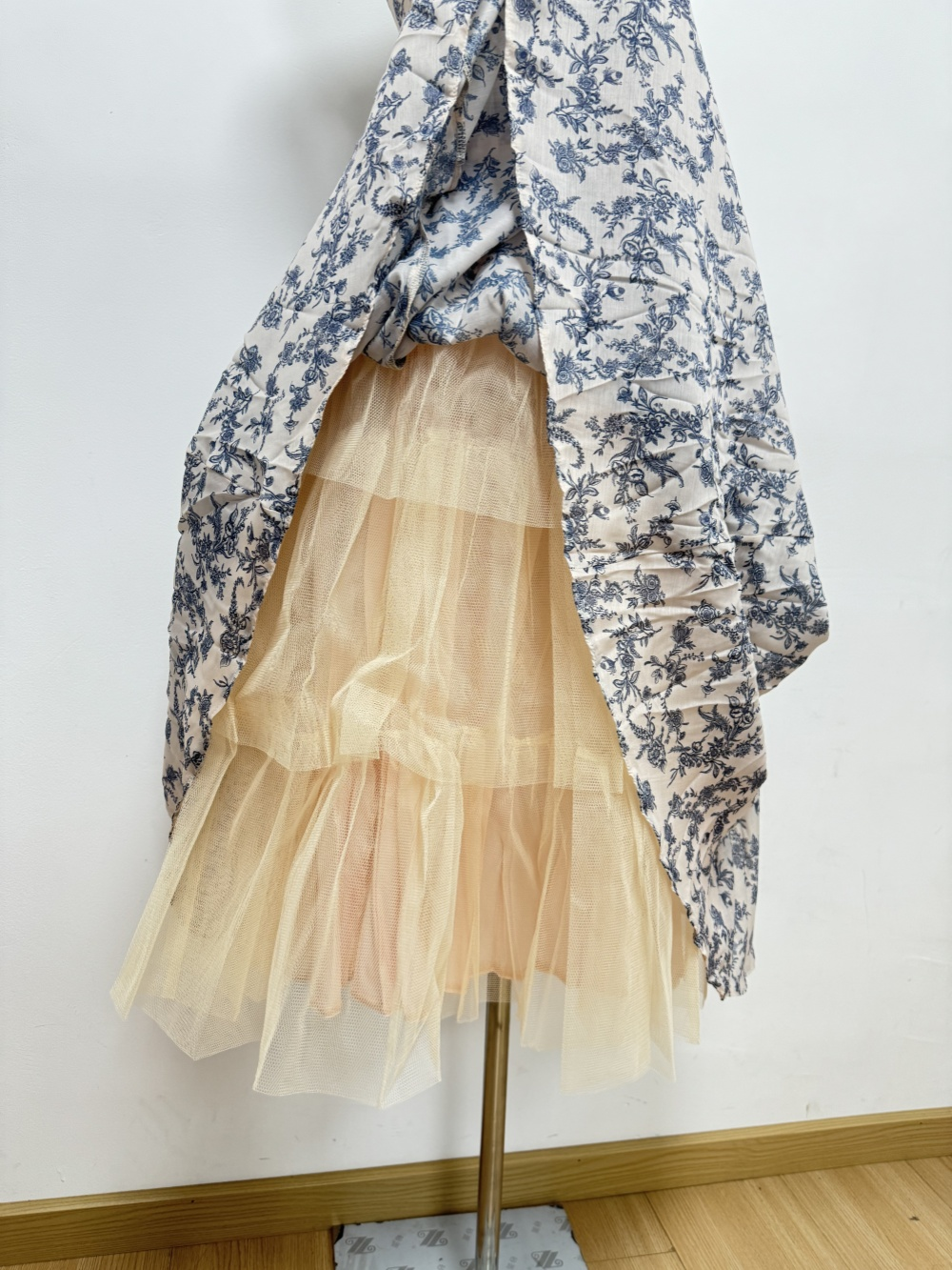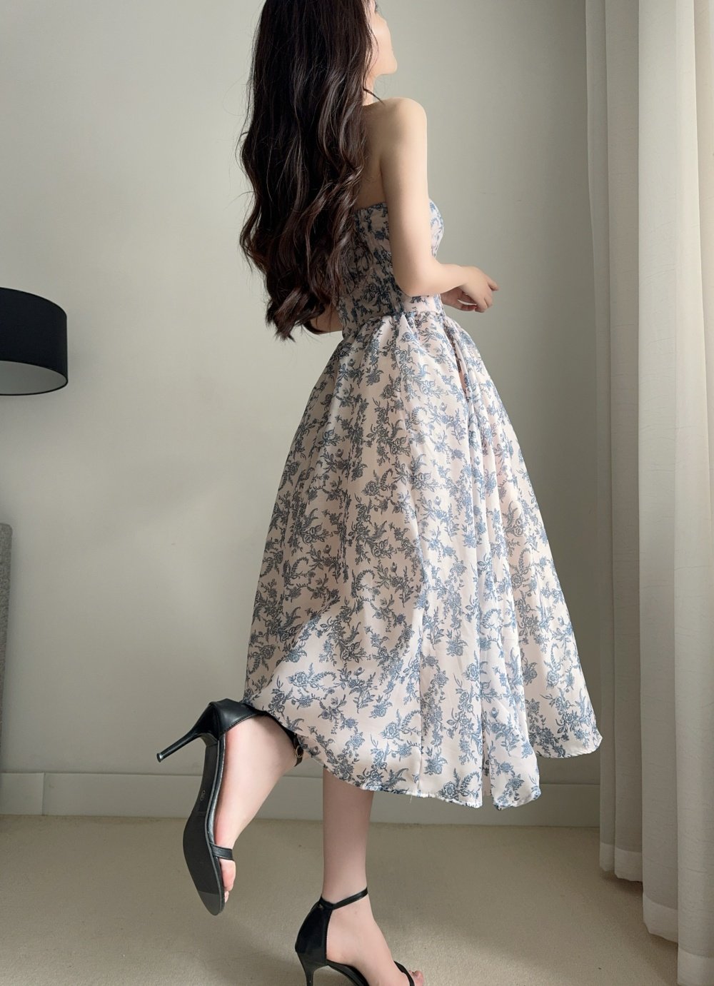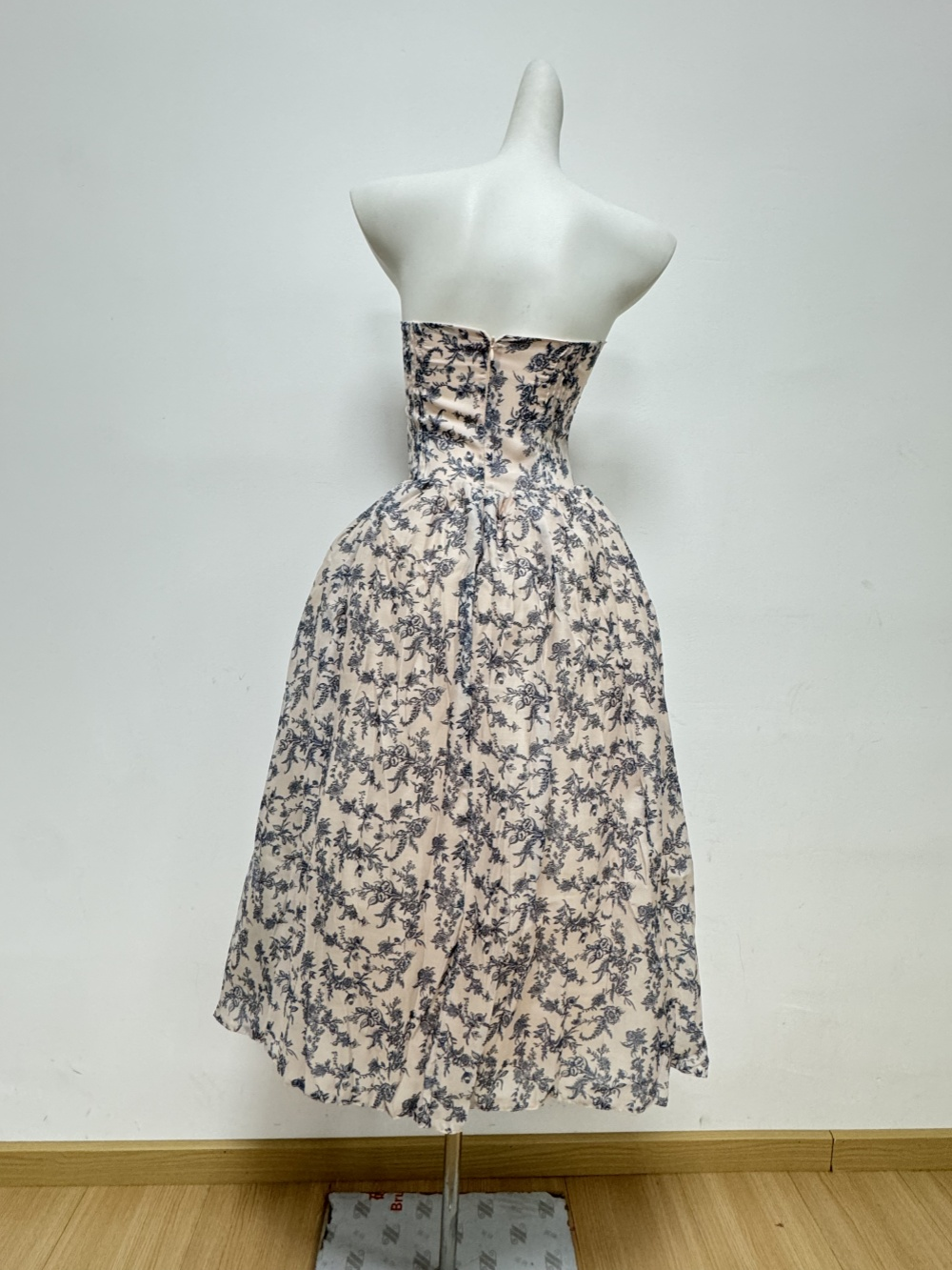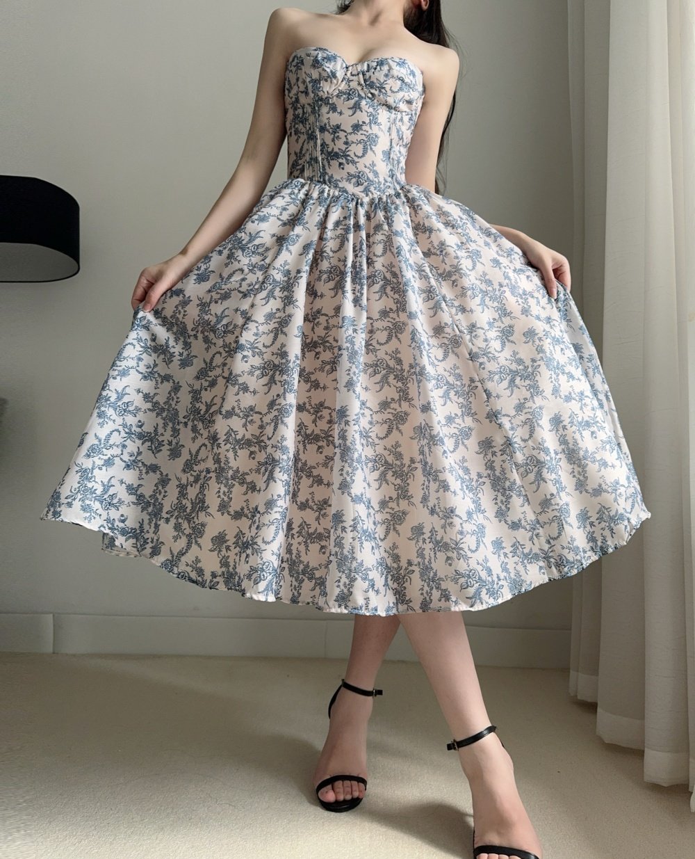HOUSE抹胸束腰鱼骨裙青花瓷清冷御姐风法式小香风纯欲碎花连衣裙