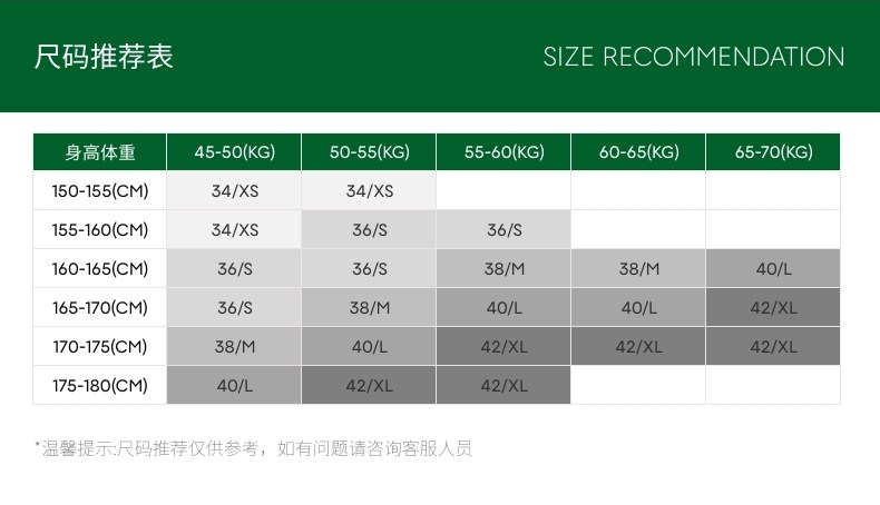 China (cm) 160-165/84-86 165-170 / 88-90 167-172 / 92-96 168-173 / 98-102 170-176 / 106-110