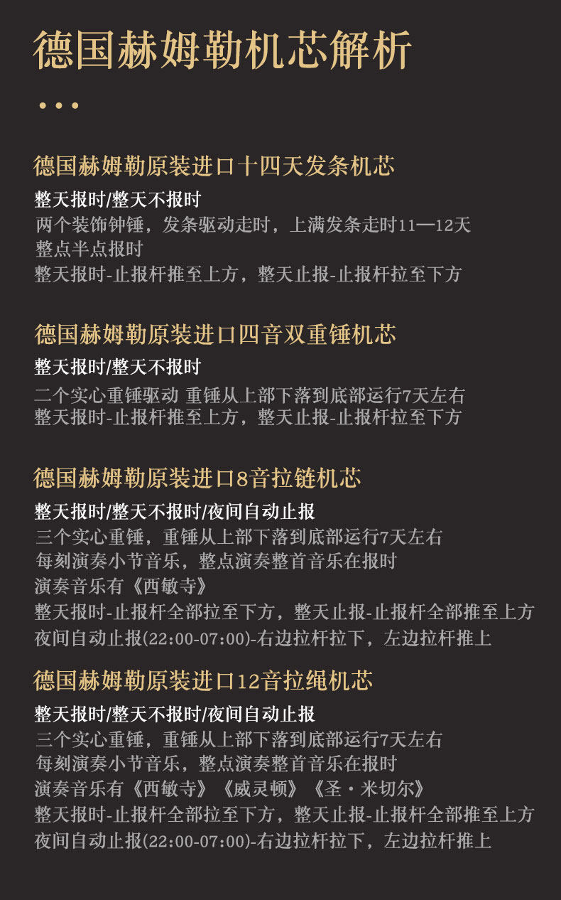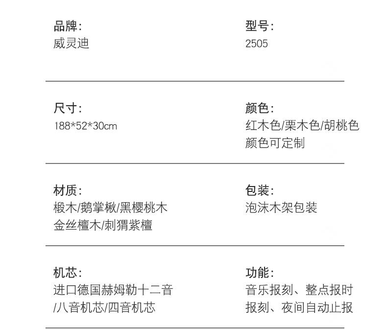 Color Classification Basswood Mahogany Color Polaris Clockwork Movement,Basswood Chestnut Polaris Clockwork Movement,Basswood White Polaris Clockwork Movement,Basswood Mahogany Color German Hemler 14-Day Clockwork,Basswood Chestnut German Hemler 14-Day Clockwork,Basswood Mahogany Color German Hemler Four-Tone Double Hammer Movement,Basswood Chestnut German Hemler Four-Tone Double Hammer Movement,Basswood Mahogany Color German Hemler 8-Tone Zipper,Basswood Chestnut German Hemler 8-Tone Zipper,Basswood Mahogany Color German Hemler 12-Tone Drawstring,Basswood Chestnut German Hemler 12-Tone Drawstring,Liriodendron Tulipifera German Hemler Four-Note Double Hammer,Liriodendron Tulipifera German Hemler Eight-Tone Triple Hammer,Black Cherry Wood German Hermle Triple Hammer Music Box,Golden Sandalwood German Hermle 12-Note Pull-String Music Box,Hedgehog Rosewood German Hermle Four-Tone 2-Hammer,Hedgehog Rosewood German Hemler 8-Tone Zipper,Hedgehog Rosewood German Hemler 12-Tone Zipper,Hedgehog Rosewood German Hermle 12-Tone Drawstring,Ebony Wood, Hermle German Music Box Zipper,Ebony Wood German Hermle 12-Note Pull-String Music Box,Color Can Be Customized,Basswood Mahogany Color Polaris Clockwork Movement