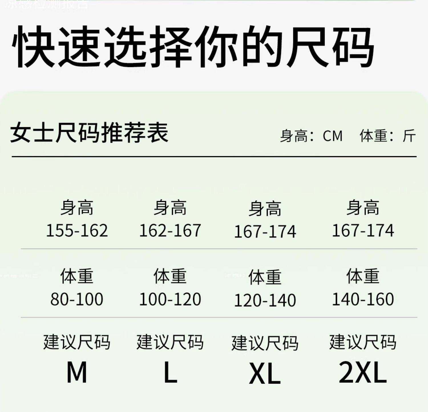 尺码 M女【推荐穿着体重80-100斤】,L女【推荐穿着体重100-120斤】,XL女【推荐穿着体重120-140斤】,XXL女【推荐穿着体重140-160斤】
