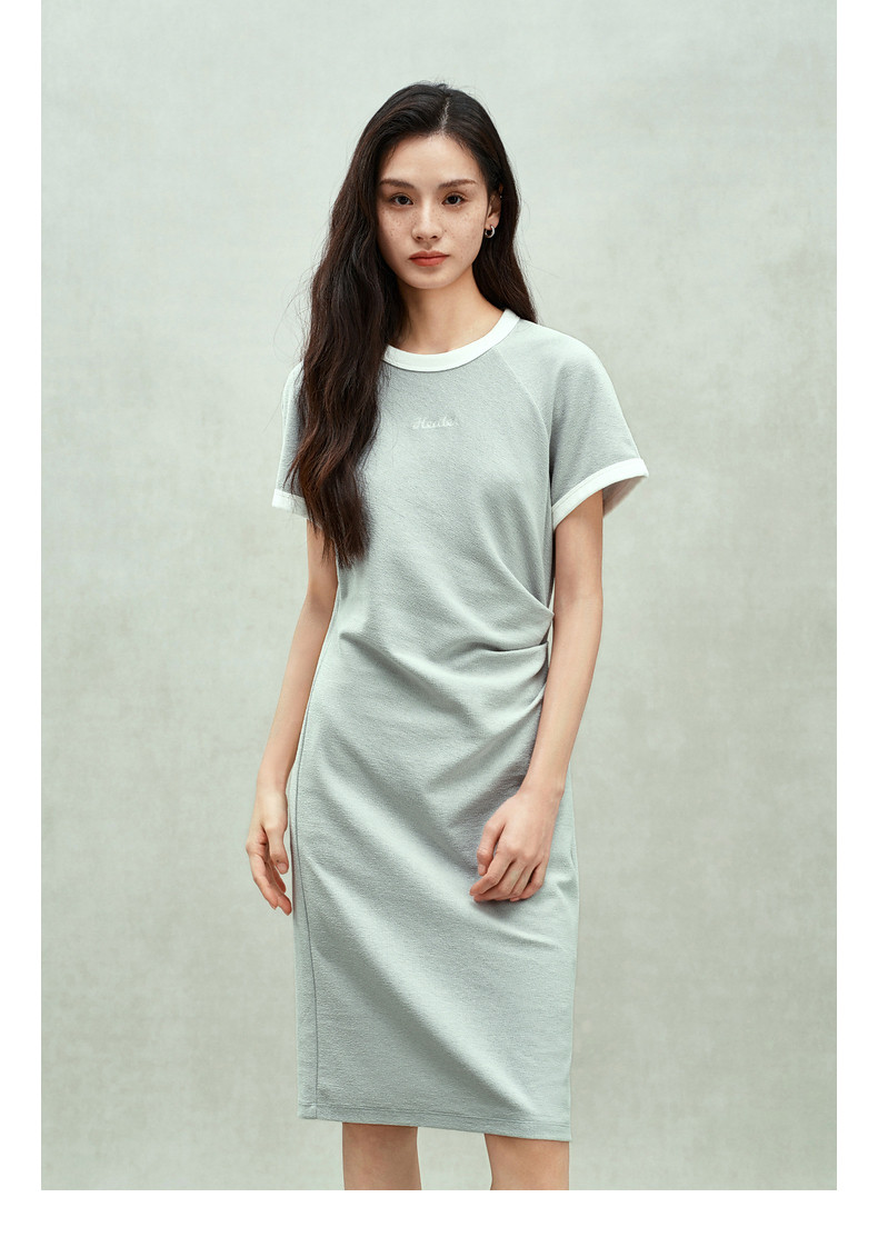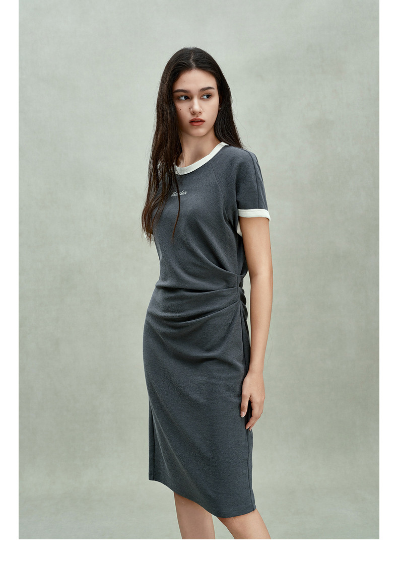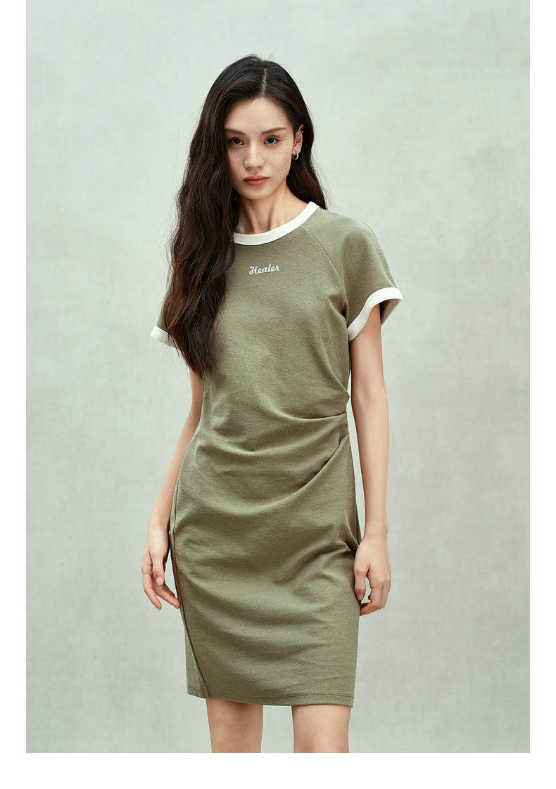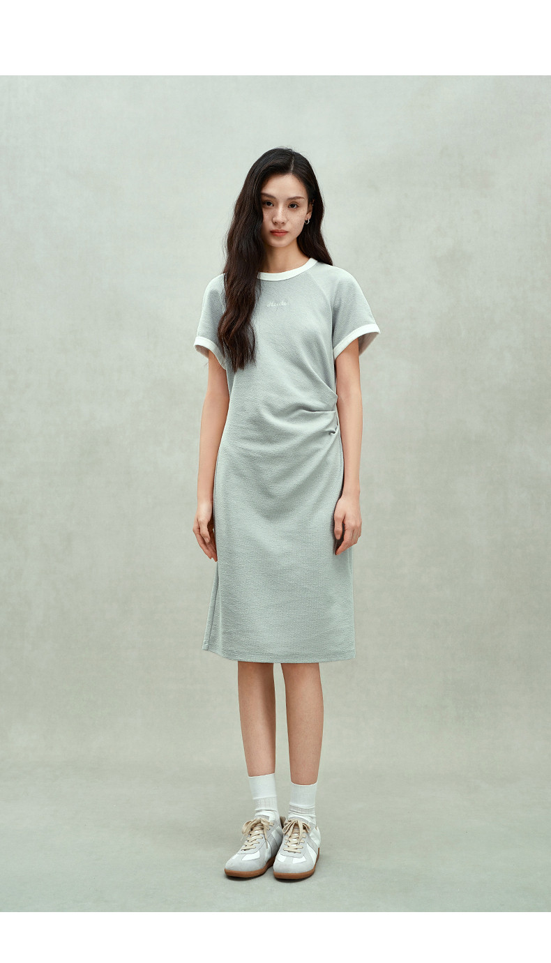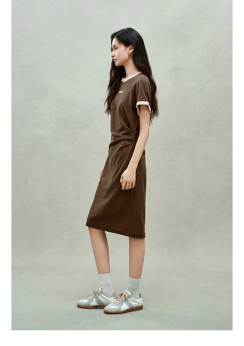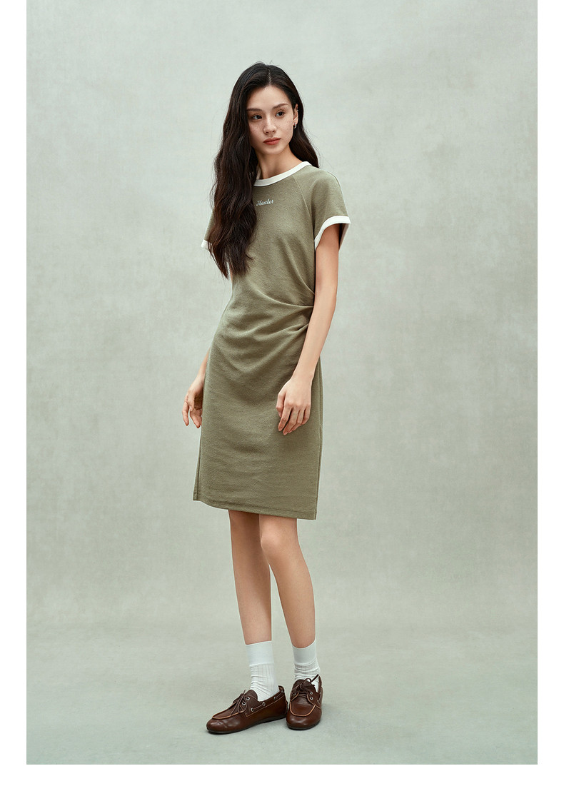 Ochirly oushili pleated rag-shoulder dress for women embroidery contrast color waist-hugging leisure 2025 spring new product