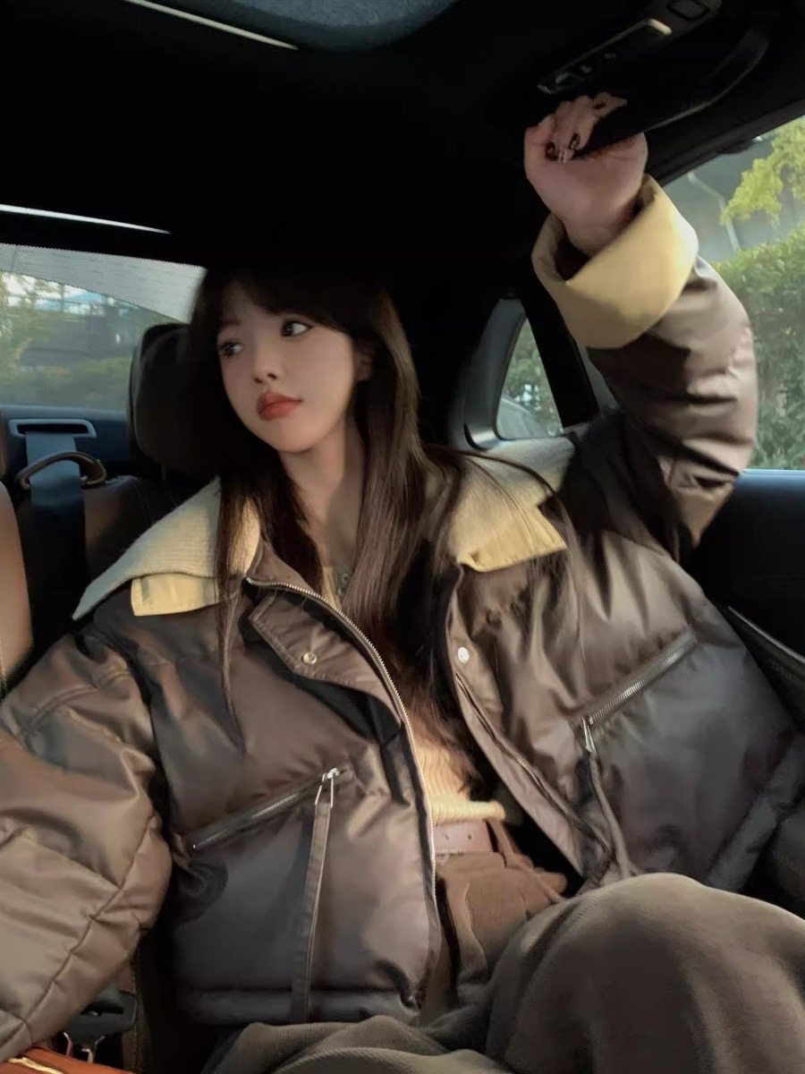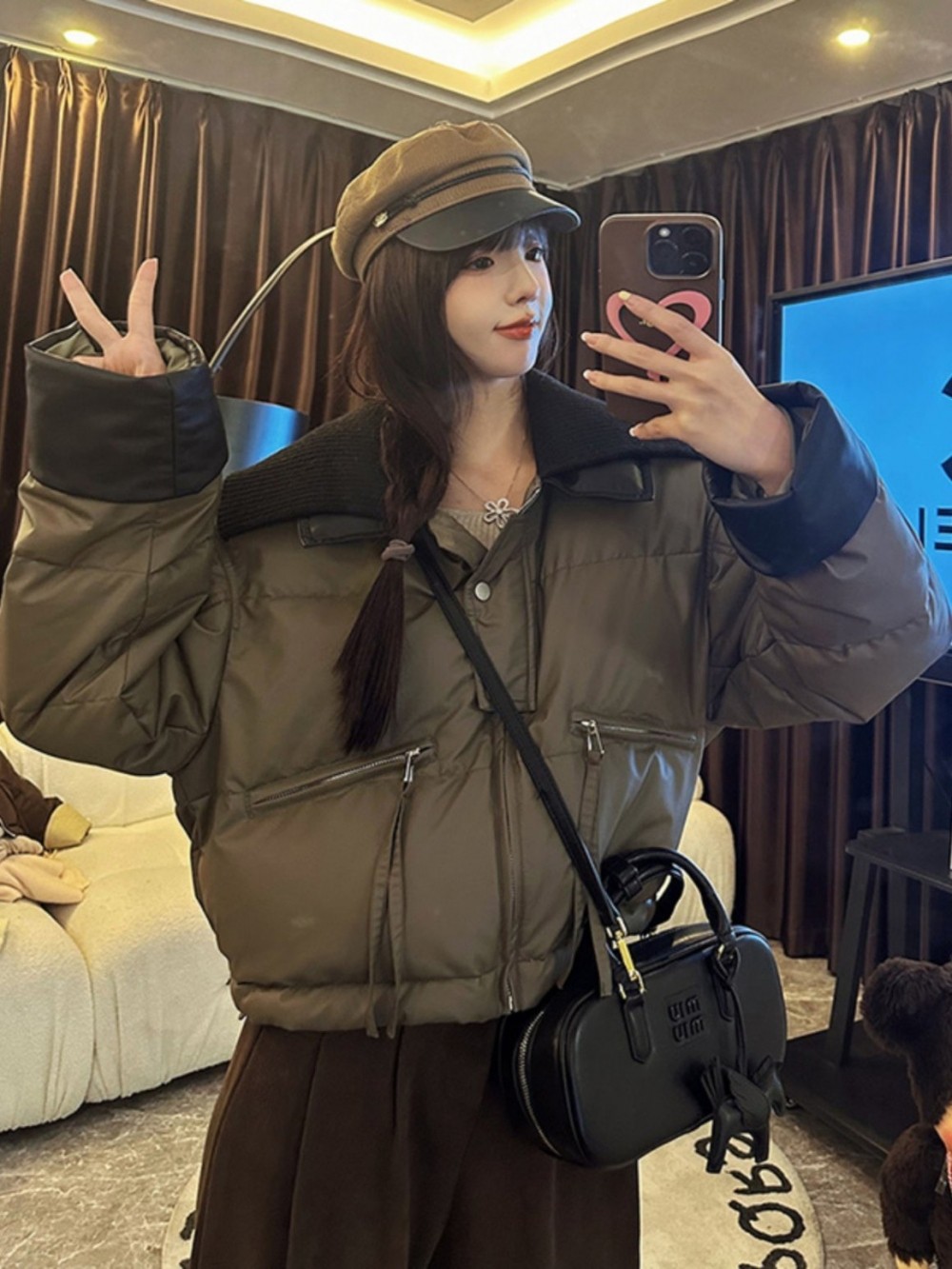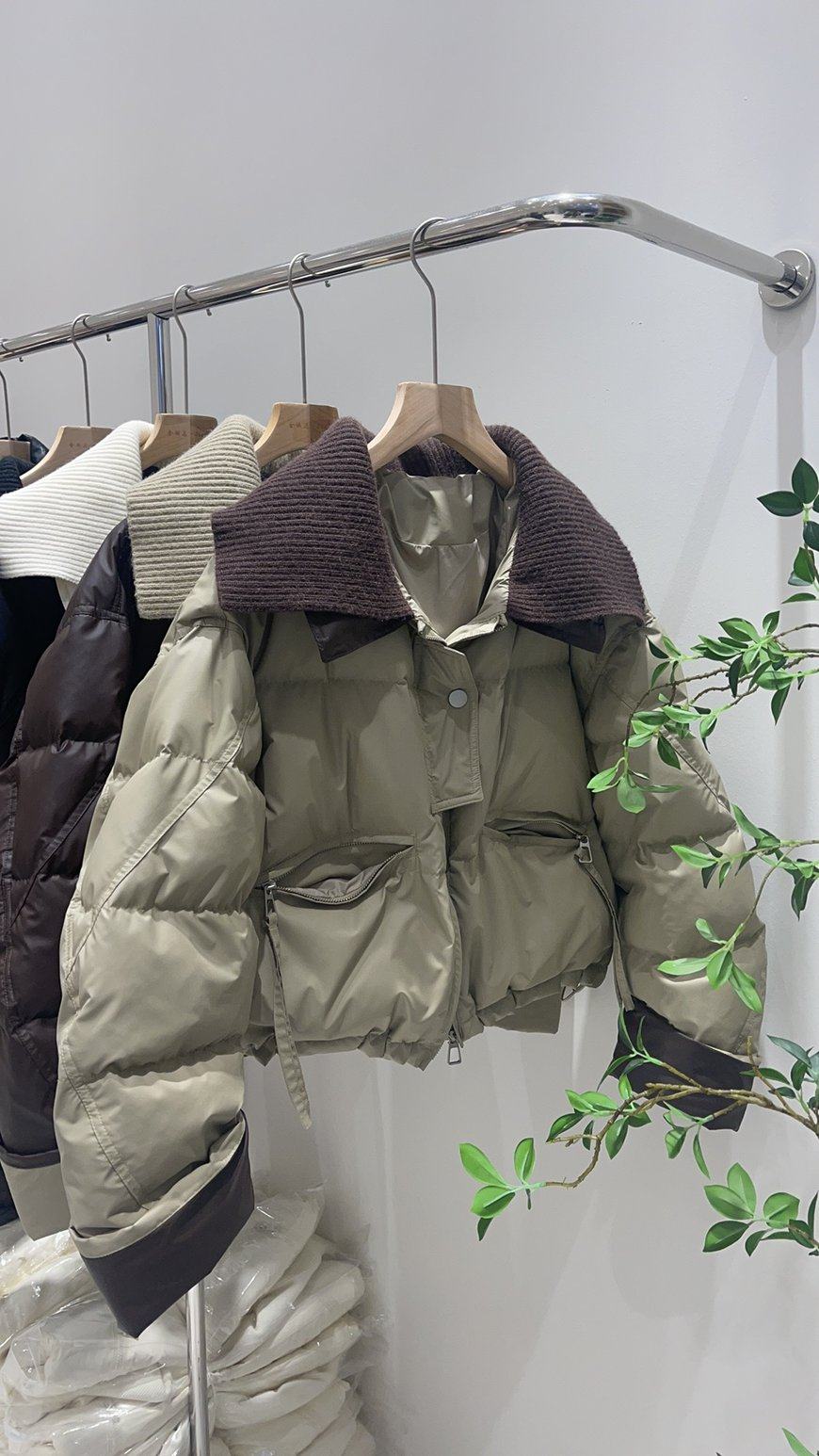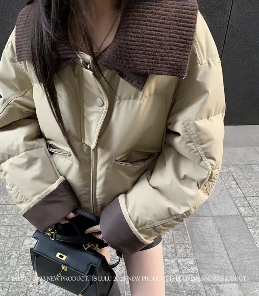 2025 Europäische gestrickte kurze Daunenjacke mit Revers für Damen, Winterjacke aus Proteinleder, gespleißt, weiße Entendaunen, Nebensaison-Jackentrend