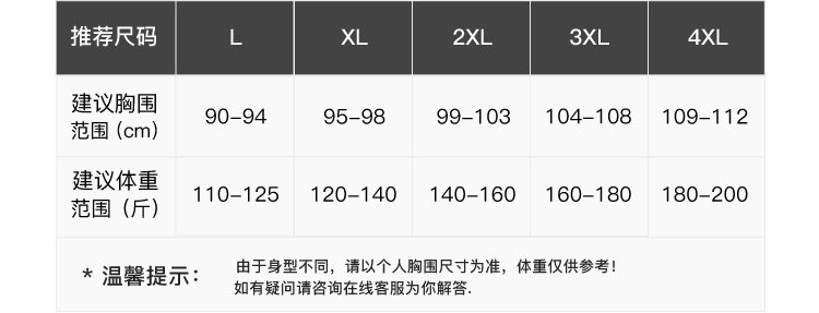 China (cm) 165 / 88-90 170 / 96-98 175 / 108-110 180 / 118-122 185 / 126-130