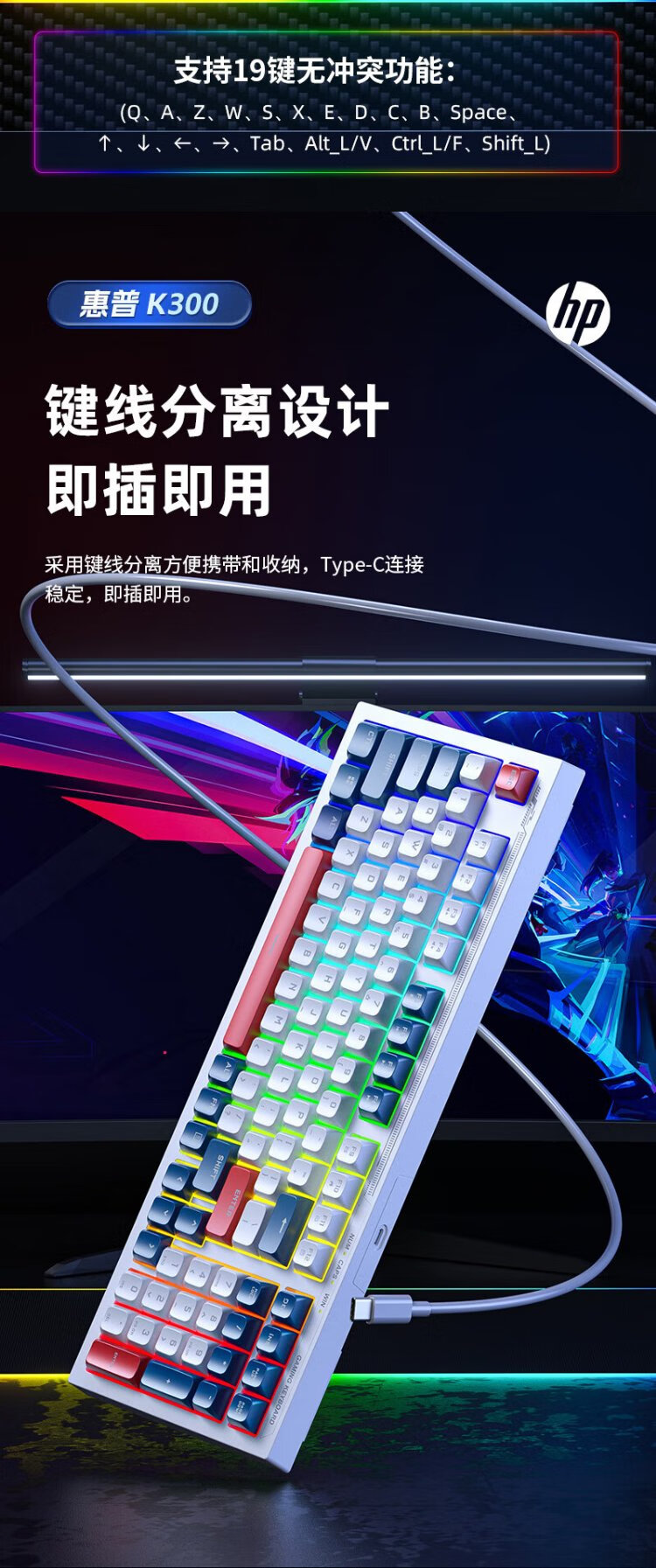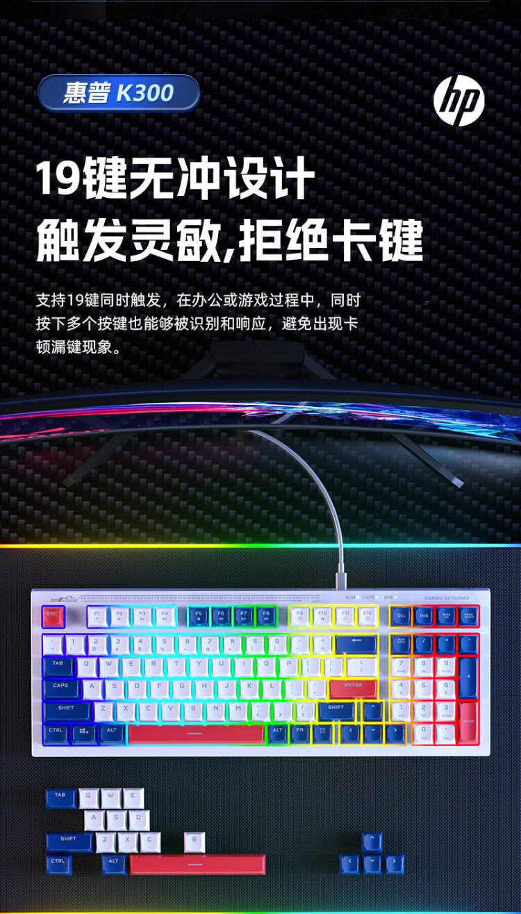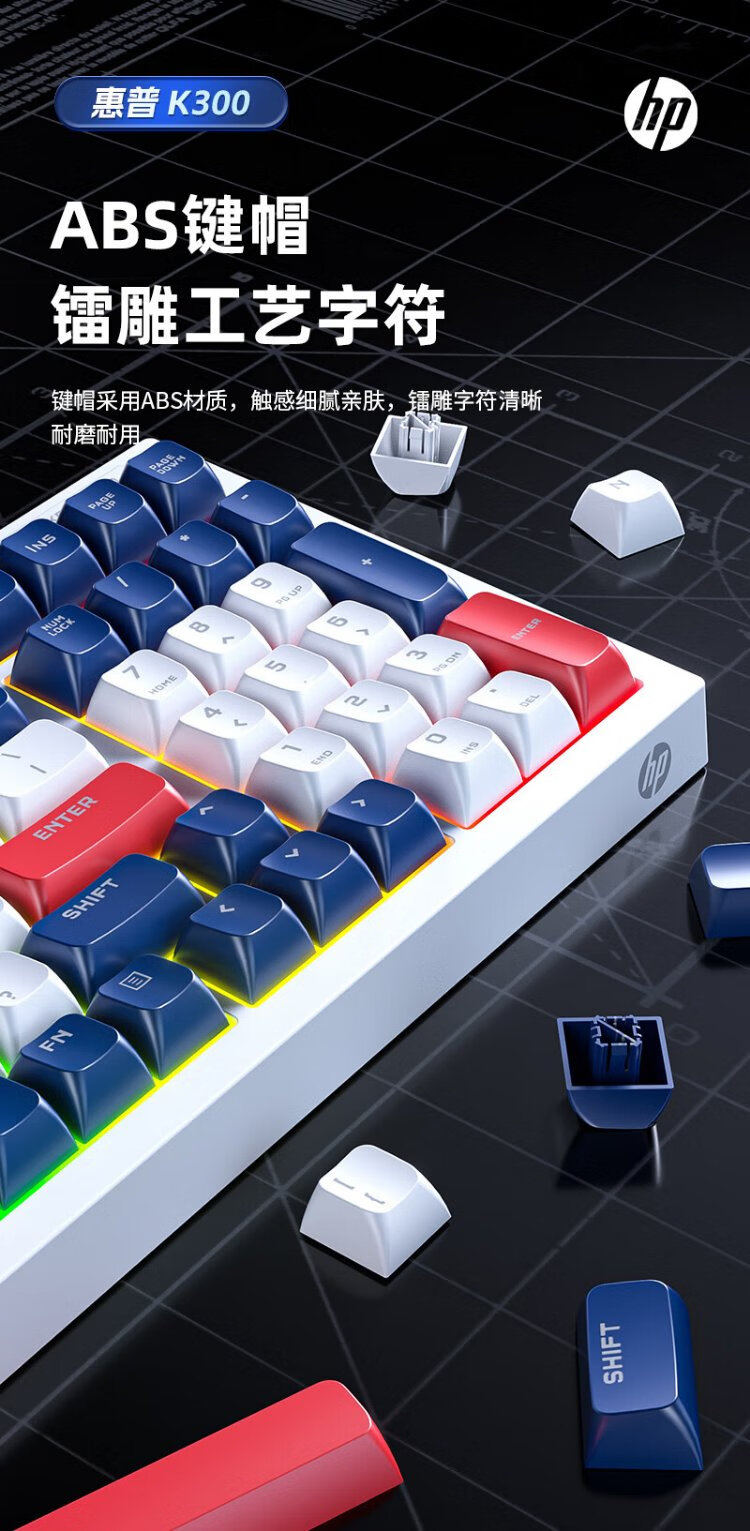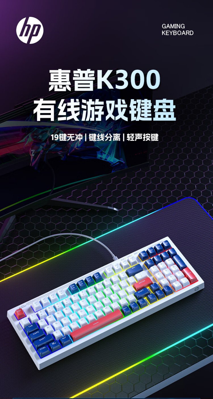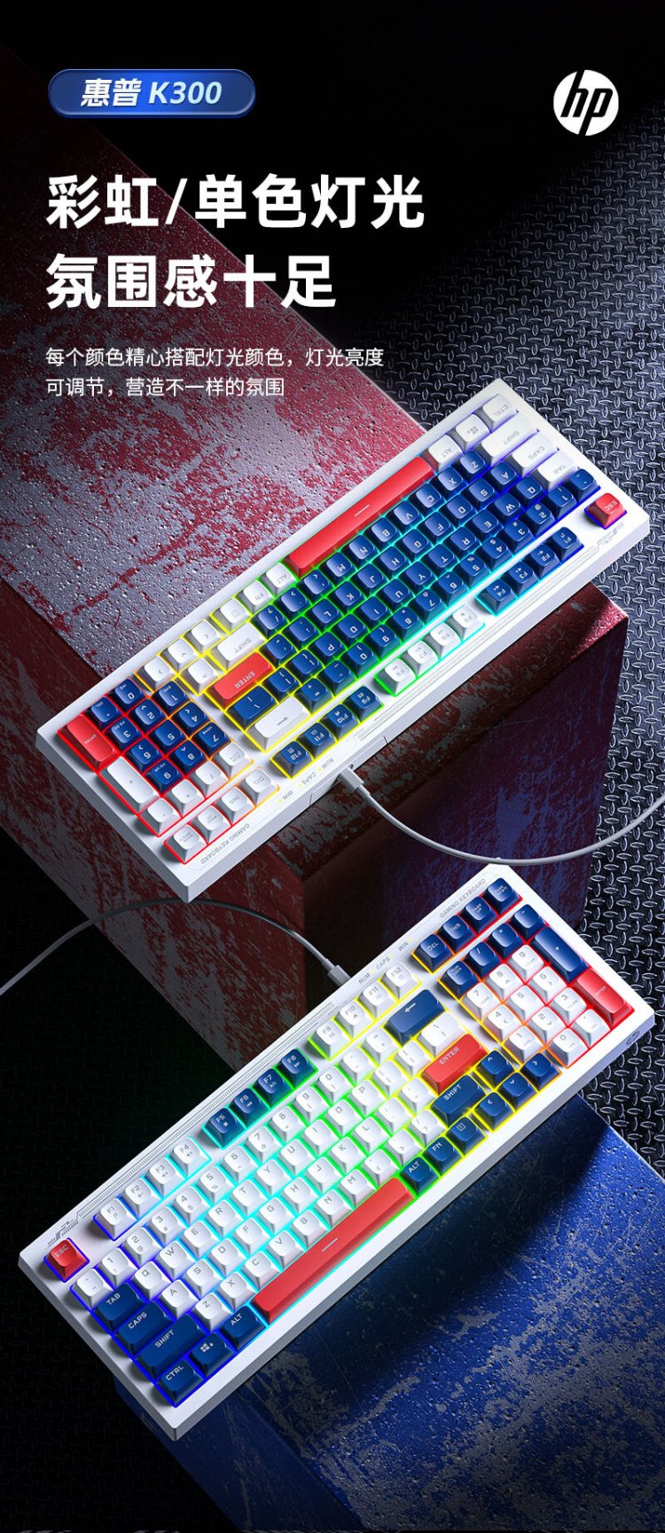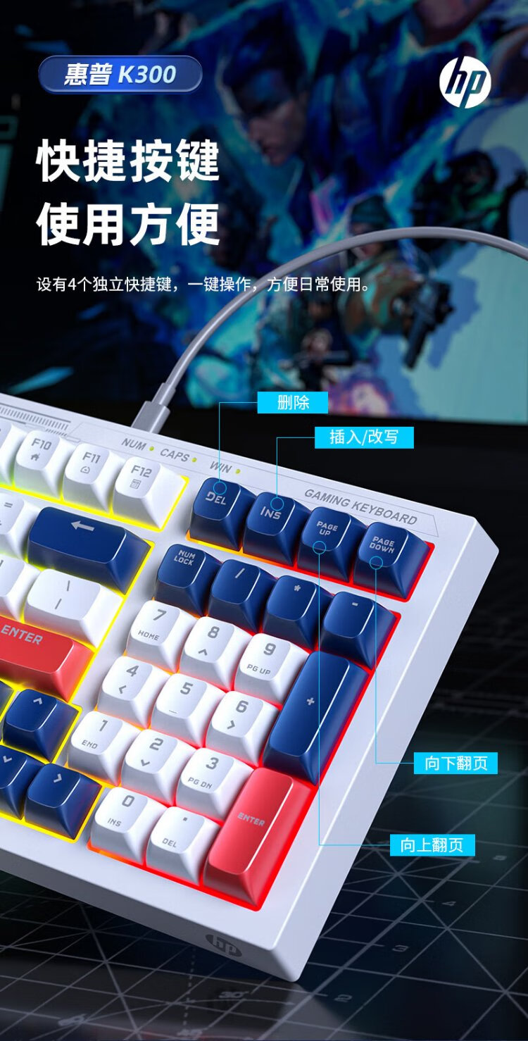 惠普(HP)K300真机械手感键盘 轻音高颜值 98客制化配列 插拔有线游戏专用吃鸡笔记本电脑电竞lol三拼色白芯