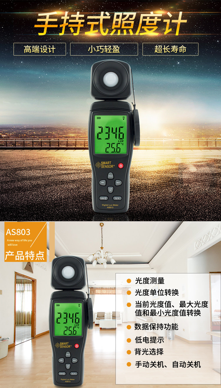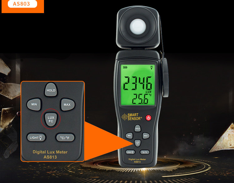 Sort by color AS823 (split) automatic gear selection,AS803 (standard configuration) measuring range 1~200,000 LUX,AS813 (standard configuration) maximum and minimum value locking,AS803 (charging set) range 1~200,000 LUX,ST8813 comes standard with professional grade 100/1000/10000FC,AS823 (charging set) automatic gear selection,AS813 (charging set) maximum and minimum value lock,AM823 (explosion-proof type)