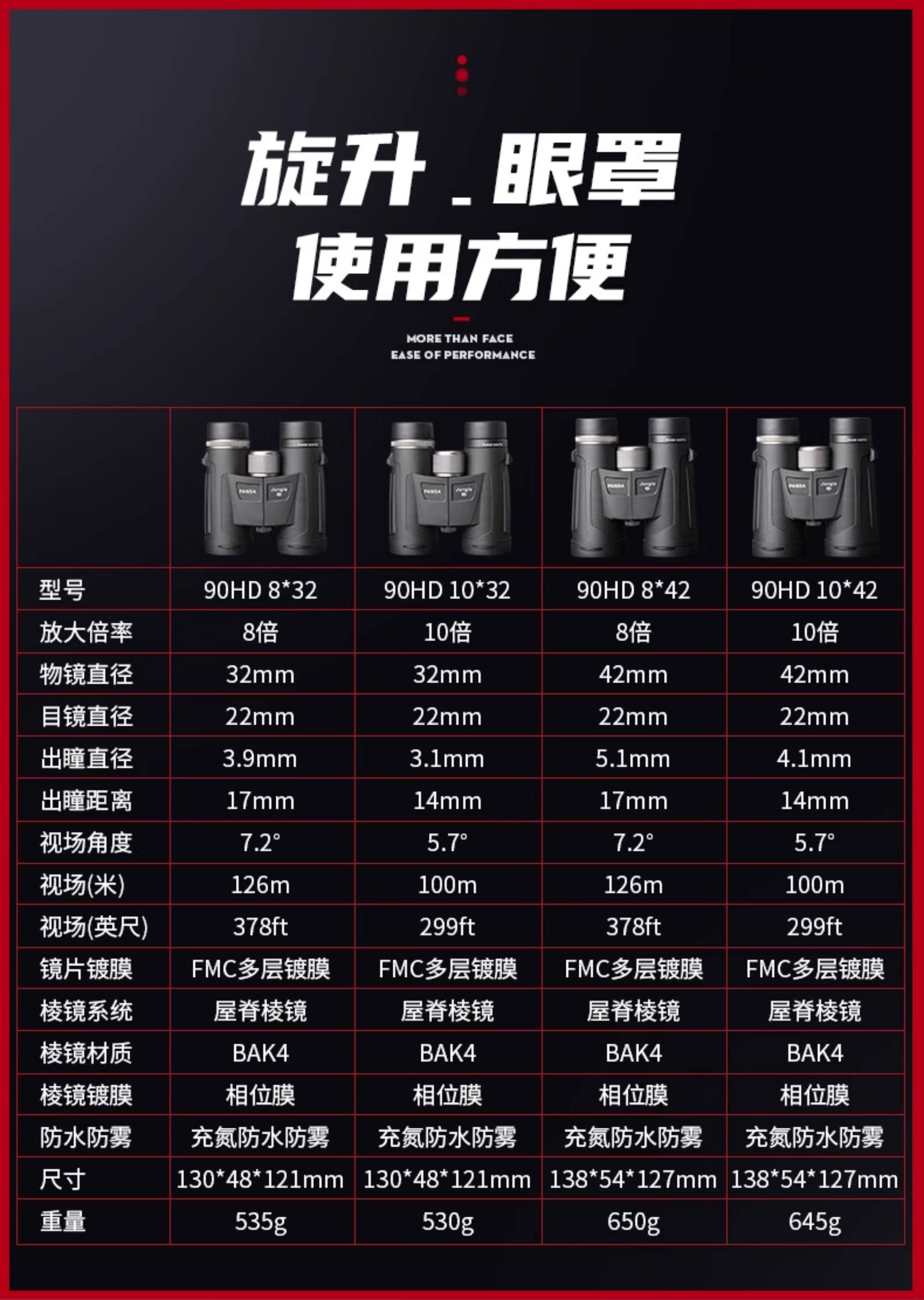 Farbklassifizierung 90HD 8*32 Leichtes achtfaches Goldmodell,90HD 10*32 tragbares Modell mit hoher Vergrößerung,90HD 8*42 großes Objektiv, achtfach goldfarben,90HD 10*42 großes Objektiv, Modell mit hoher Vergrößerung,90P 10*42 Hochleistungs-Schwarzes wasserdichtes Modell,90P 10*42 Hochleistungs-blaues wasserdichtes Modell