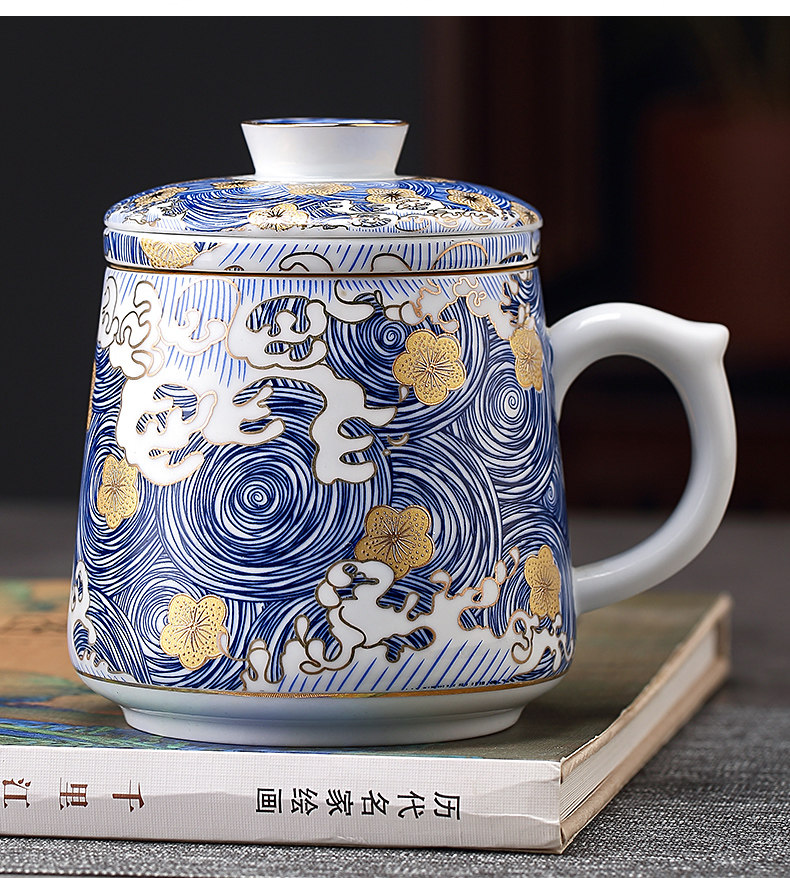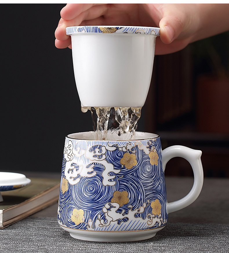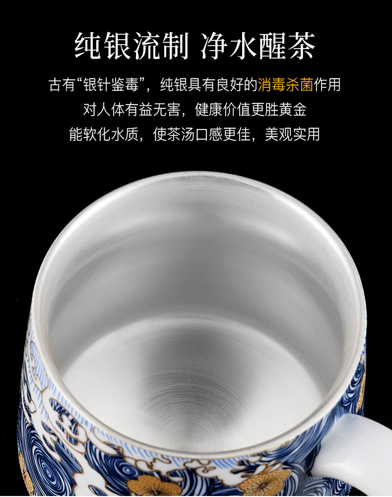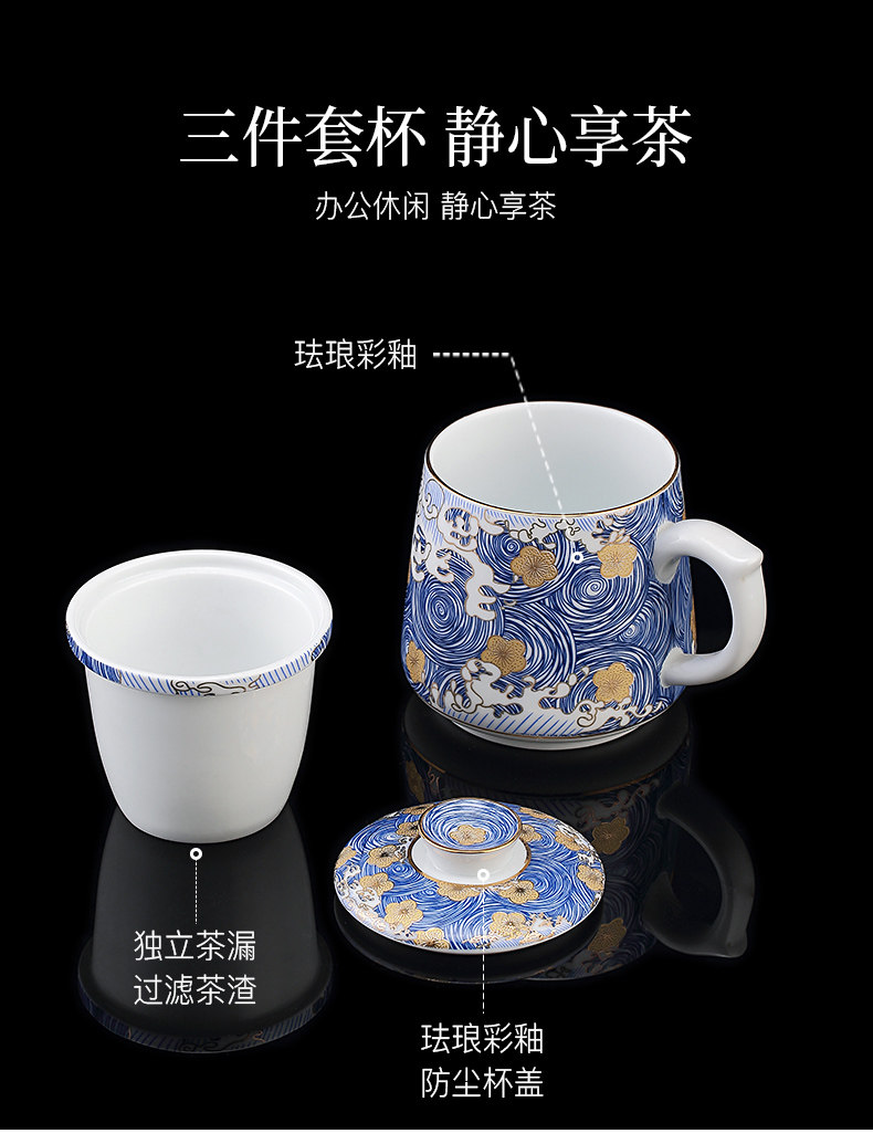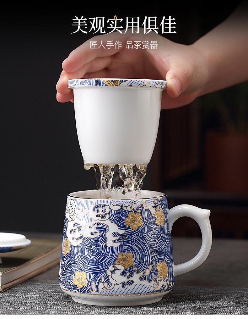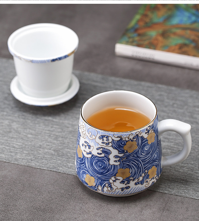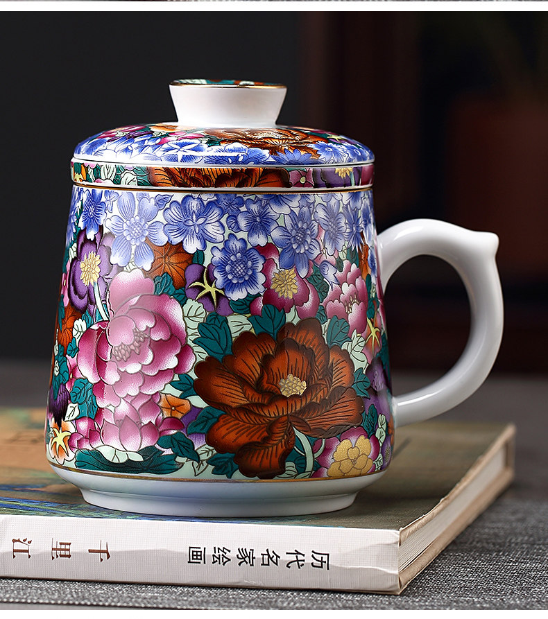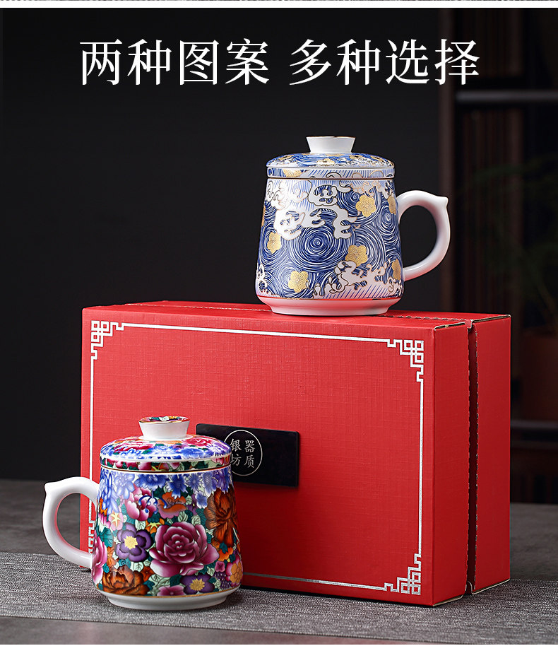 Guangqian Emaille-Farbe, vergoldetes Silber, persönliche Keramik-Teetasse mit Deckel zum Filtern von Tee-Wasser-Trennung, Home-Office-Teetasse
