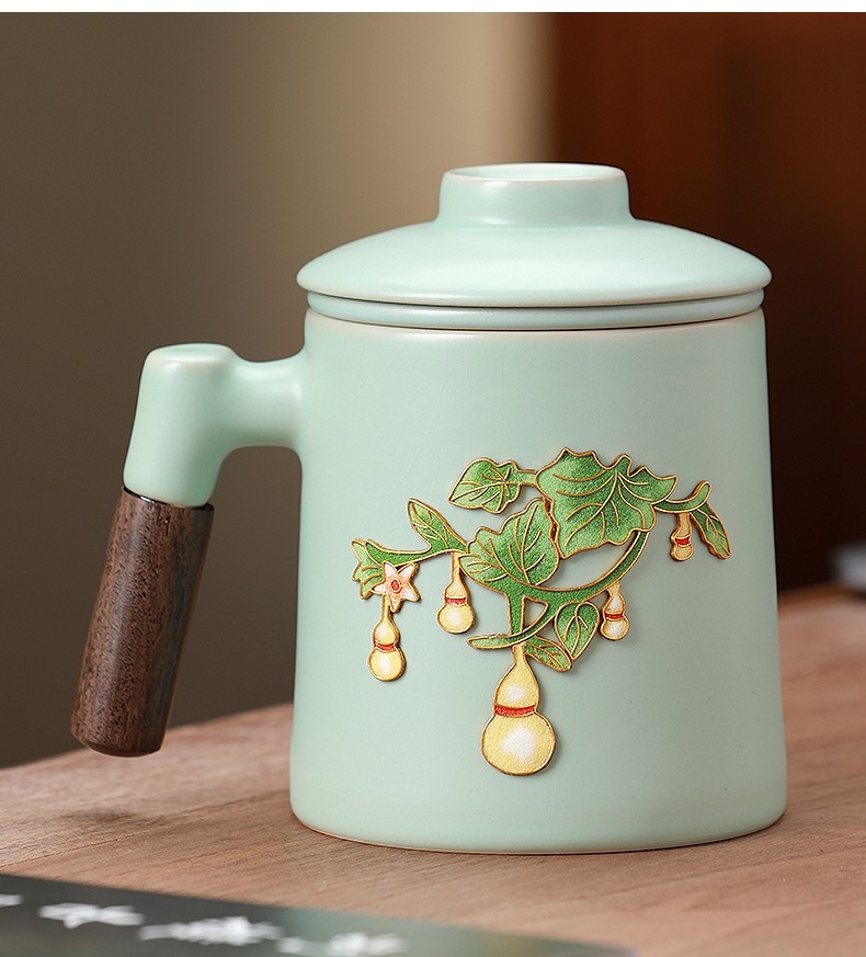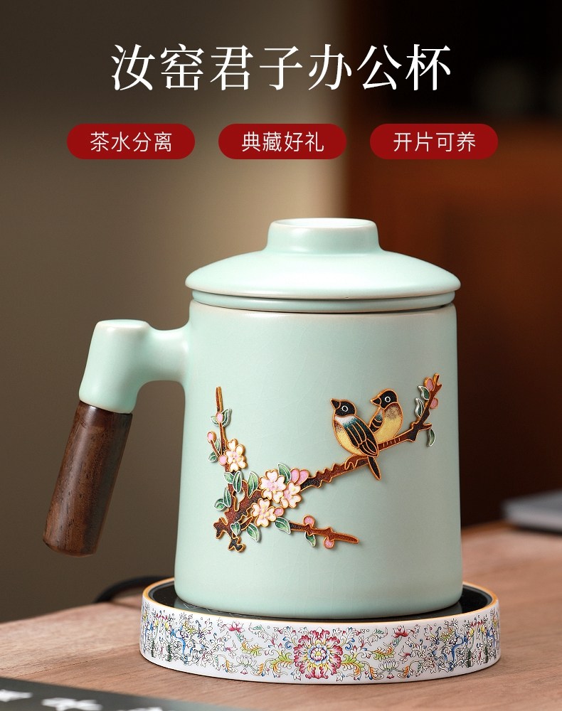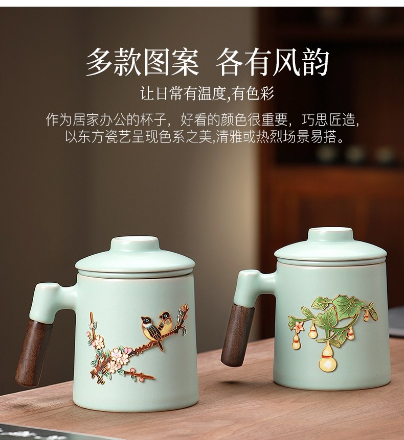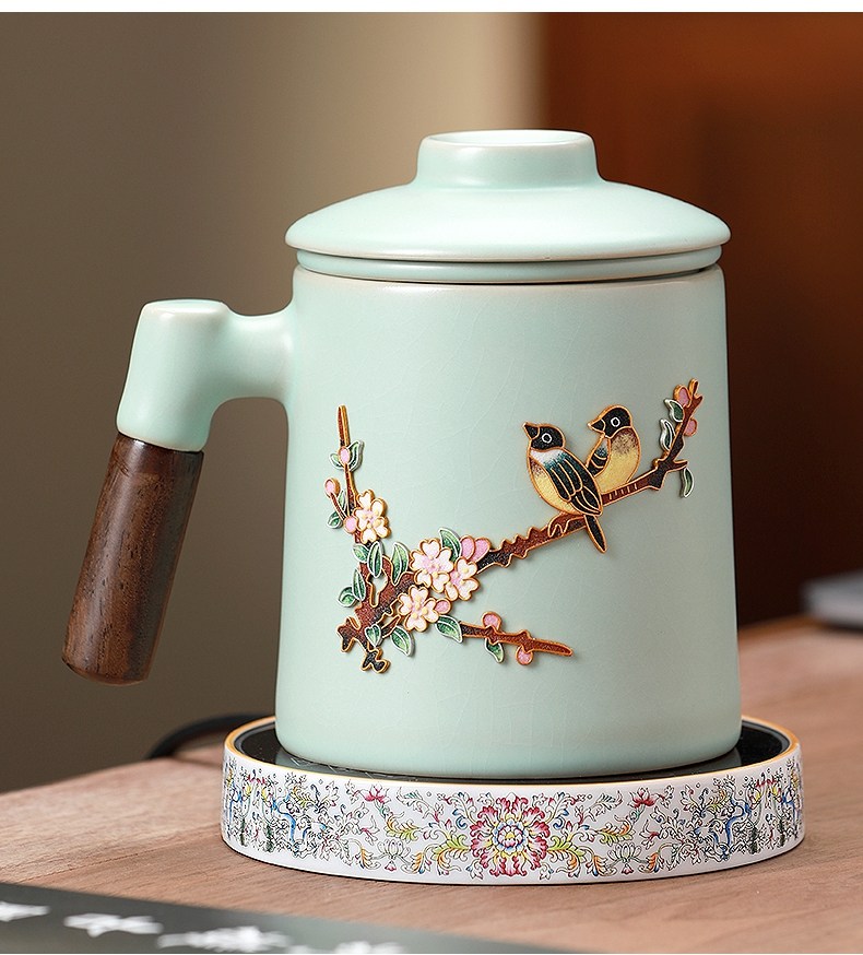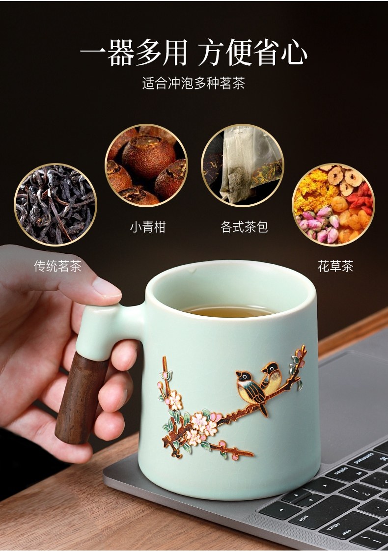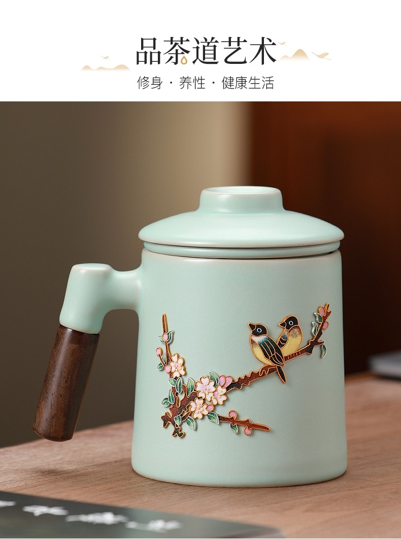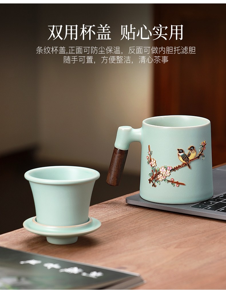 Ru Kiln Cloisonné Filigree Wooden Lid Filter Ceramic Tea Cup, Tea-Water Separation, Personal Use, Office and Home Use Tea Brewing Cup