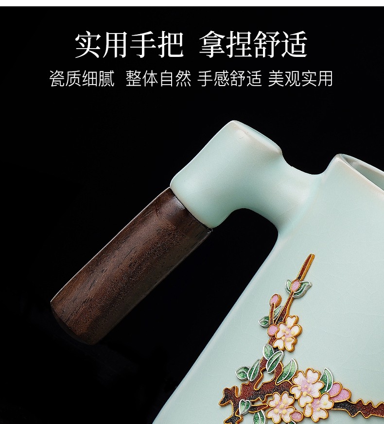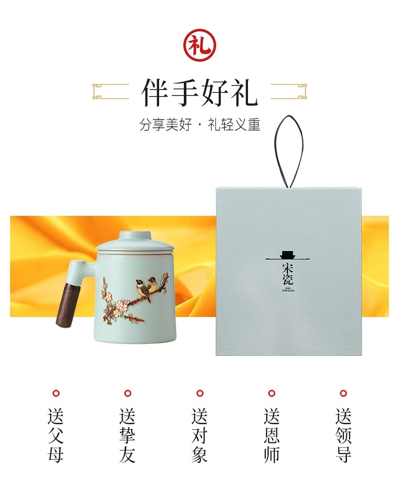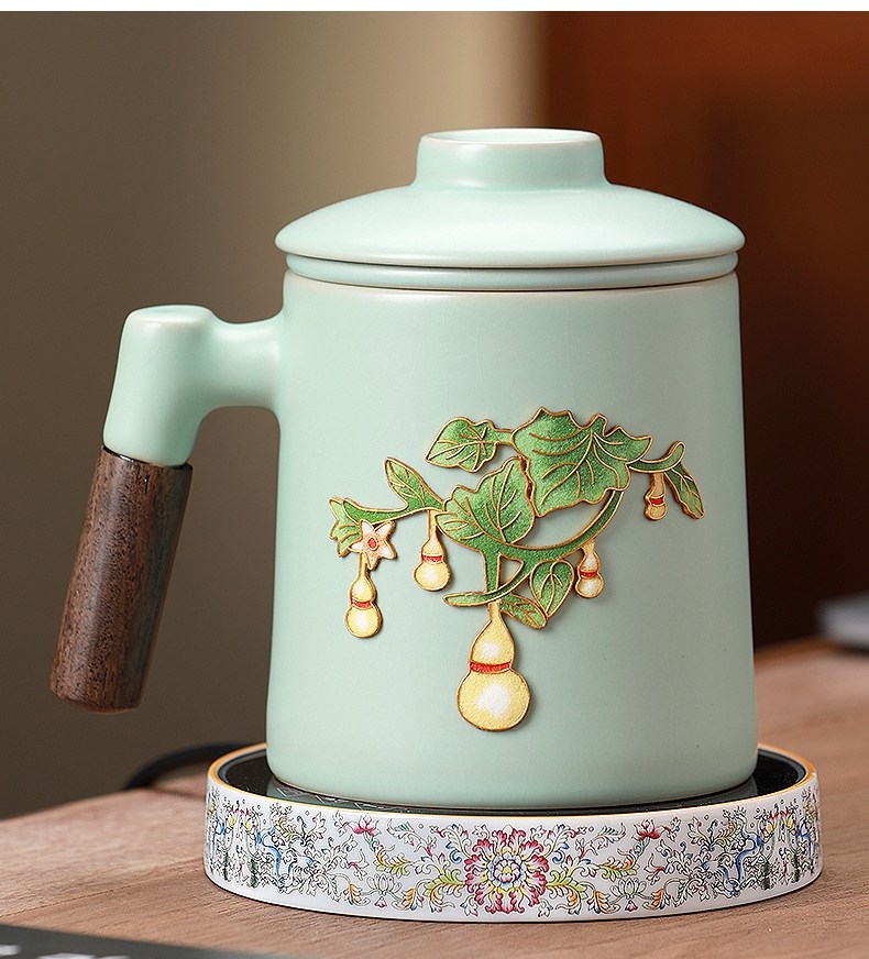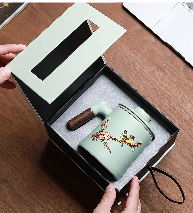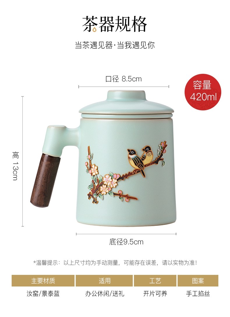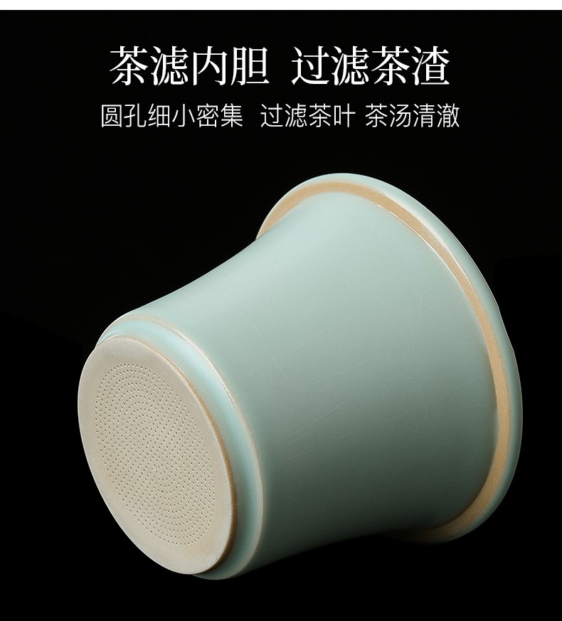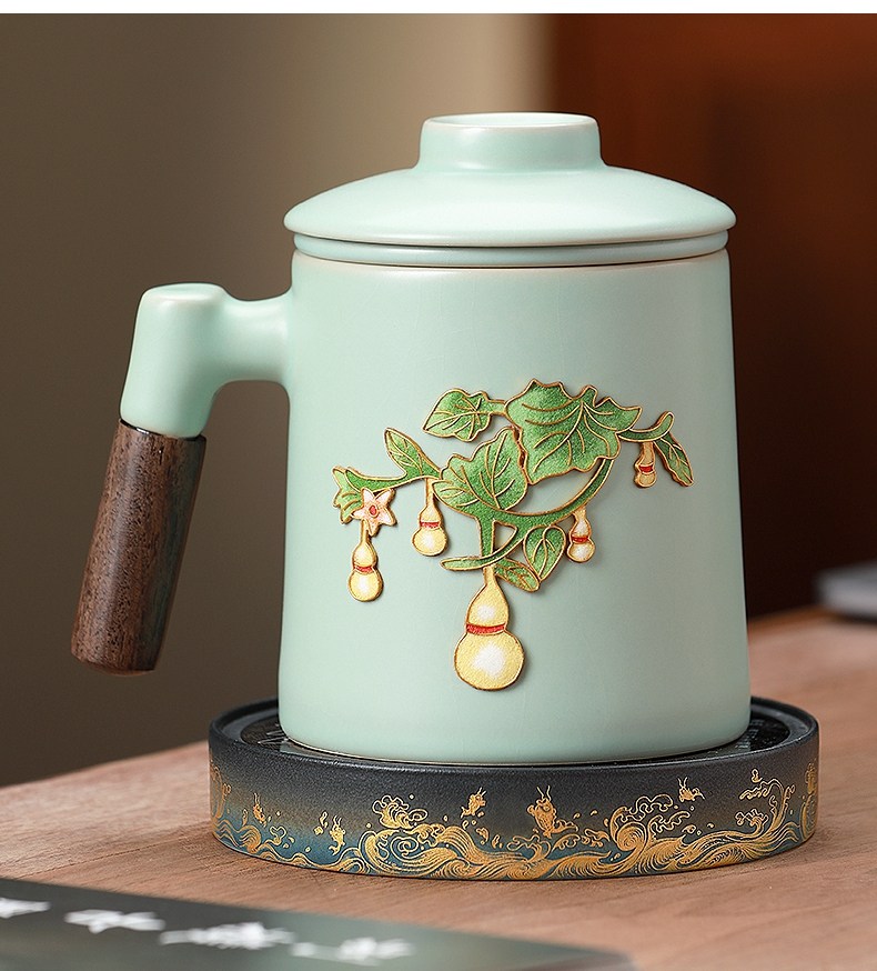 Ru Kiln Cloisonné Filigree Wooden Lid Filter Ceramic Tea Cup, Tea-Water Separation, Personal Use, Office and Home Use Tea Brewing Cup