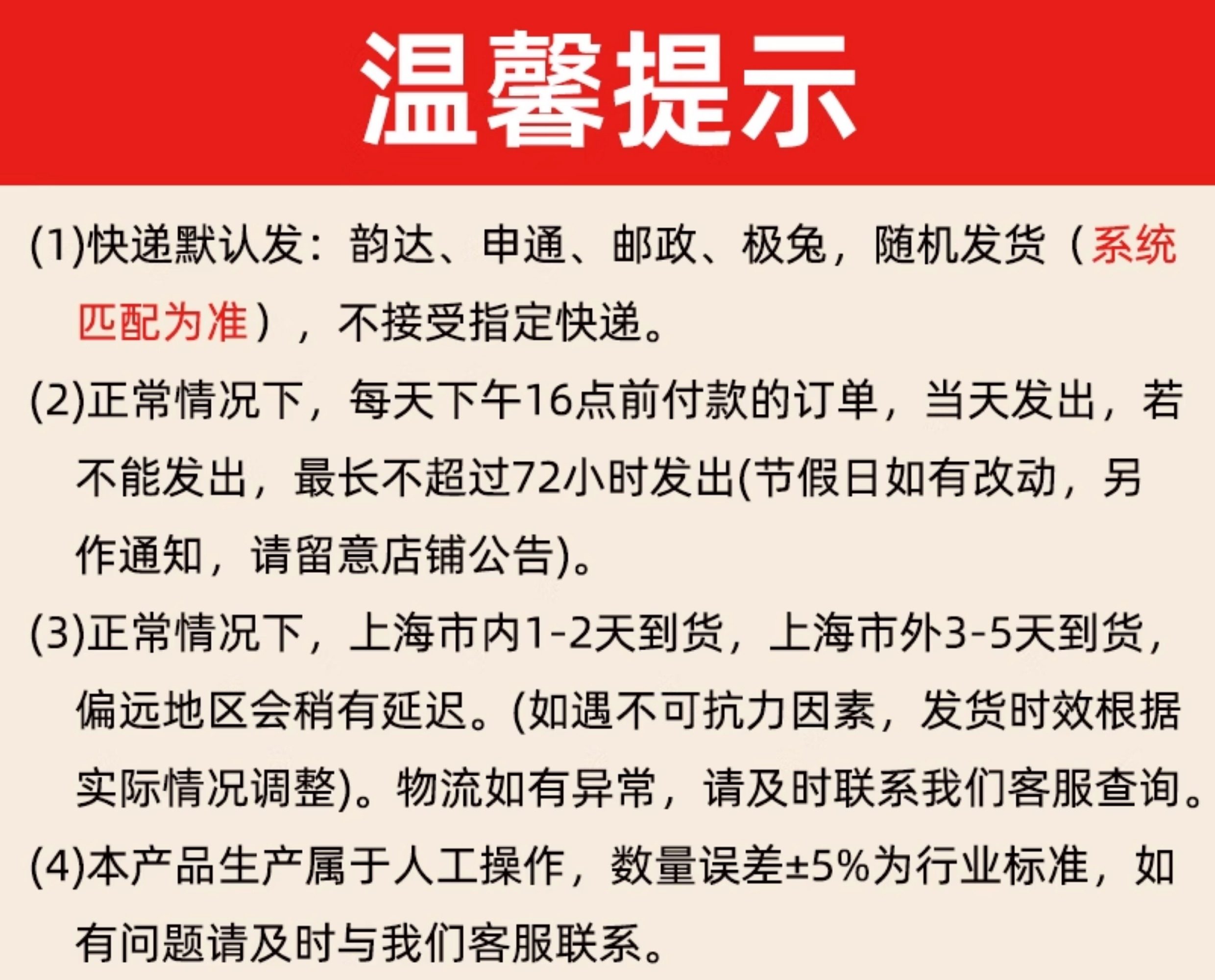 2)Die Versandkosten werden normalerweise pro 0,5KG berechnet. Wenn Sie also ein Produkt kaufen, das nur 0,1KG wiegt, sollten Sie in Erwägung ziehen, 2-3 Stück auf einmal zu kaufen, was die Versandkosten für Ihre Bestellung nicht erhöht.