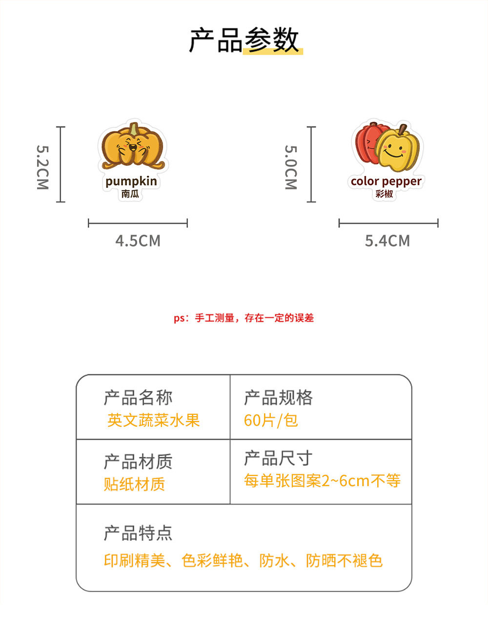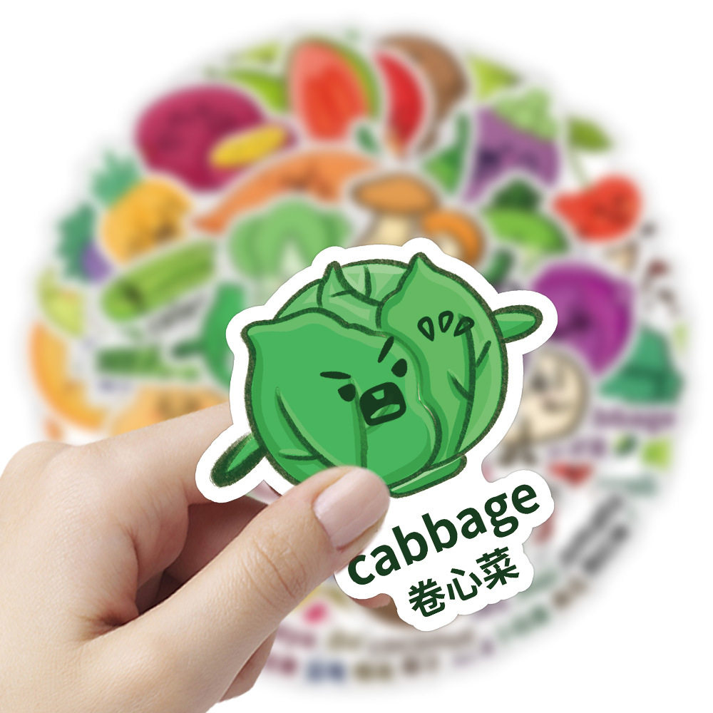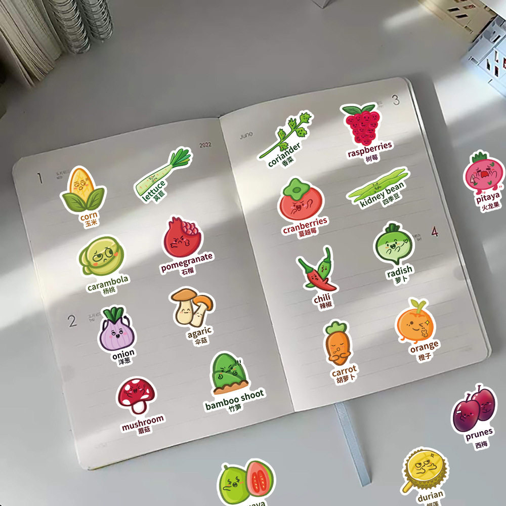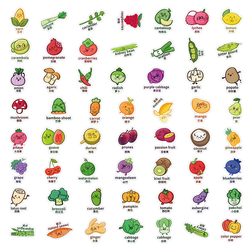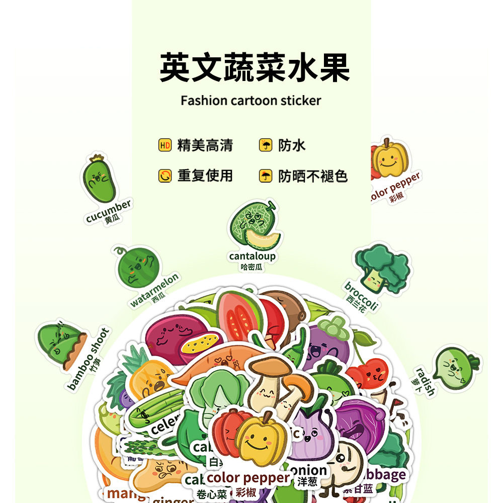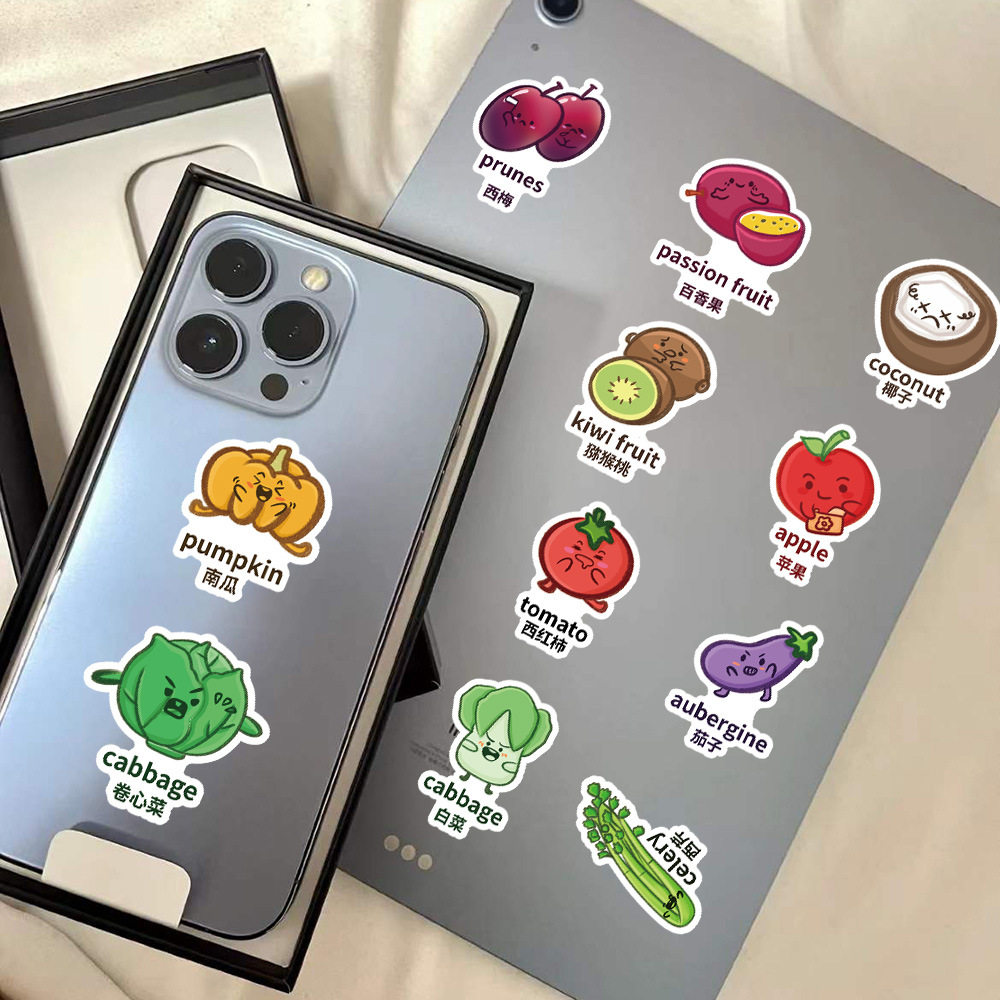 120张卡通英文蔬菜水果封口贴纸 行李箱手机手账装饰防水无痕贴画