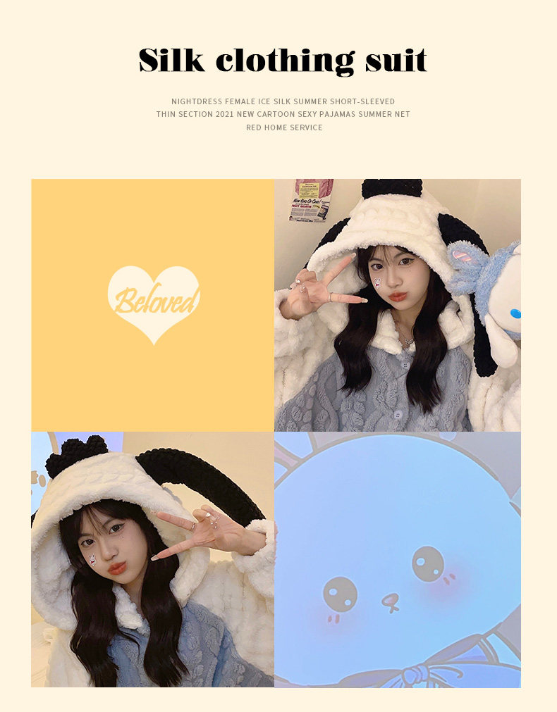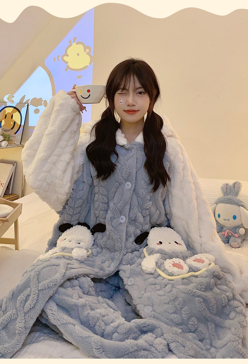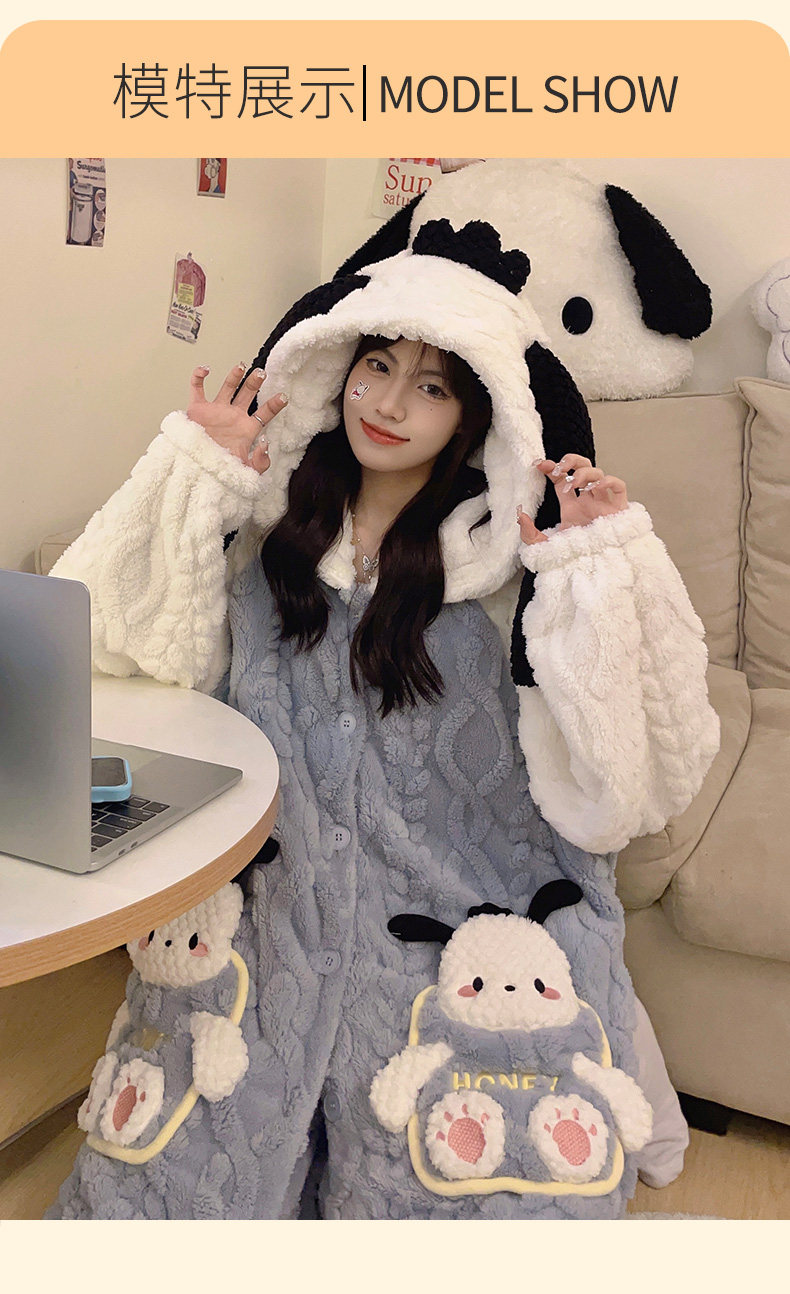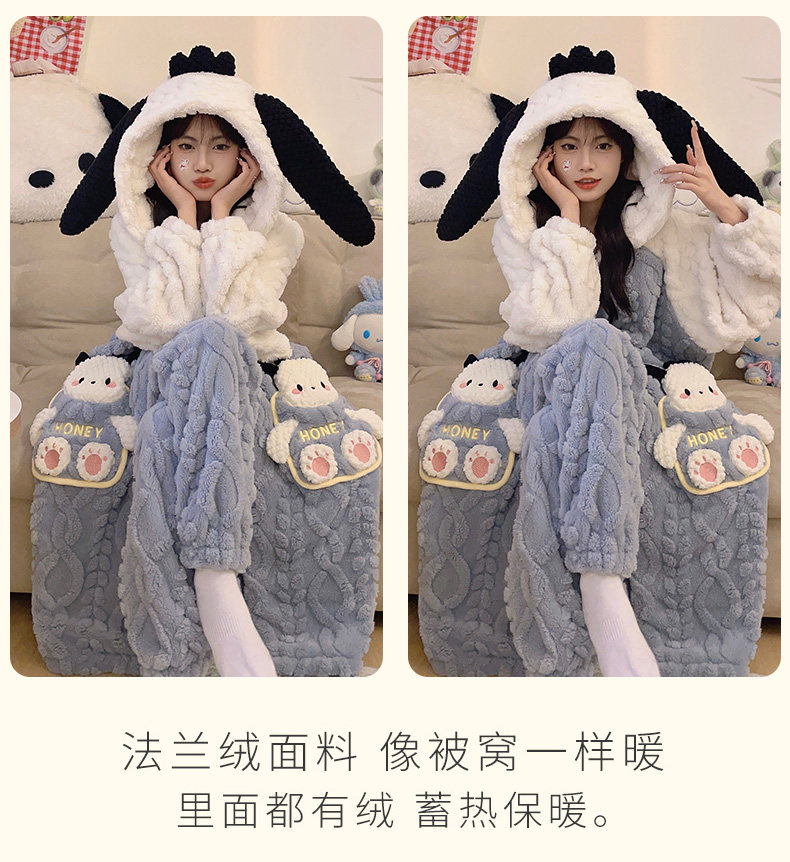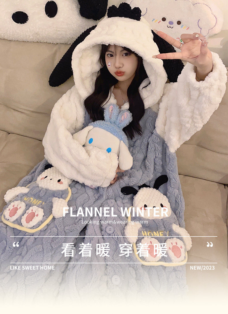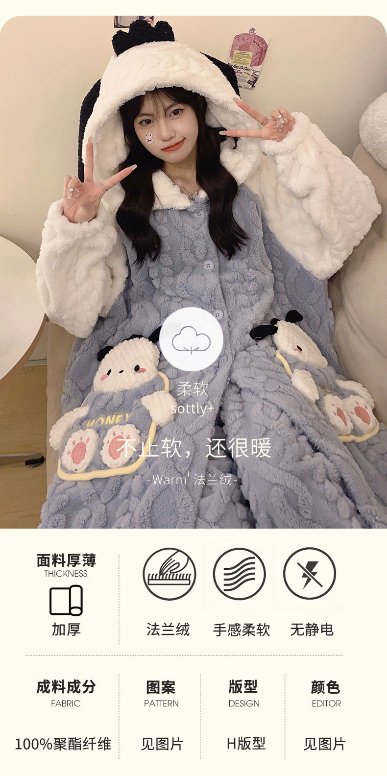 Verdickter Korallensamt-Pyjama für Damen im Herbst und Winter, süßes, warmes, mittellanges Flanell-Pyjama-Set mit Kapuze und Pacha-Hund