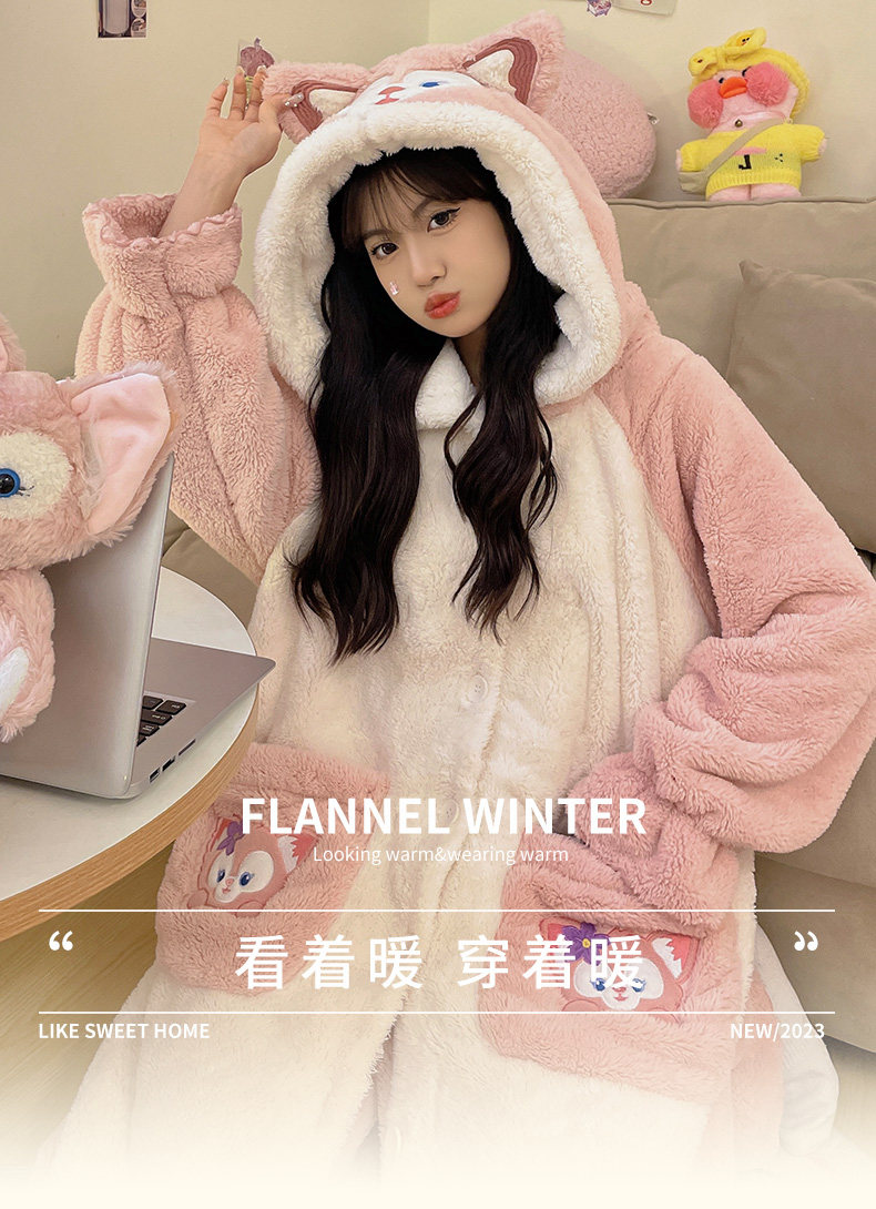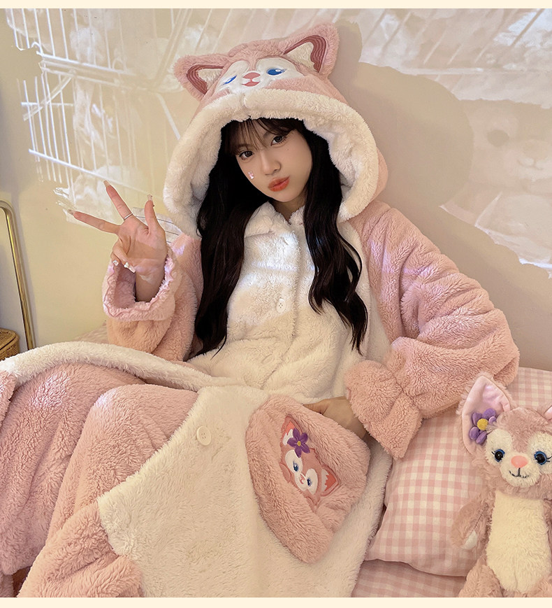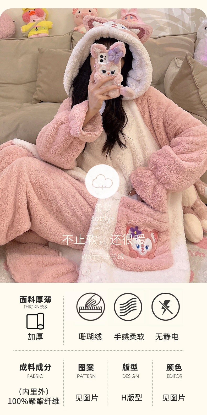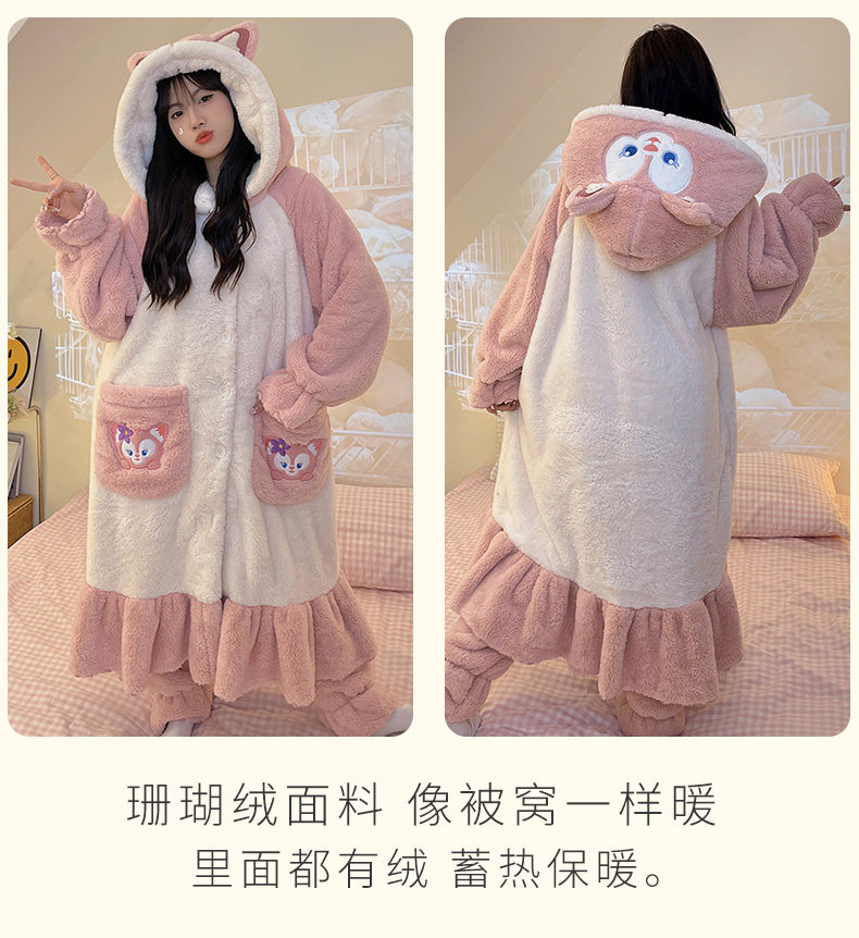 加厚珊瑚绒睡衣女秋冬季可爱小狐狸保暖中长款法兰绒连帽睡袍套装
