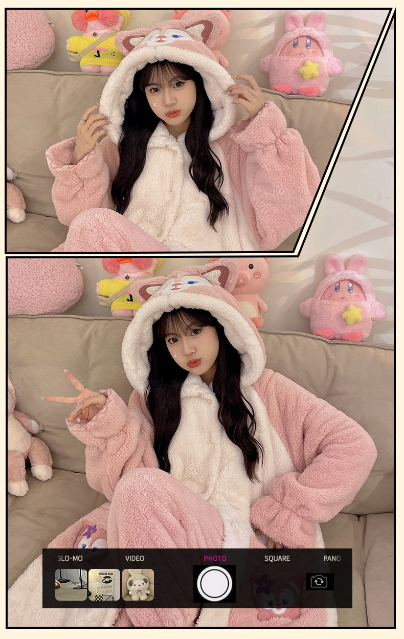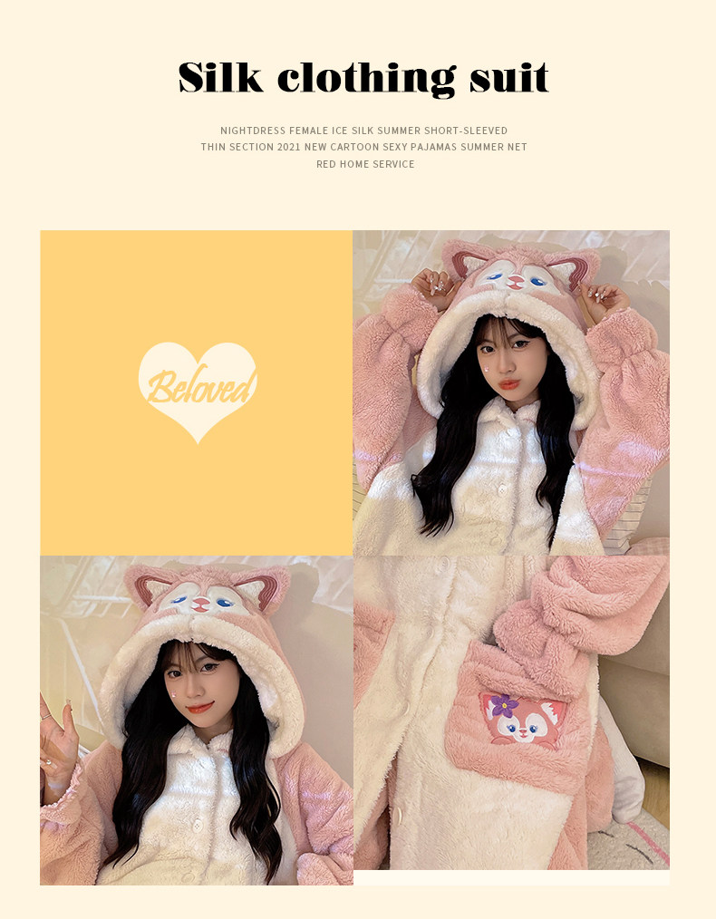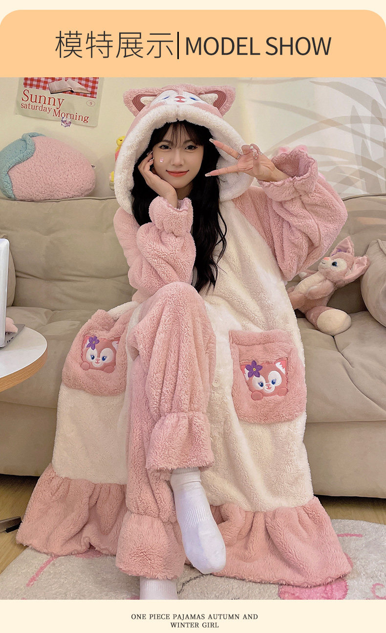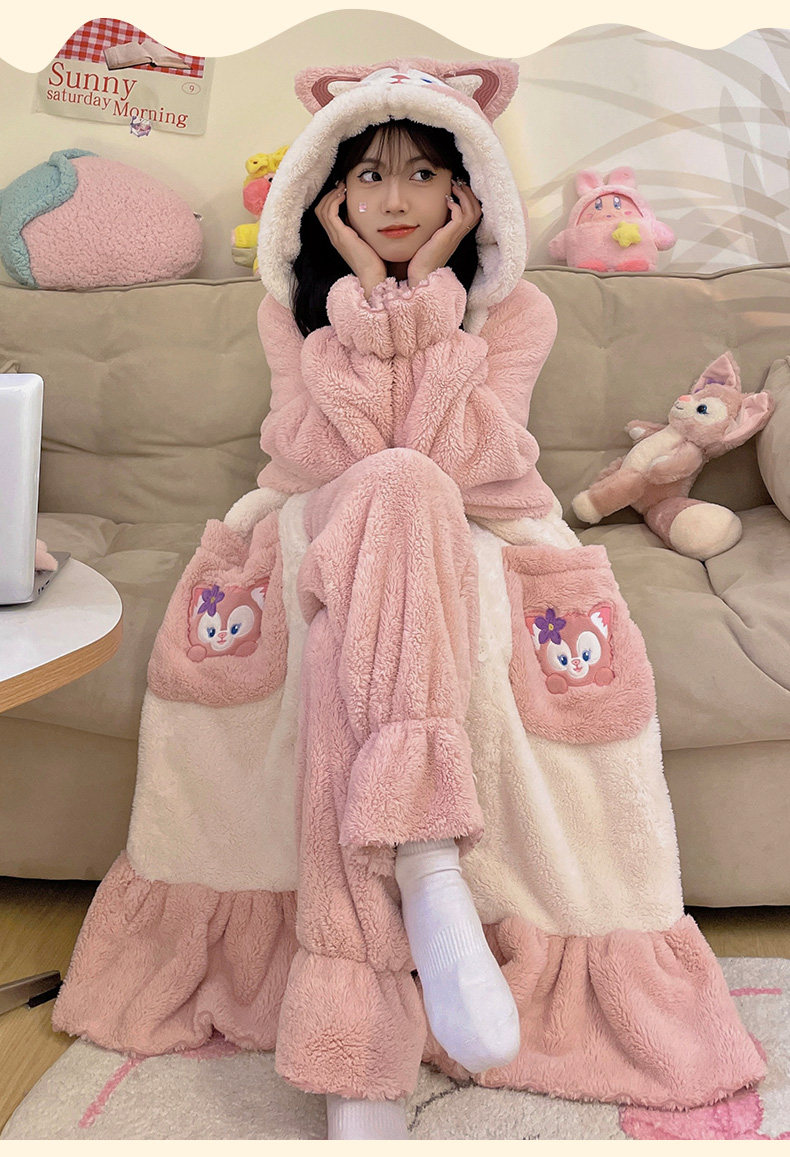 加厚珊瑚绒睡衣女秋冬季可爱小狐狸保暖中长款法兰绒连帽睡袍套装