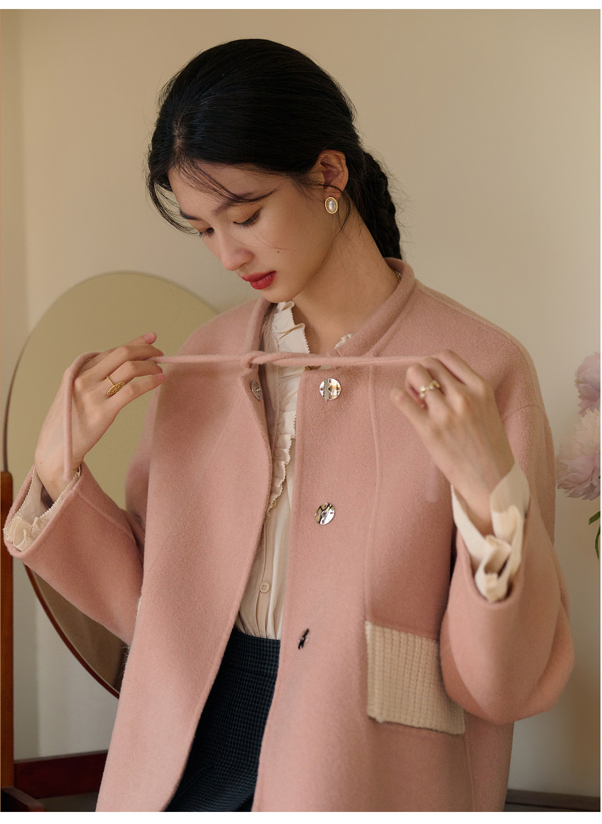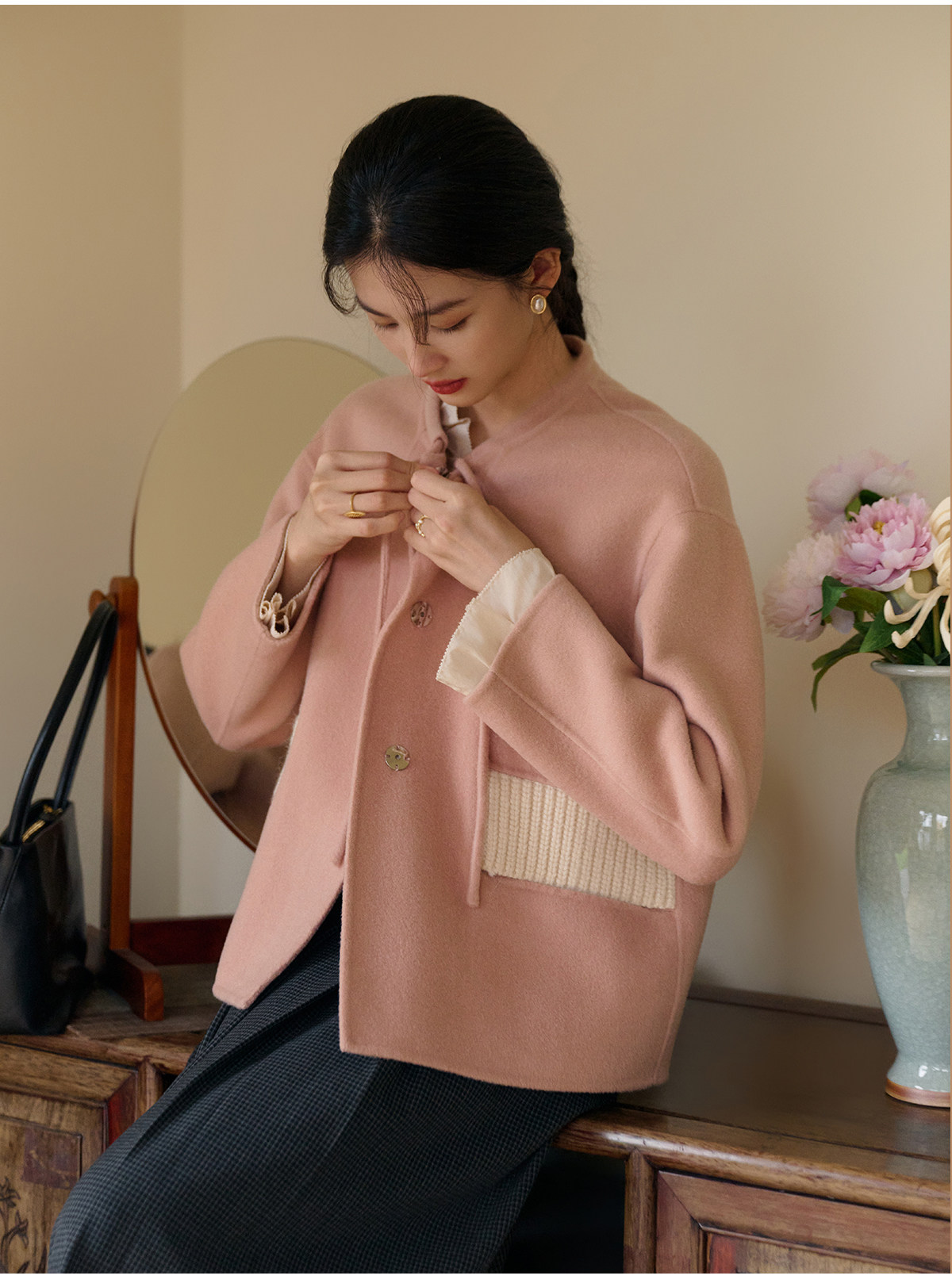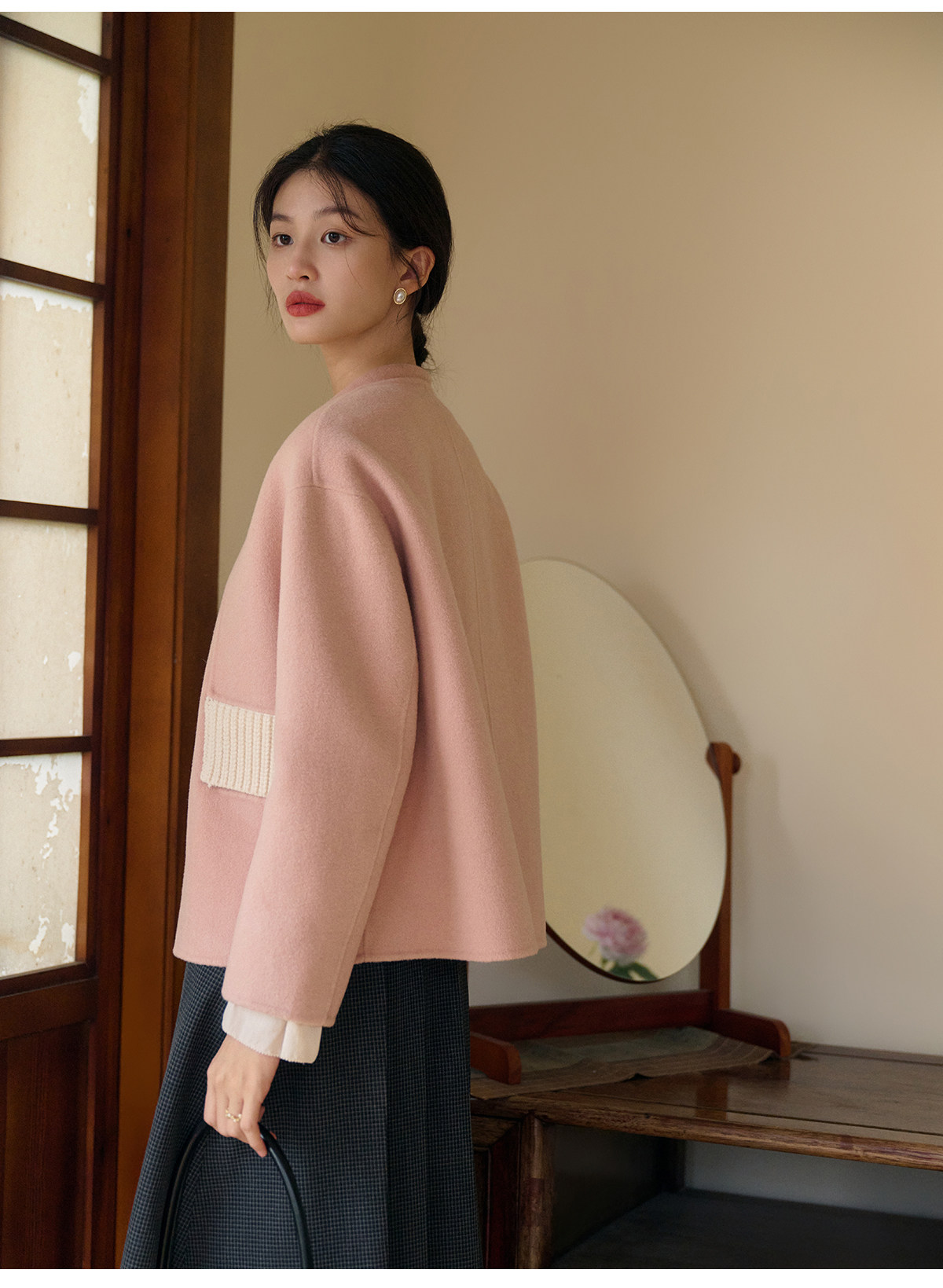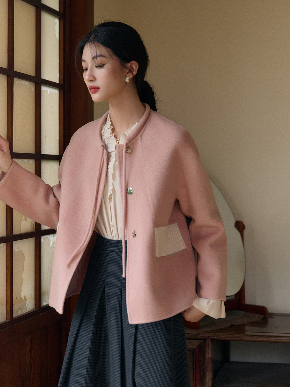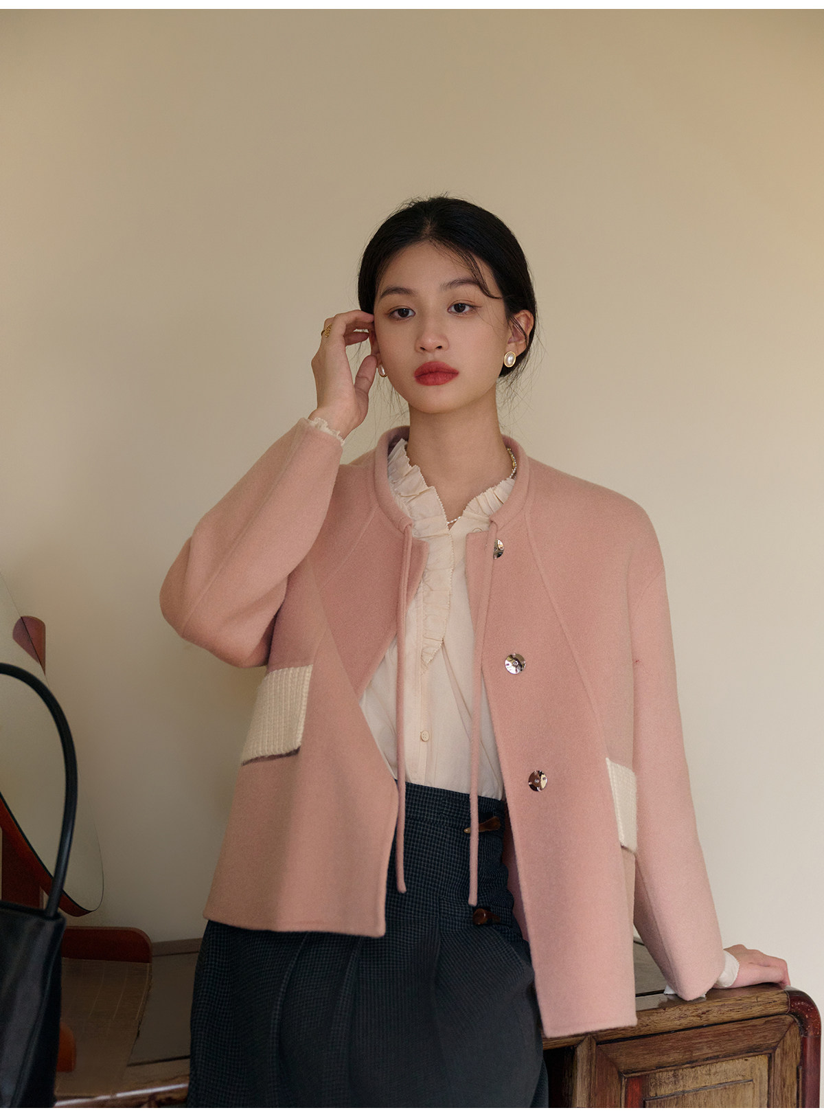 Simpleretro Pink Letter Paper Color-Blocked Wool Pocket Woolen Coat for Women, Autumn and Winter Short Wool Coat