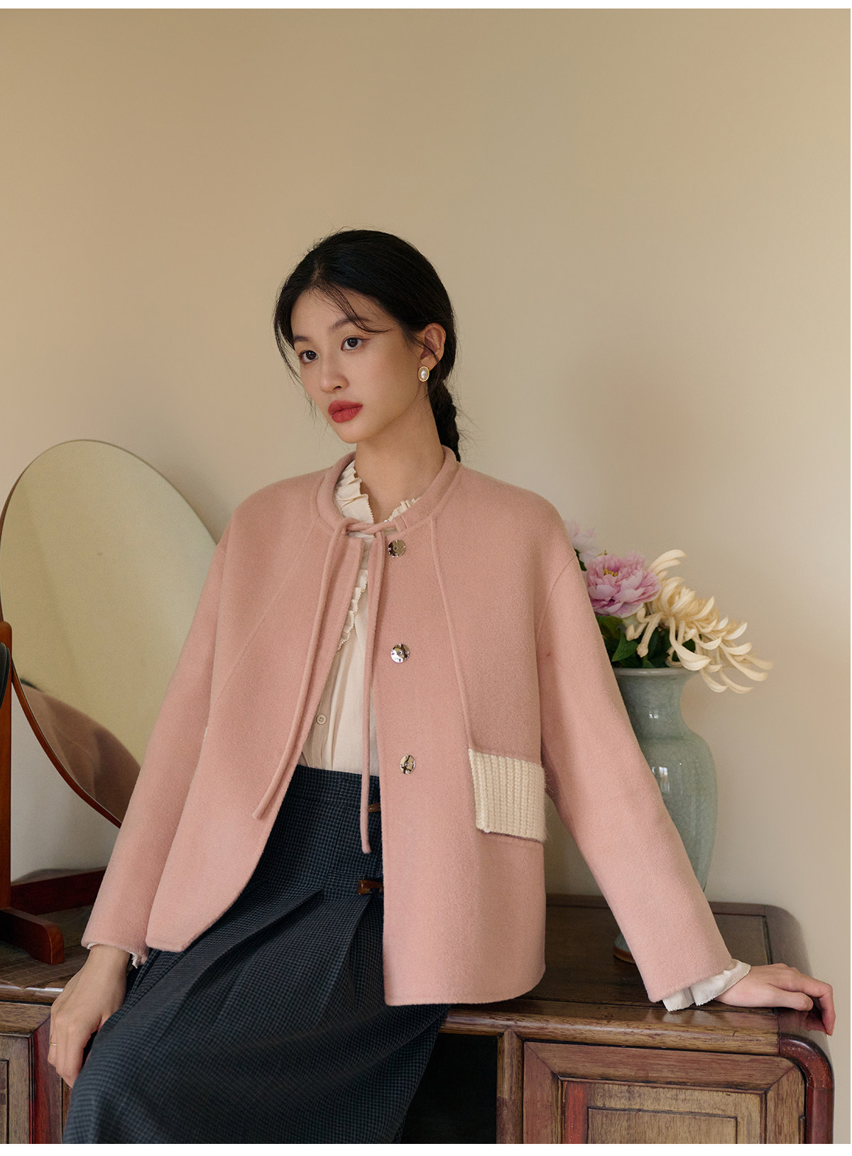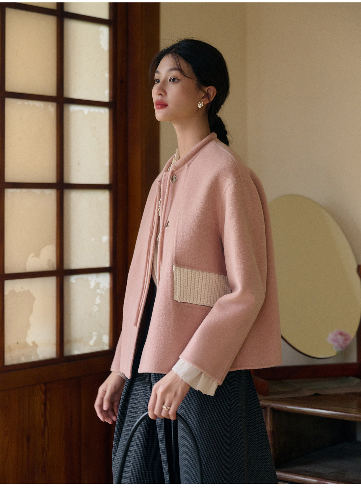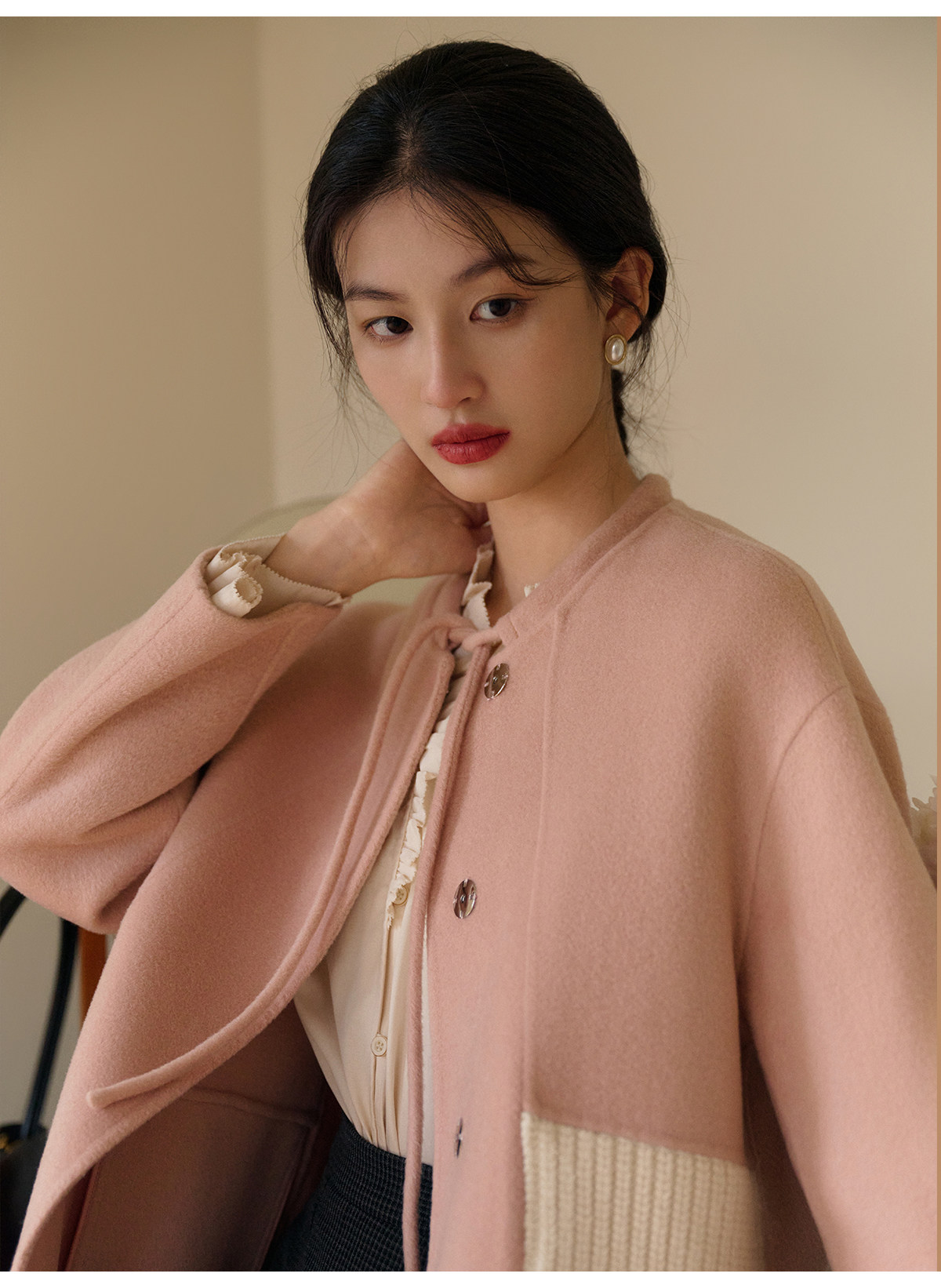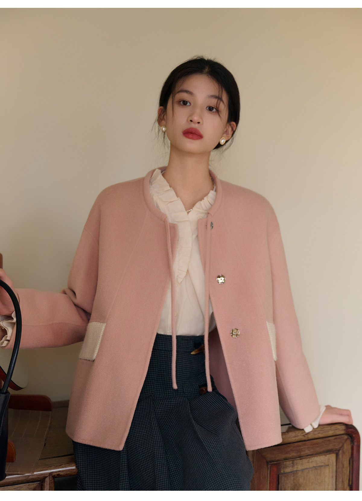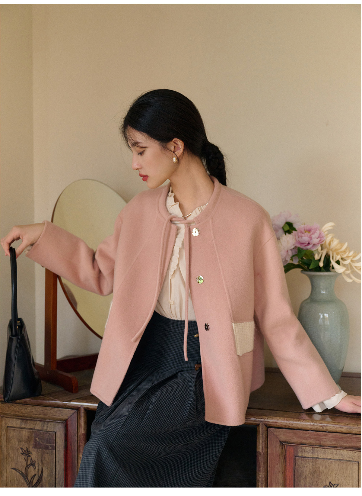 Simpleretro Pink Letter Paper Color-Blocked Wool Pocket Woolen Coat for Women, Autumn and Winter Short Wool Coat