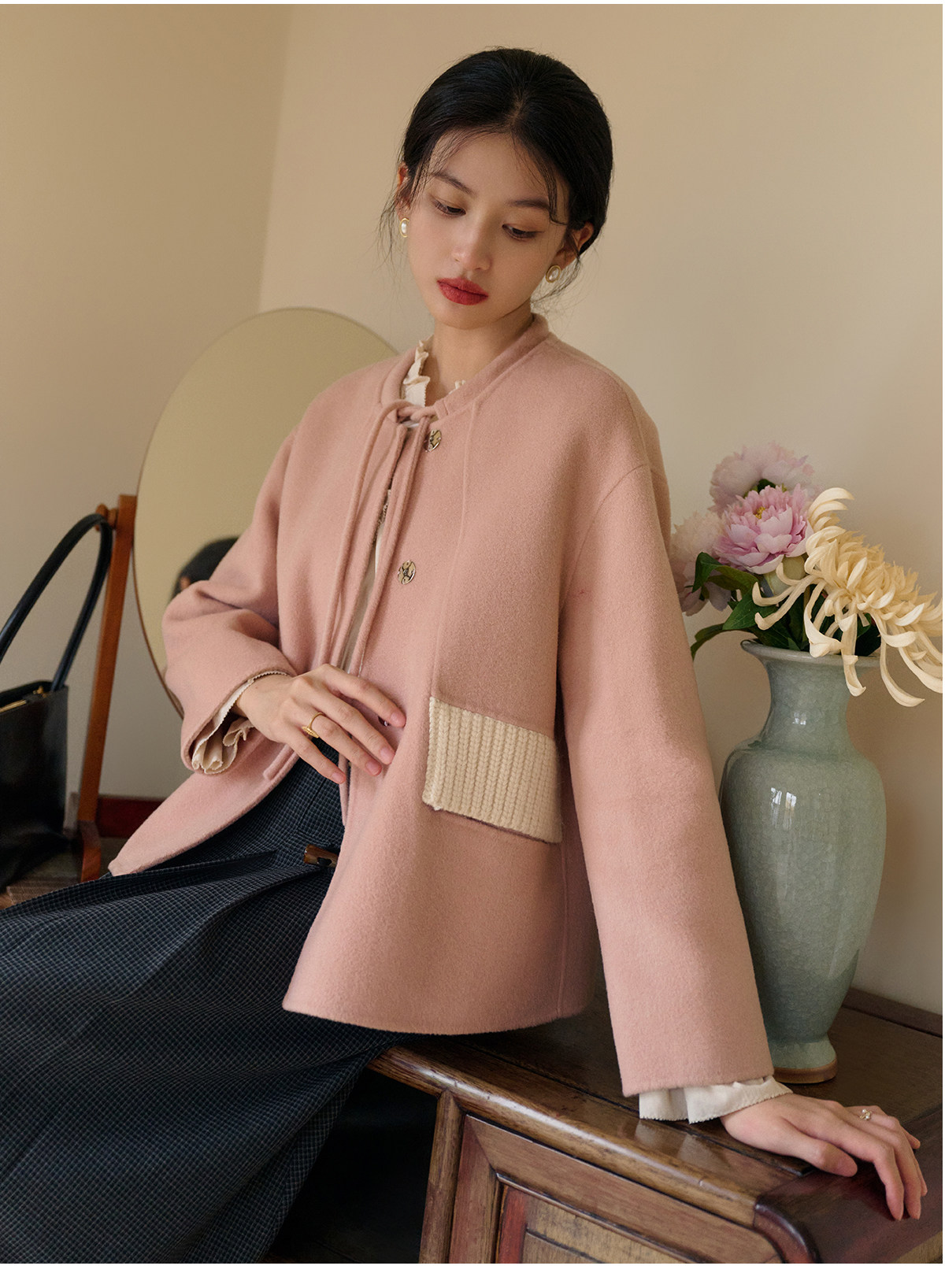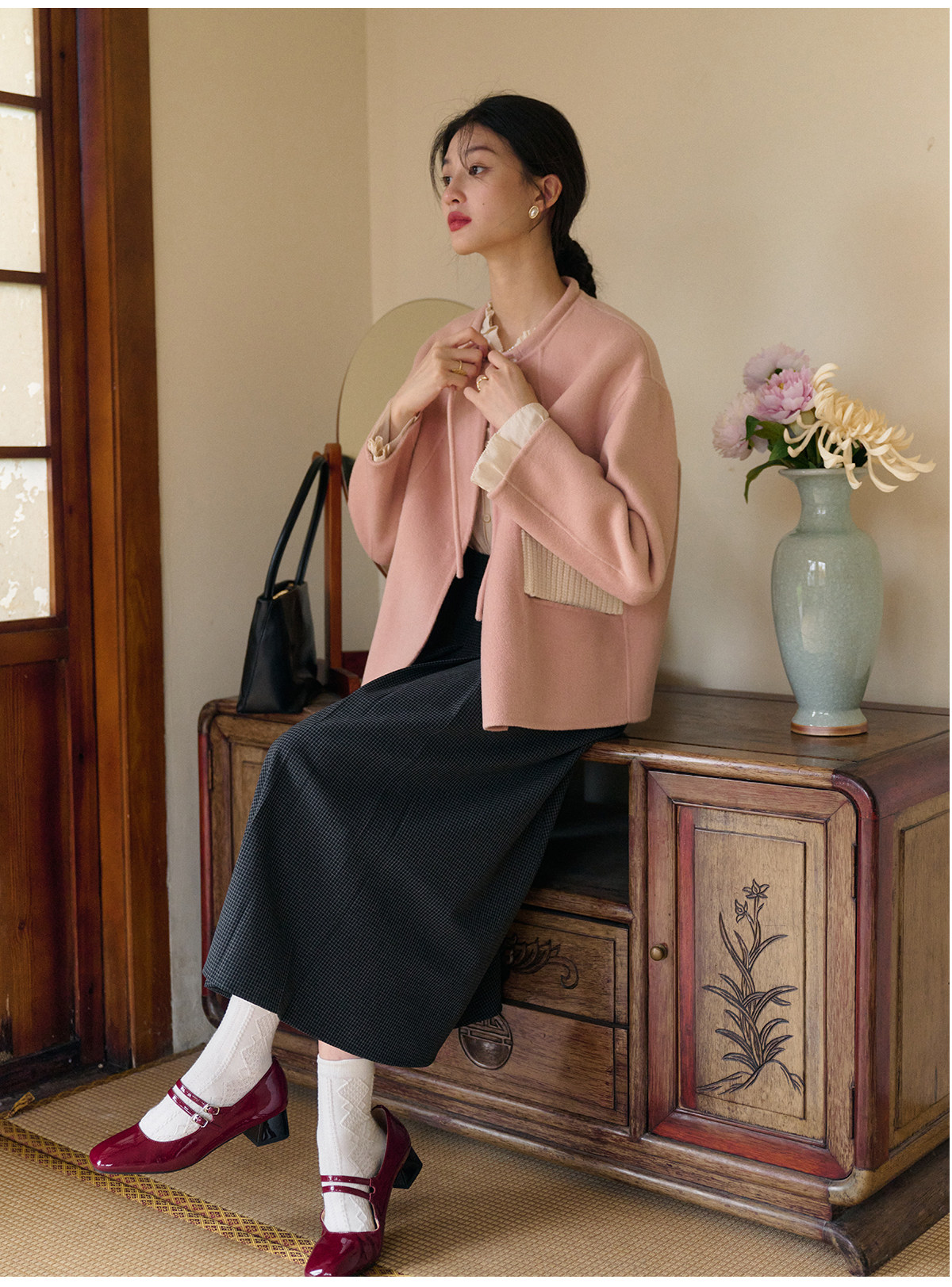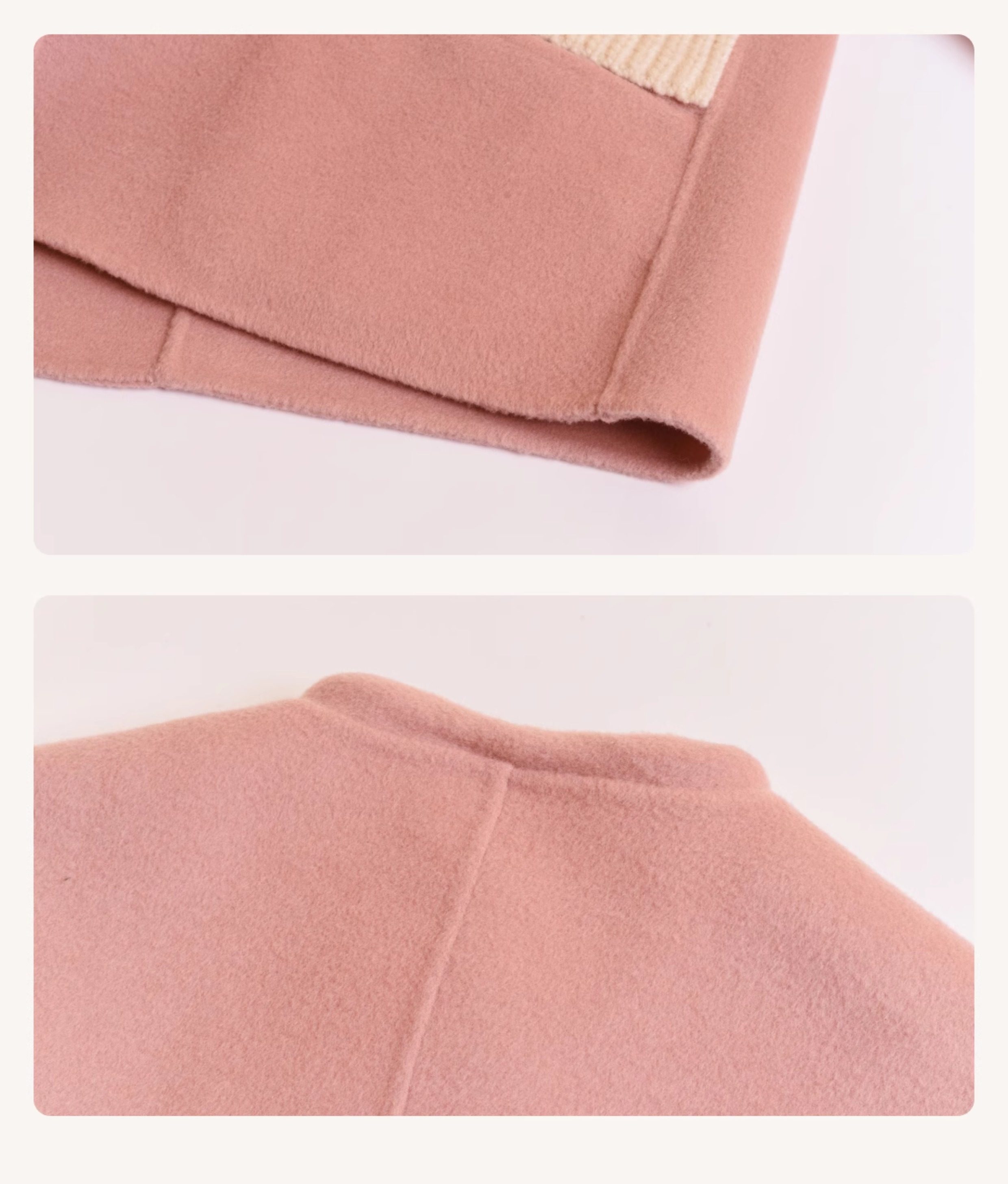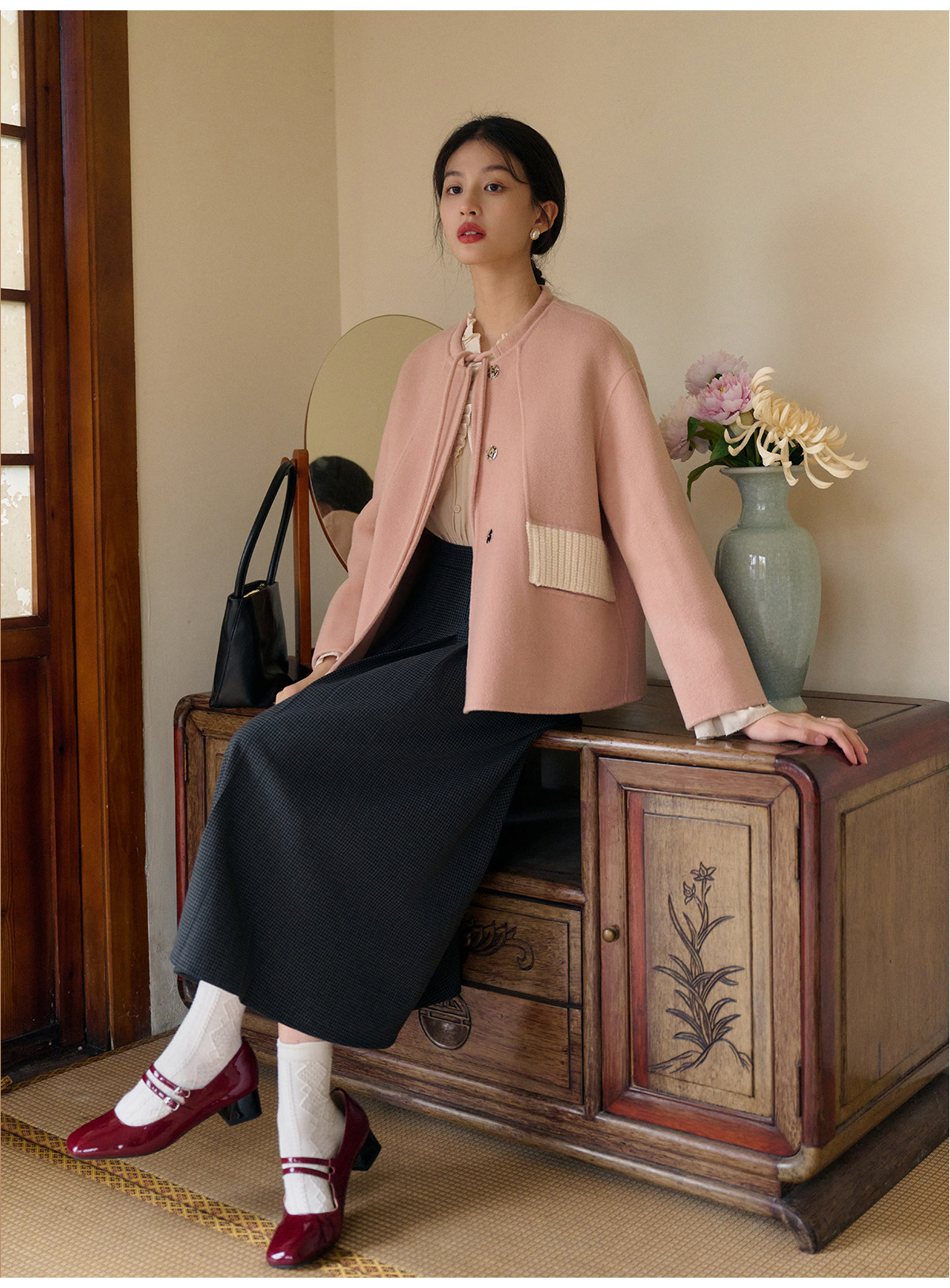 Simpleretro Pink Letter Paper Color-Blocked Wool Pocket Woolen Coat for Women, Autumn and Winter Short Wool Coat
