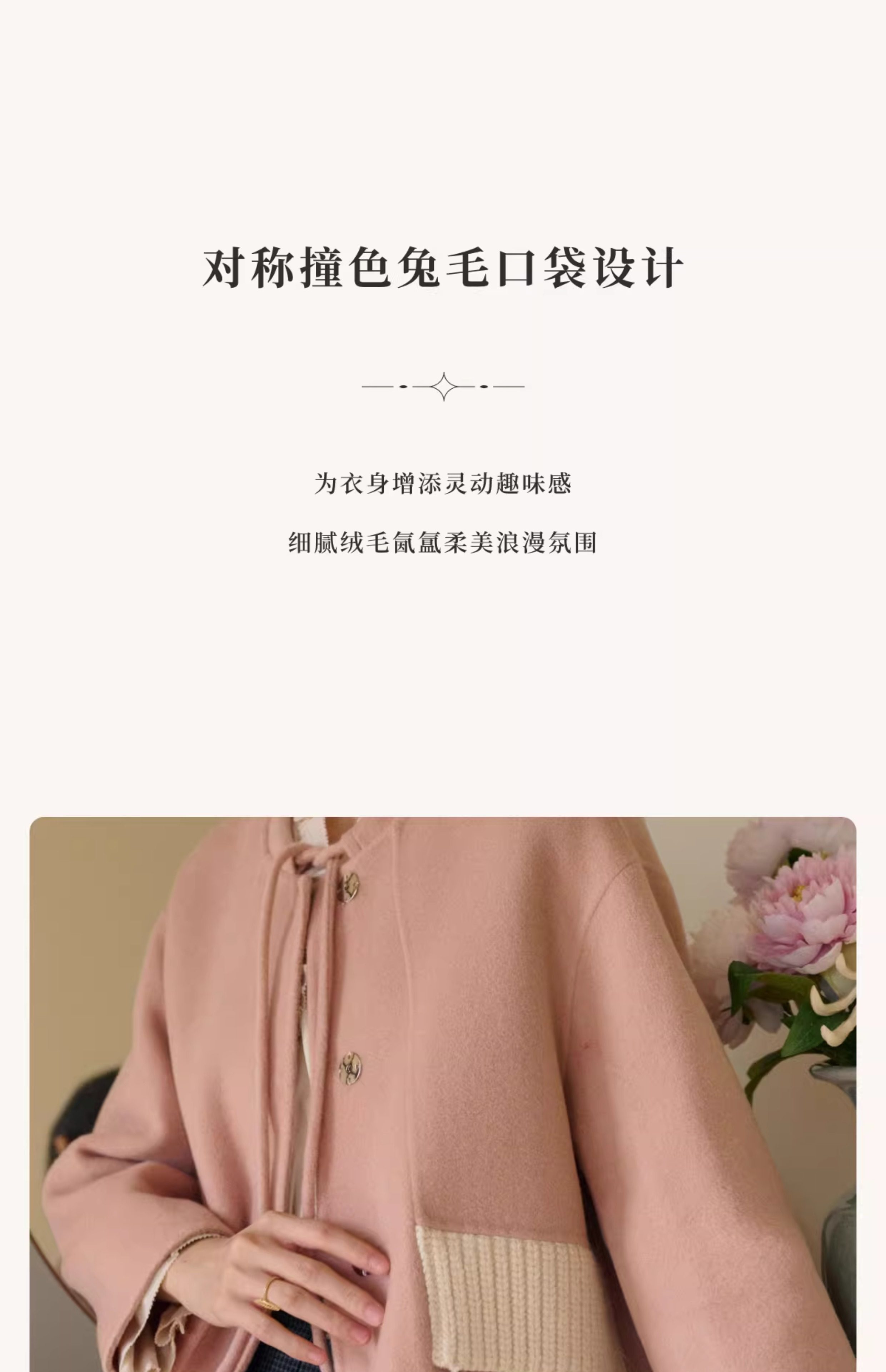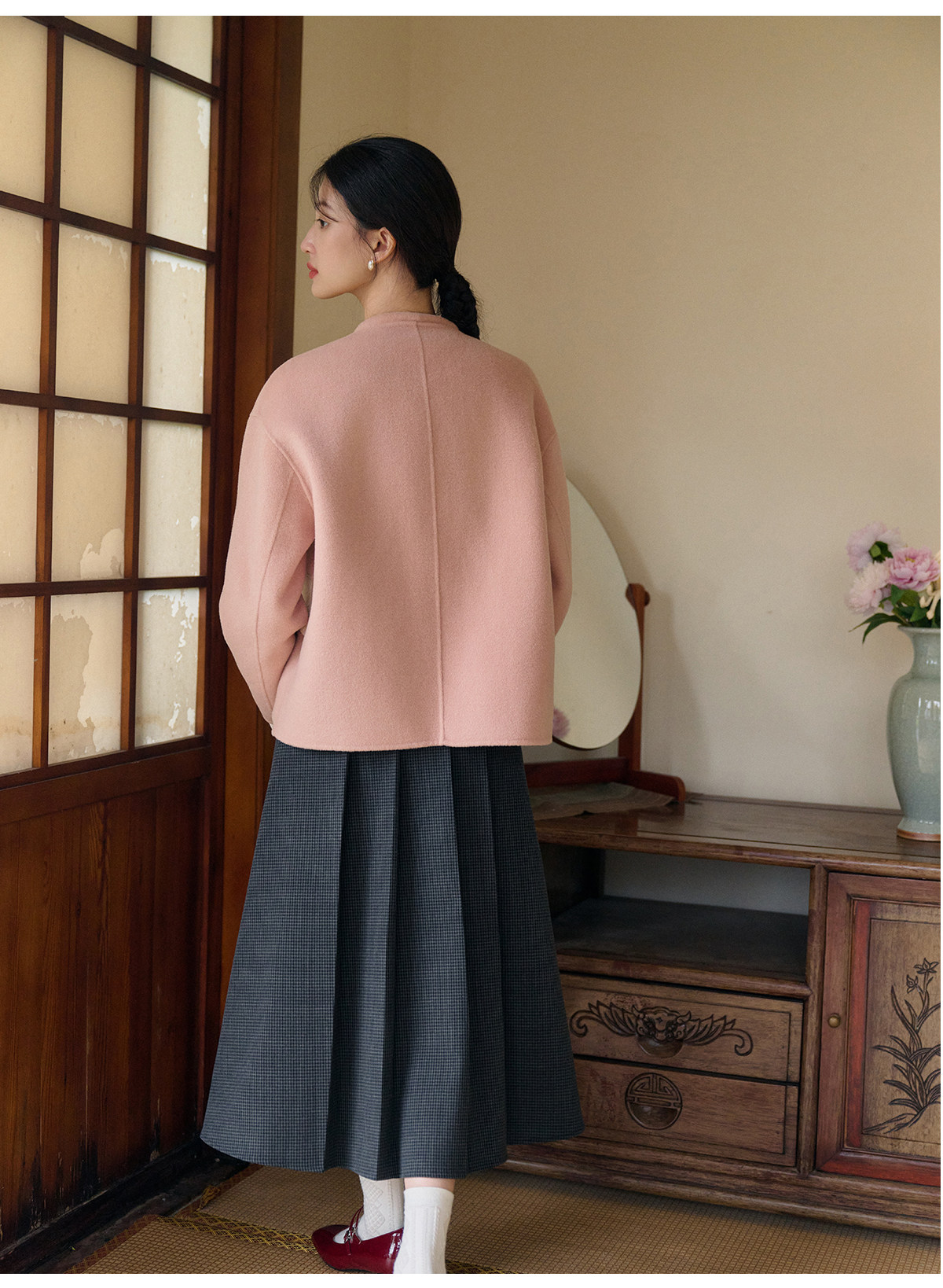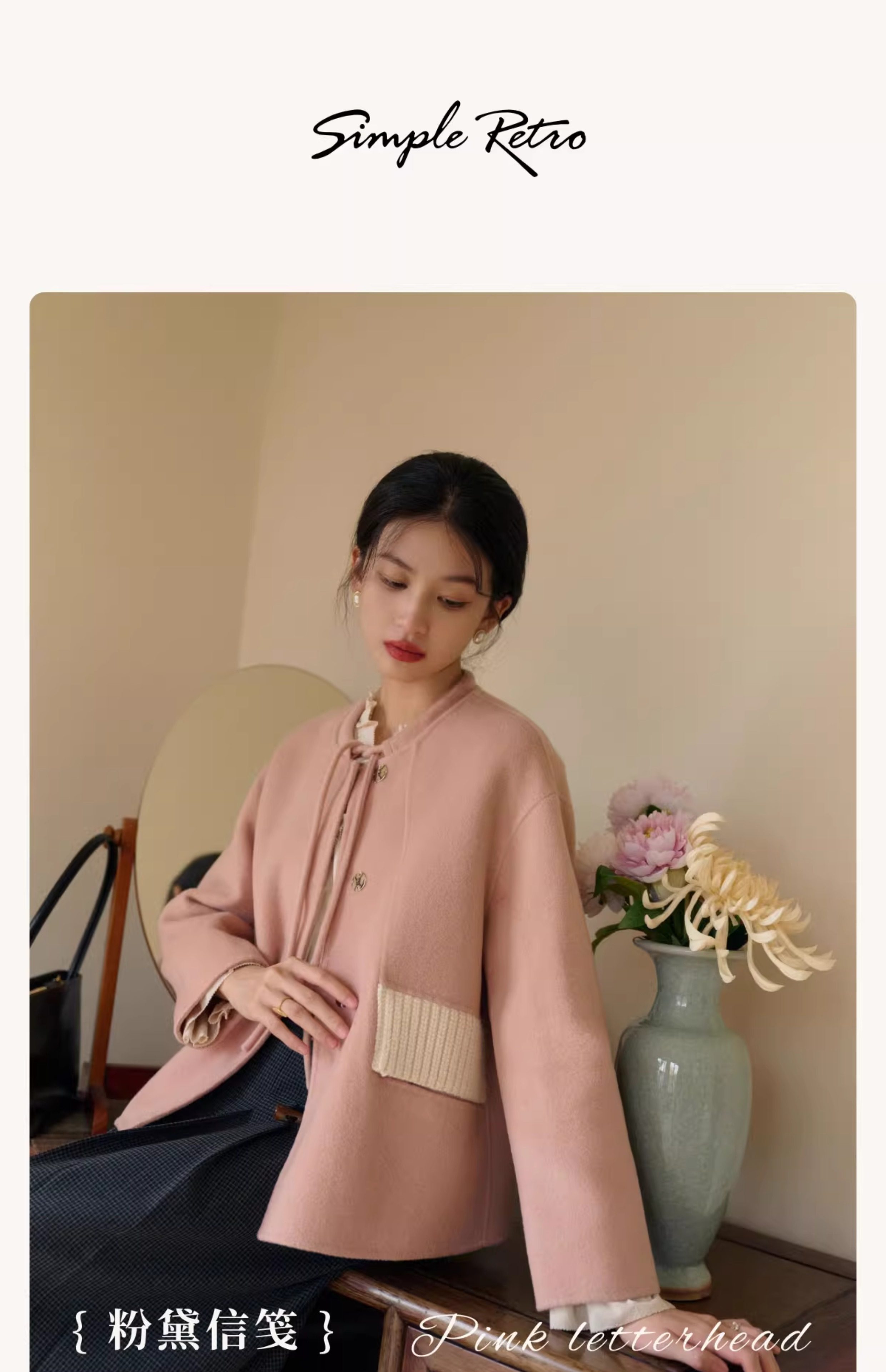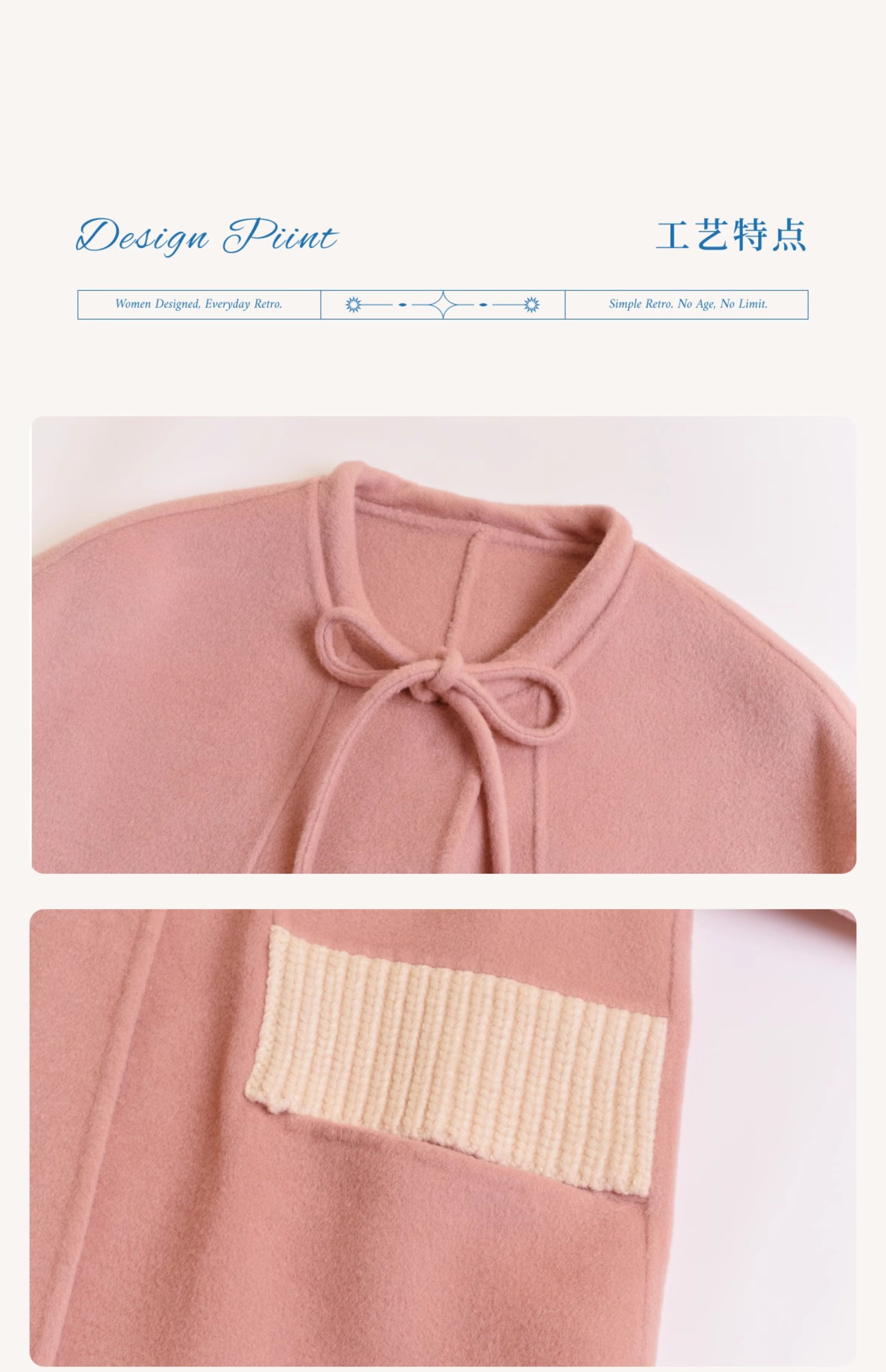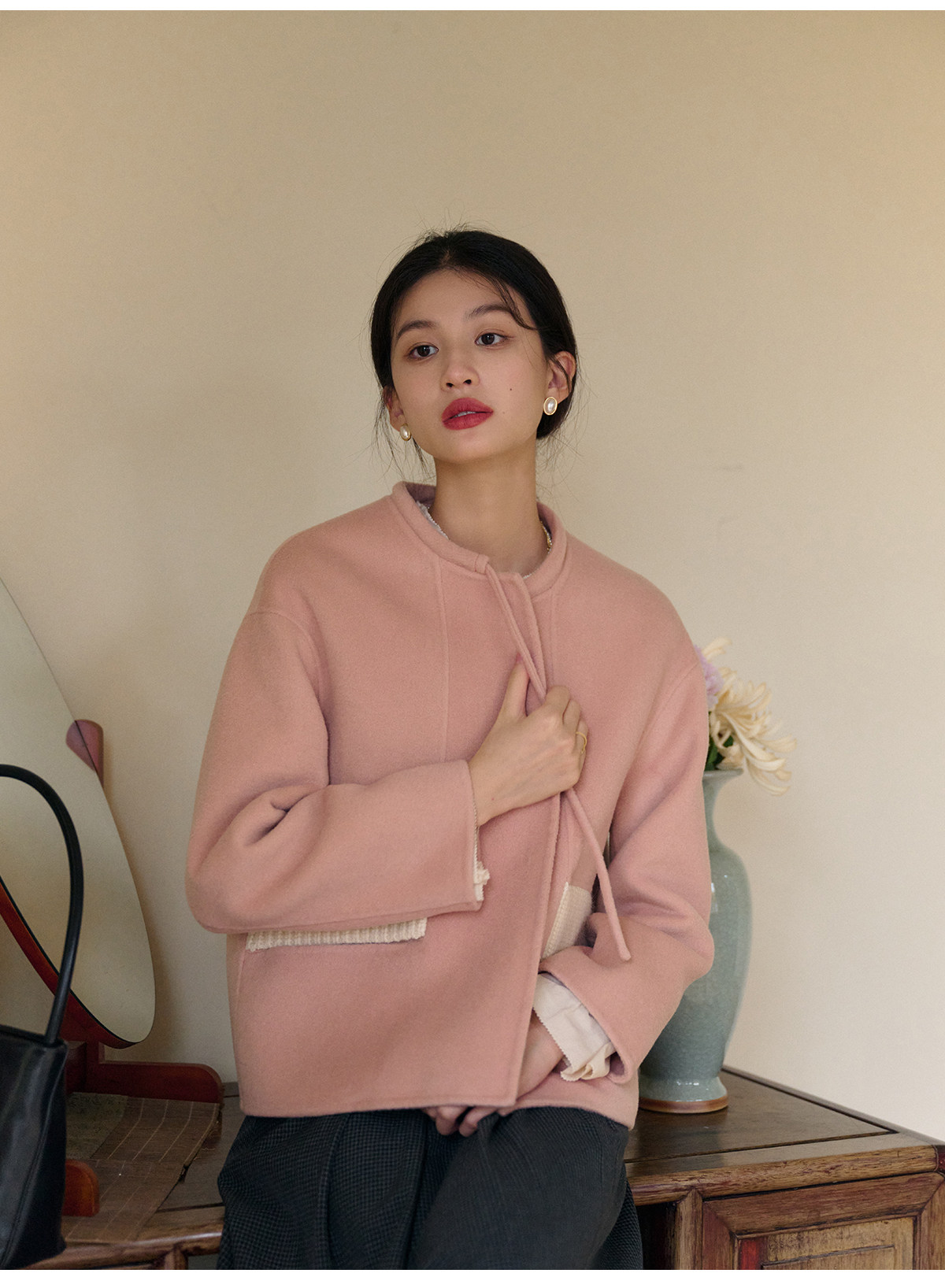 Simpleretro Pink Letter Paper Color-Blocked Wool Pocket Woolen Coat for Women, Autumn and Winter Short Wool Coat